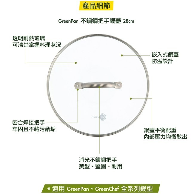 GreenPan 不鏽鋼把手鍋蓋28cm 不挑爐具/廚房配件/適用GreenPan、GreenChef全系列鍋型【單件】不鏽鋼把手鍋蓋28cmPansGreenPan 官方旗艦店
