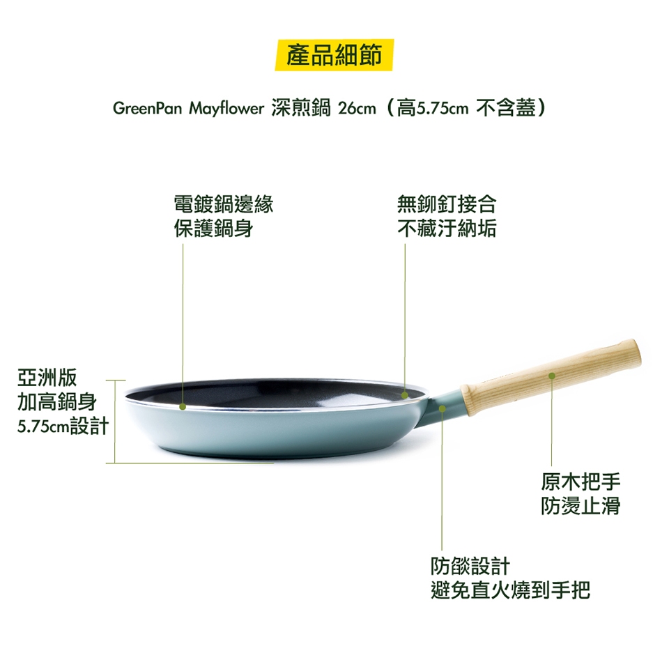 GreenPan 鑽石陶瓷塗層不沾深煎鍋 Mayflower 26cm 高5.75cm 不含蓋 不挑爐具/IH爐適用【單件】深煎鍋26cm(不含蓋)|【限時特賣】PansGreenPan 官方旗艦店