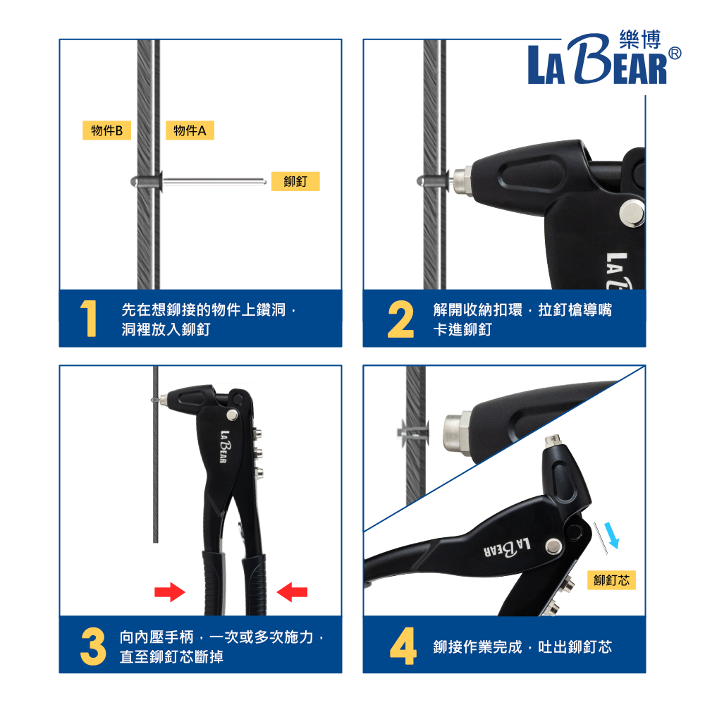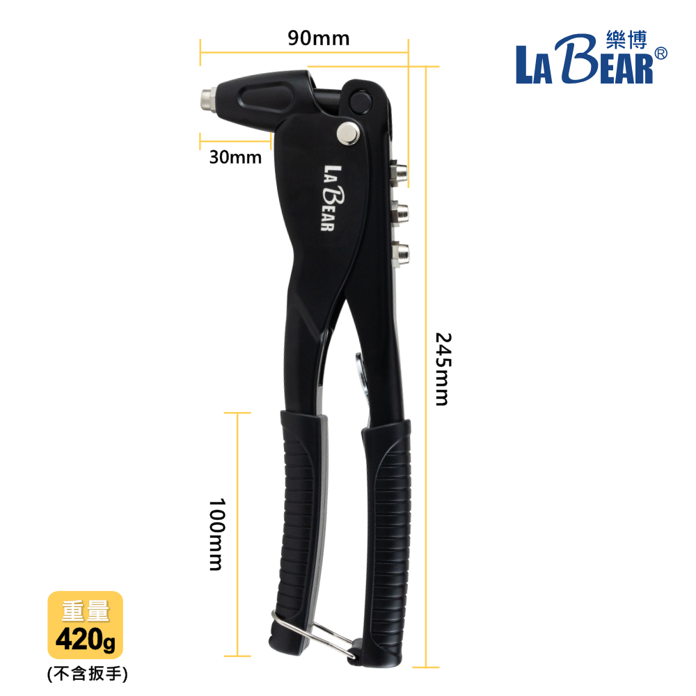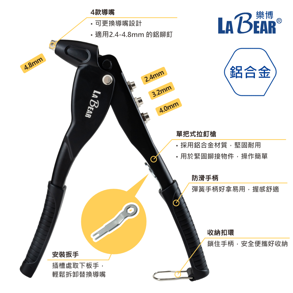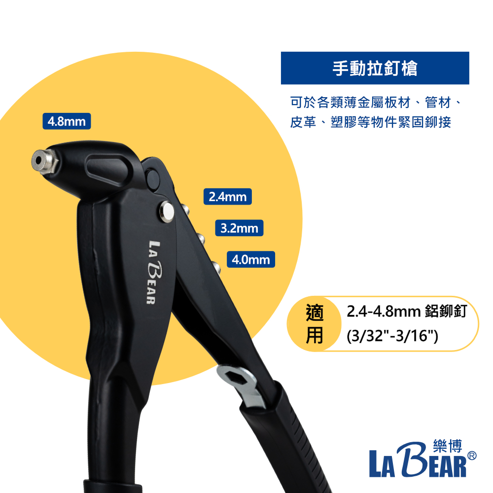 【LaBear】手動拉釘槍 鉚釘槍 拉鉚槍單把拉釘槍 拉釘槍 附4款導嘴 2.4-4.8mm 快速拉釘 台灣製手動拉釘槍ToolsLaBear 樂博工具