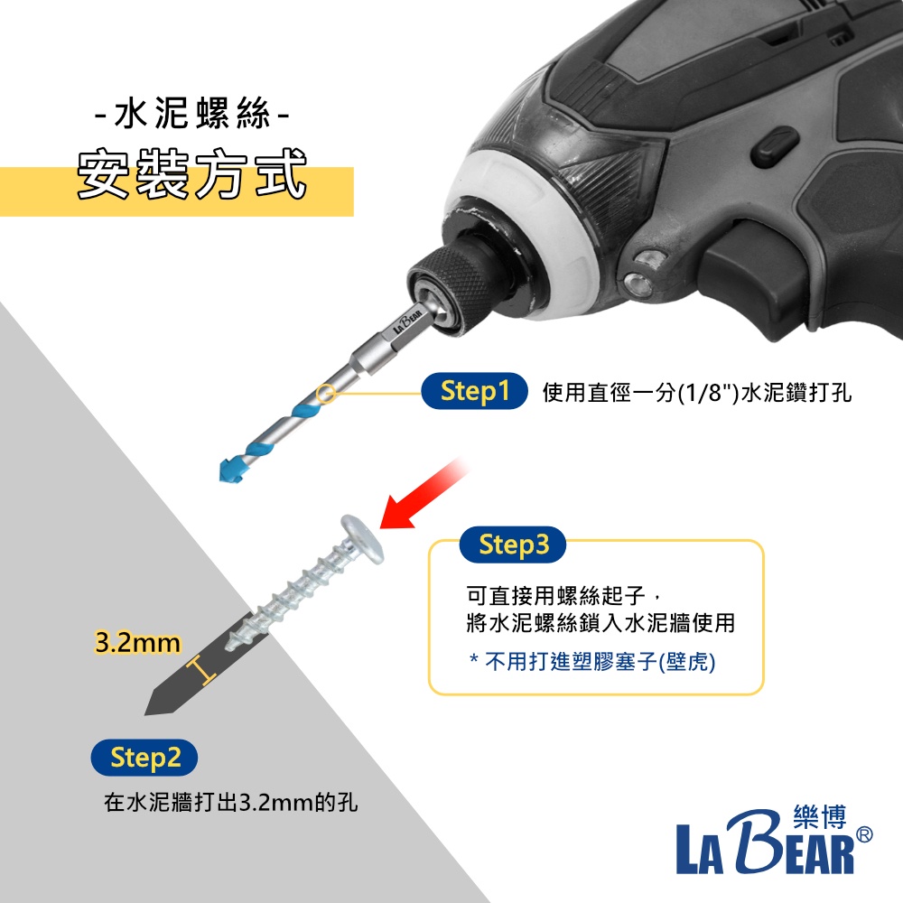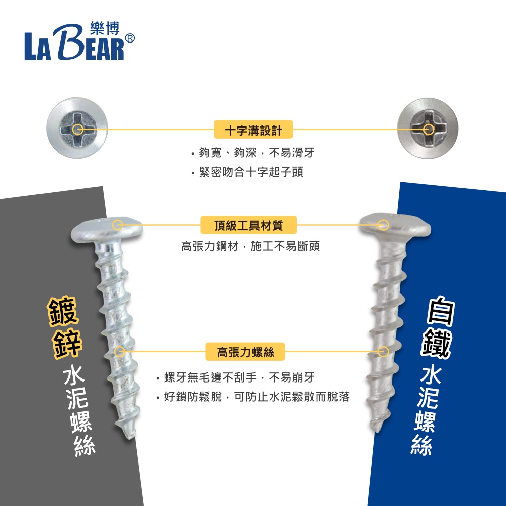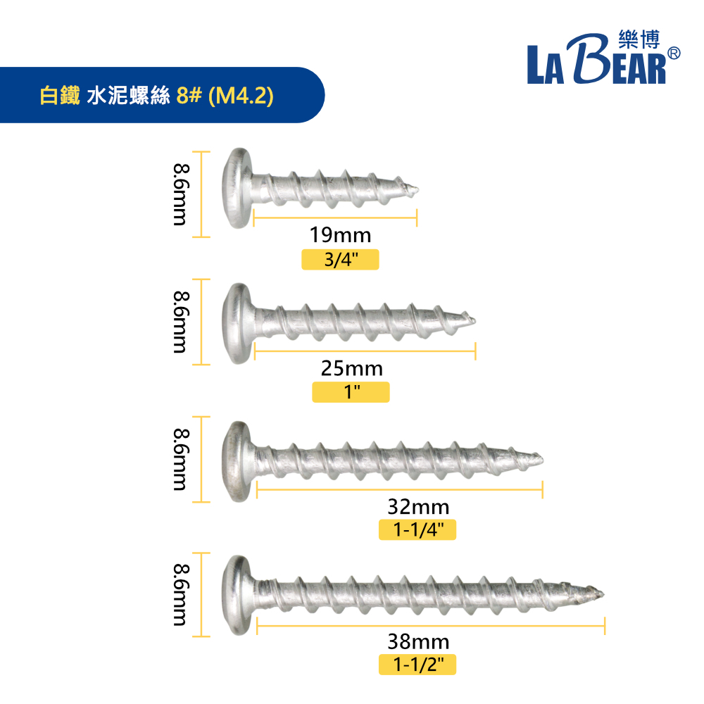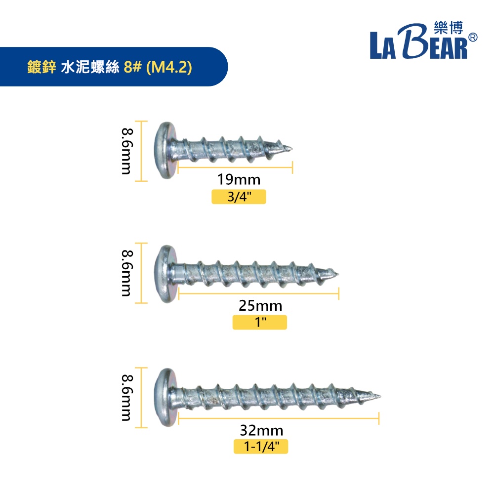 【LaBear】水泥螺絲 高張力螺絲 十字 8#(M4.2) 19-38mm 鍍鋅/白鐵 粗牙螺絲 鍍鋅螺絲 台灣製鍍鋅 3/4″(19mm) -2入|鍍鋅 1″(25mm) -3入|鍍鋅 1-1/4″(32mm) -1入|白鐵 3/4″(19mm) -2入|白鐵 1″(25mm) -2入|白鐵 1-1/4″(32mm) -2入|白鐵 1-1/2″(38mm) -2入ToolsLaBear 樂博工具