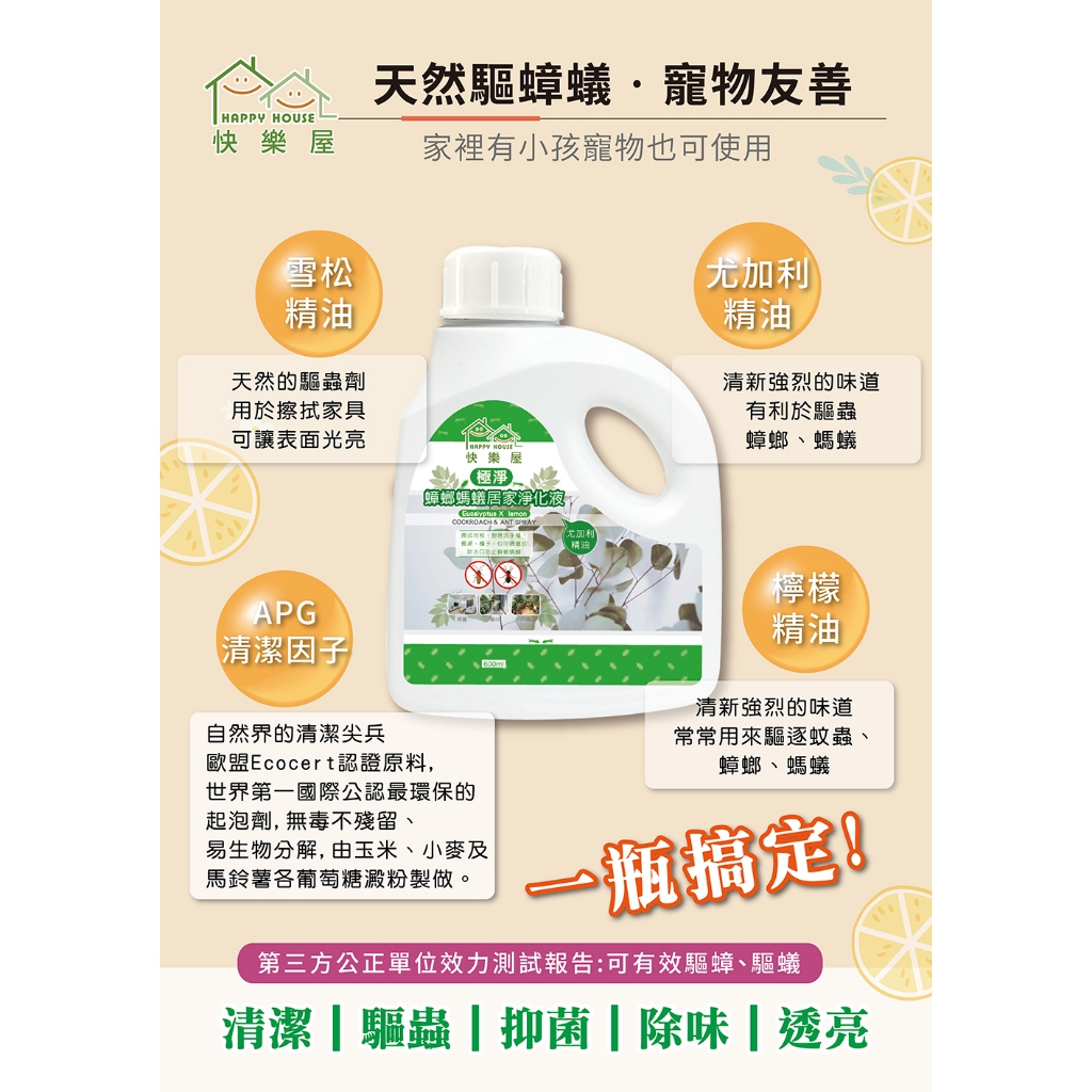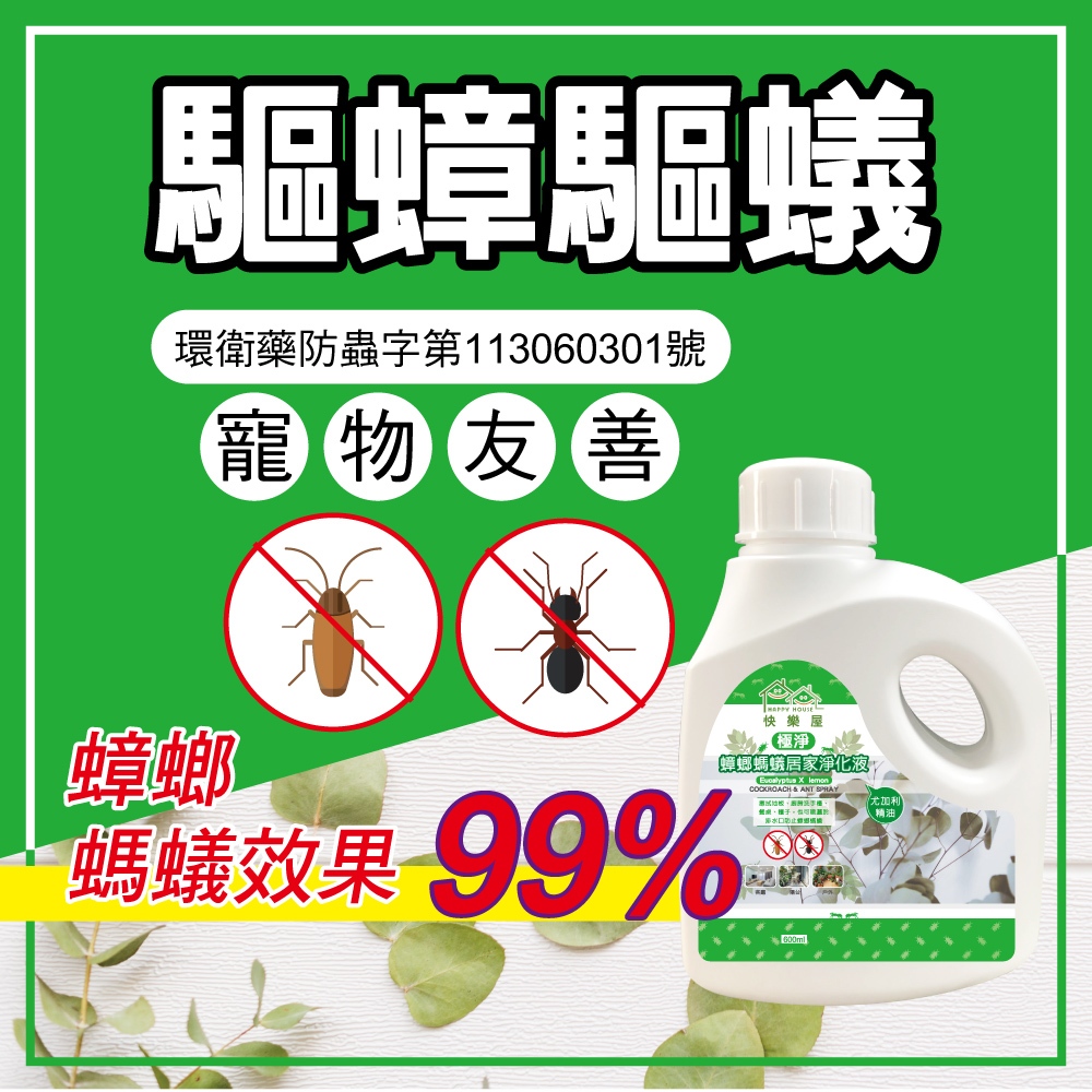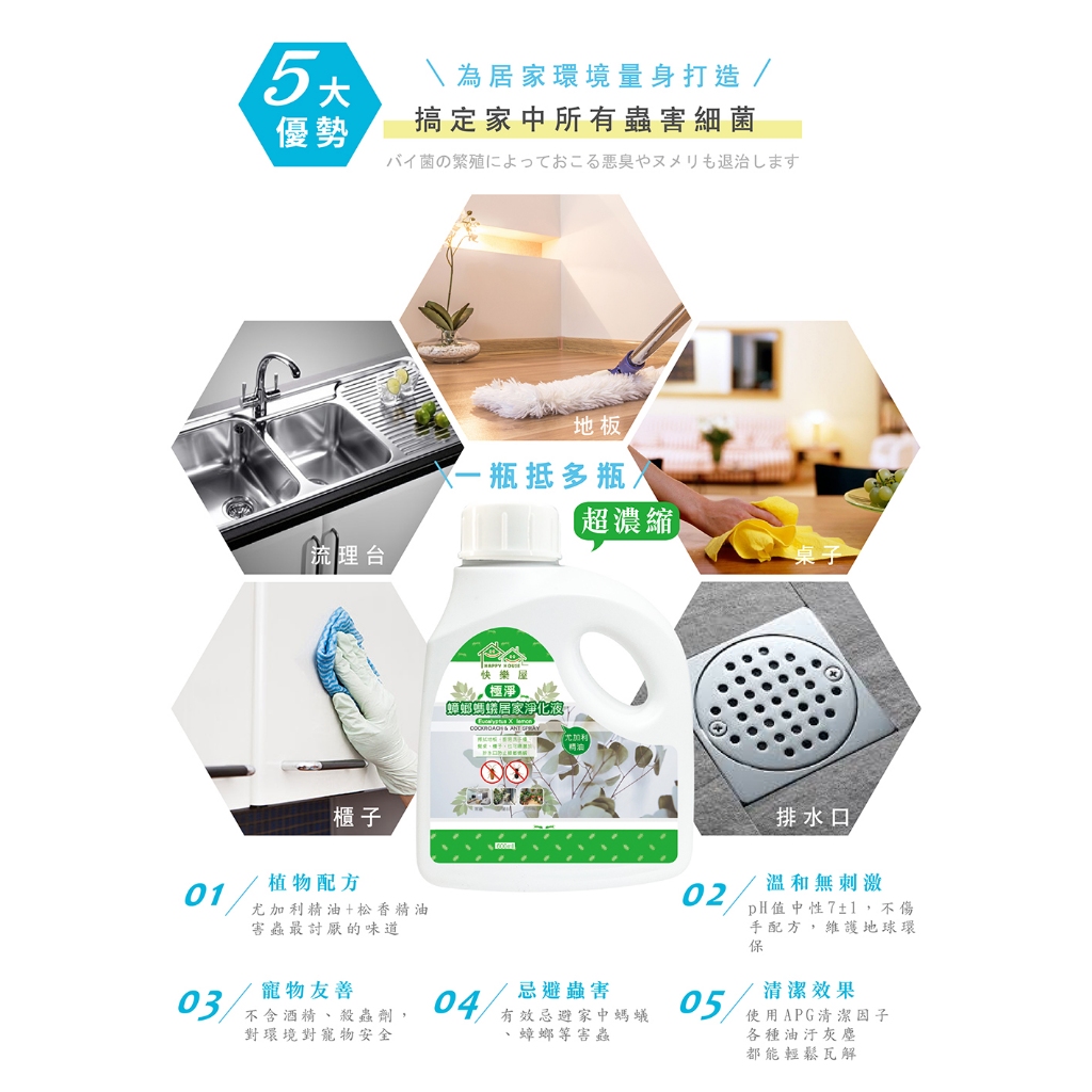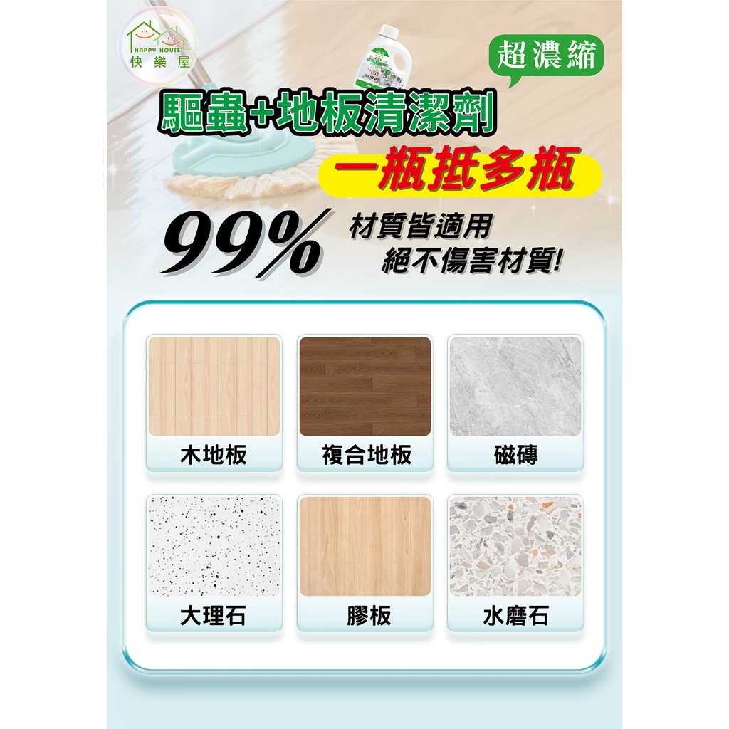 快樂屋蟑螂螞蟻驅蟲地板淨化液 驅蟲地板清潔劑 台灣製造 浴廁水垢 除霉 防蚊 重油汙 寵物友善 天然 天然成分 天然驅蟲1入|2入(259/瓶)|5入(229/瓶)|大量出貨請聊聊(不可超取)Pest & Weed ControlHAPPY HOUSE 旗艦館
