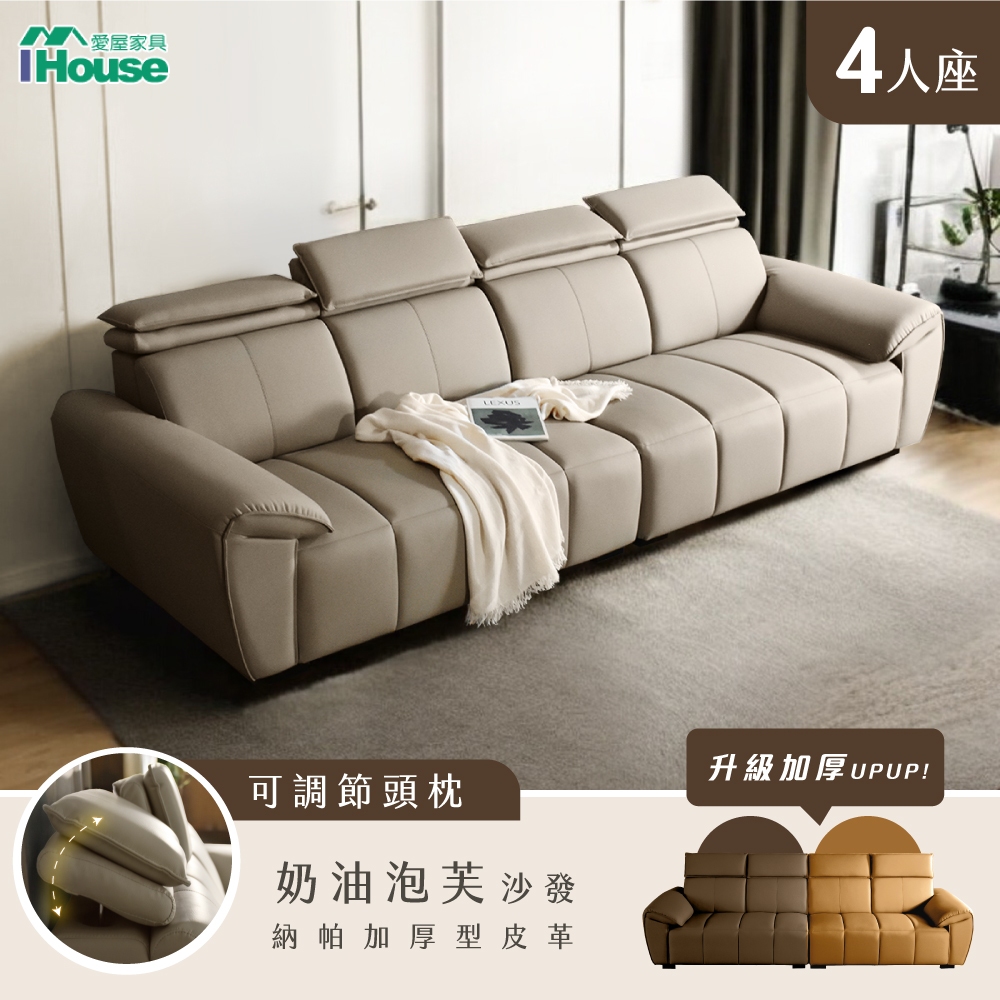 IHouse-【Nappa加厚皮革】侘寂風 奶油泡芙Plus 4人大沙發 (高背支撐+可調式頭枕)奶油泡芙#15|摩卡可可#18|榛果色#21SofasIHouse 愛屋家具【免組裝家具/木心板家具/工廠直營】