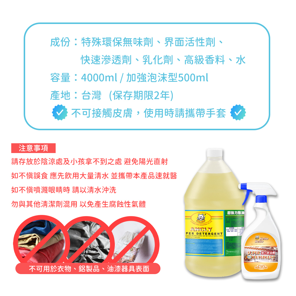 【HELLOxSGS】 重油汙專用 超強力除油劑 4000ml 加侖桶 大容量 廚房清潔 抽油煙機 餐廳 超商蝦店限1桶Hello重油汙專用超強力除油劑,限時特賣|噴槍款,限時特賣|1+1超值組,限時特賣|Hello重油汙專用超強力除油劑,小提示:超取蝦店每單限購1桶(噴槍7支)|Hello重油汙專用超強力除油劑,小提示:2桶(含)以上請選賣家宅配|Hello重油汙專用超強力除油劑,小提示:一箱6桶,大量請以6的倍數下單|Hello重油汙專用超強力除油劑,1瓶/1組|噴槍款,小提示:超取蝦店每單限購1桶(噴槍7支)|噴槍款,小提示:2桶(含)以上請選賣家宅配|噴槍款,小提示:一箱6桶,大量請以6的倍數下單|噴槍款,1瓶/1組|1+1超值組,小提示:超取蝦店每單限購1桶(噴槍7支)|1+1超值組,小提示:2桶(含)以上請選賣家宅配|1+1超值組,小提示:一箱6桶,大量請以6的倍數下單|1+1超值組,1瓶/1組Cleaning AgentsHello Hello 官方旗艦店