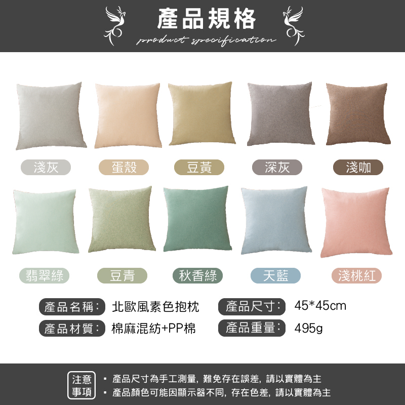 北歐風素色抱枕【現貨】45cm沙發抱枕 辦公室頭枕 坐墊抱枕 車用抱枕 頭枕天藍(純棉枕芯+枕套)|秋香綠(純棉枕芯+枕套)|淺咖(純棉枕芯+枕套)|淺桃紅(純棉枕芯+枕套)|蛋殼(純棉枕芯+枕套)|豆青(純棉枕芯+枕套)|豆黃(純棉枕芯+枕套)|深灰(純棉枕芯+枕套)|淺灰(純棉枕芯+枕套)|翡翠綠(純棉枕芯+枕套)CushionsHONG JIN 宏晉 |3C資訊廣場