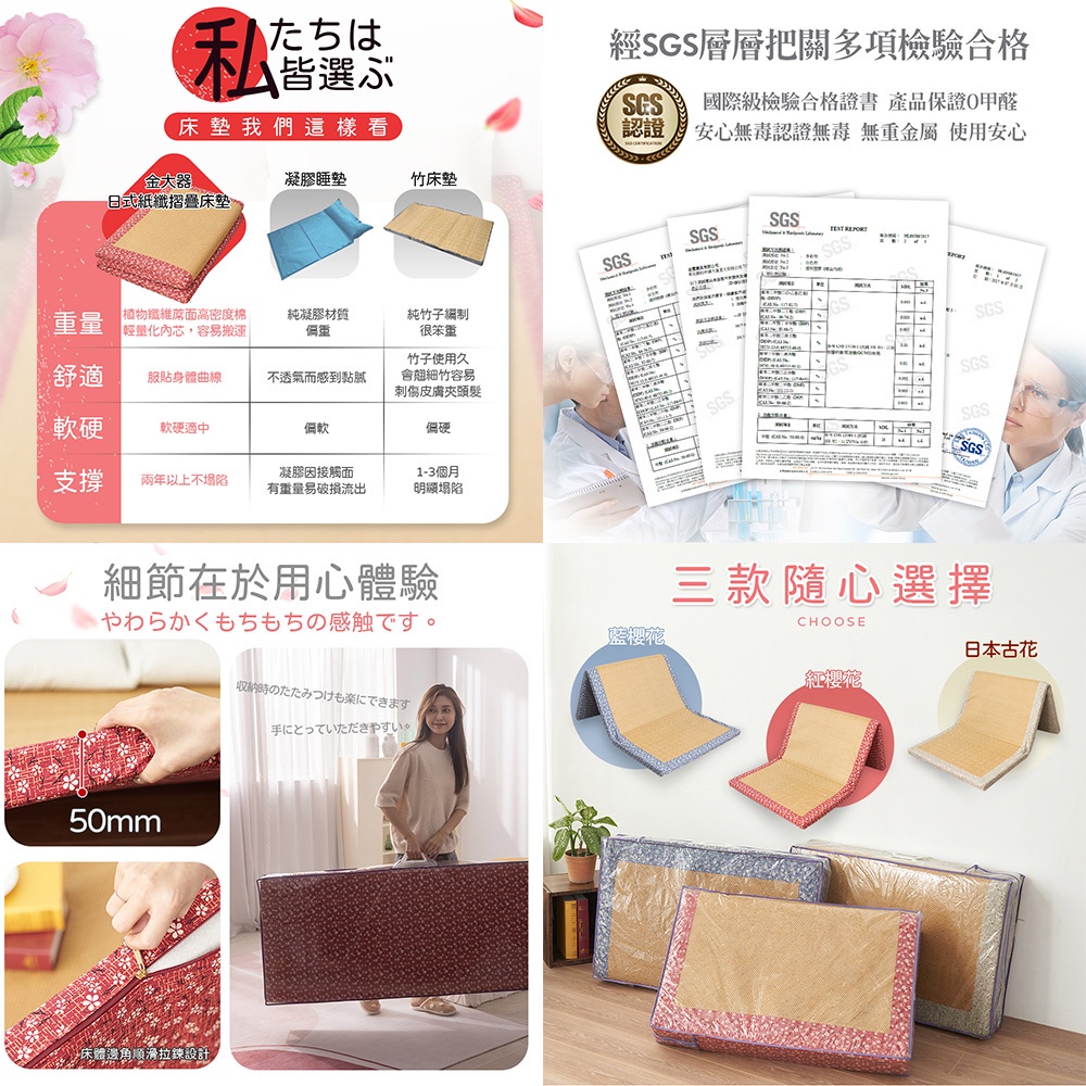 【金大器】可客製 厚5cm日和風三折床墊 榻榻米 打地鋪睡墊 雙人床墊 折疊床墊 摺疊床墊 睡墊 車宿床墊 地板床墊正常規格-日本古花,6尺雙人加大(180*186cm)|正常規格-日本古花,7尺雙人特大(180*210cm)|正常規格-櫻花紅,5尺標準雙人(150*186cm)|正常規格-櫻花紅,7尺雙人特大(180*210cm)|正常規格-櫻花藍,3尺單人(90*182cm)|正常規格-日本古花,3尺單人(90*182cm)|正常規格-櫻花紅,3尺單人(90*182cm)|正常規格-櫻花紅,6尺雙人加大(180*186cm)|正常規格-櫻花藍,7尺雙人特大(180*210cm)|正常規格-櫻花藍,3.5尺單人加大(105*186cm)|正常規格-櫻花藍,5尺標準雙人(150*186cm)|正常規格-櫻花藍,6尺雙人加大(180*186cm)|正常規格-櫻花紅,3.5尺單人加大(105*186cm)|正常規格-日本古花,3.5尺單人加大(105*186cm)|正常規格-日本古花,5尺標準雙人(150*186cm)MattressesJINDACHI金大器精品寢具-官方旗艦|天絲/床包/棉被/枕頭/床墊/椅靠墊