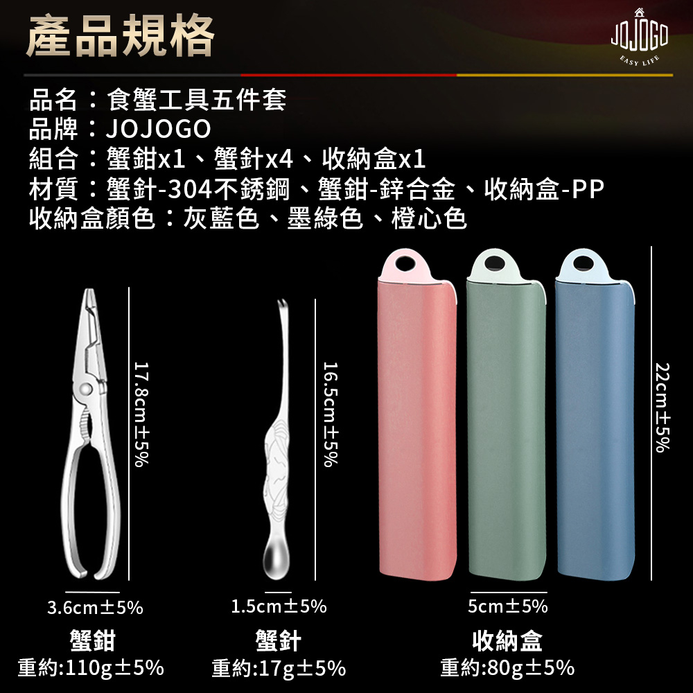 JOJOGO 食蟹工具五件套 廚房用品 螃蟹夾 螃蟹工具 蟹鉗 不銹鋼 吃蟹工具 蟹八件家用 剝蟹神器 蟹針墨綠色|橙心色Spatulas & Cooking TweezersJOJOGO 生活百貨