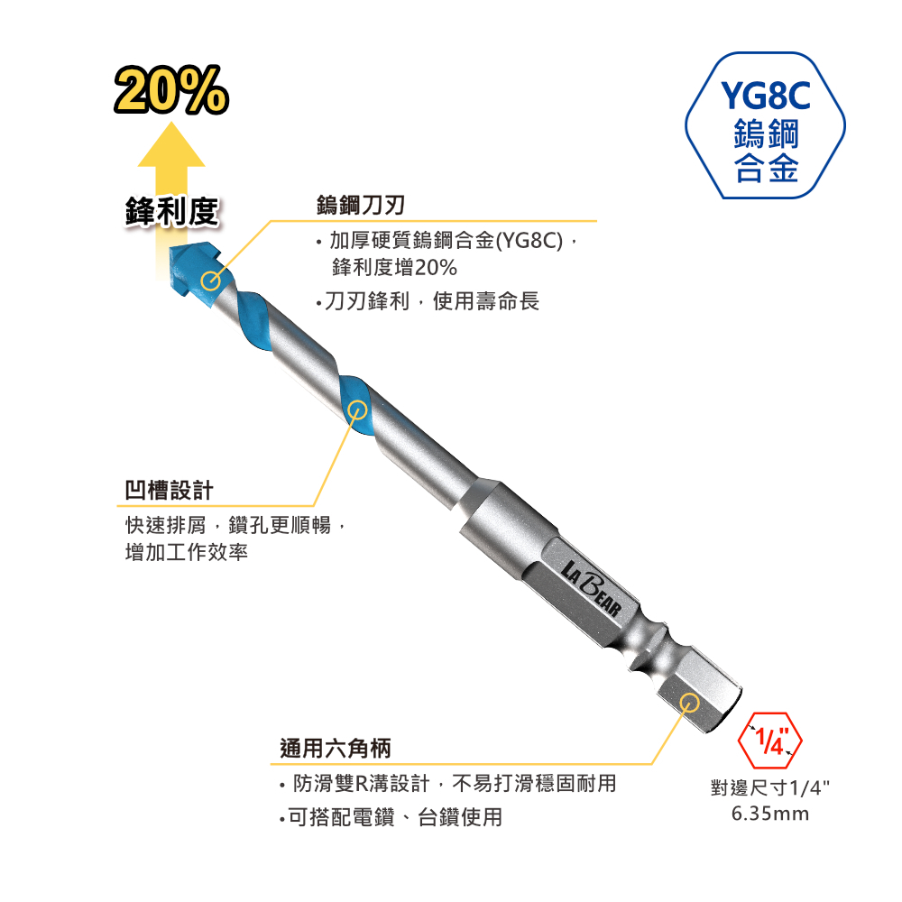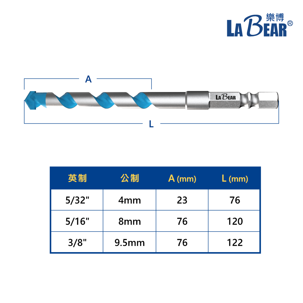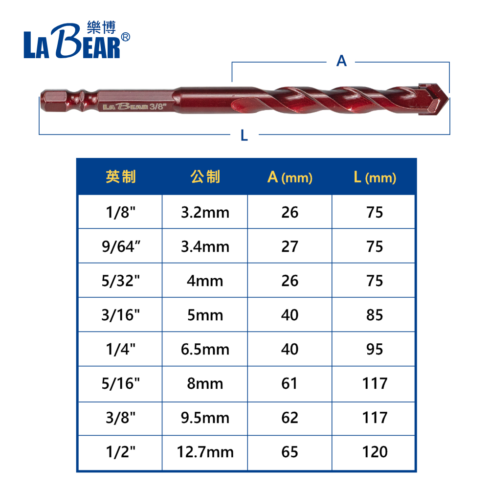【LaBear】鎢鋼水泥鑽 1/8″-3/8″ 鎢鋼刀刃 多功能鑽頭 六角柄 麻花鑽 木材 石材 磁磚 鑽尾藍色5/16″ (8mm)|藍色3/8″ (9.5mm)|紅色9/64″ (3.4mm)|紅色5/32″ (4mm)|紅色3/16″ (5mm)|紅色1/4″ (6.5mm)|紅色5/16″ (8mm)|紅色3/8″ (9.5mm)|紅色1/2″ (12.7mm)|紅色1/8″ (3.2mm)ToolsLaBear 樂博工具
