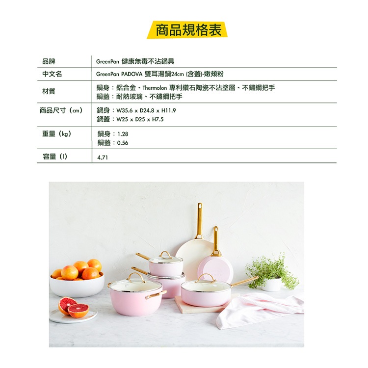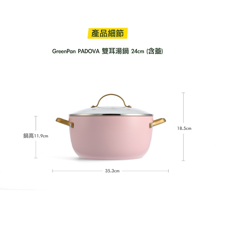 GreenPan 鑽石陶瓷塗層不沾雙耳湯鍋 PADOVA 24cm 嫩頰粉 含蓋 不挑爐具/IH爐適用/天然無毒【單件】雙耳湯鍋24cm(含蓋/嫩頰粉)PansGreenPan 官方旗艦店