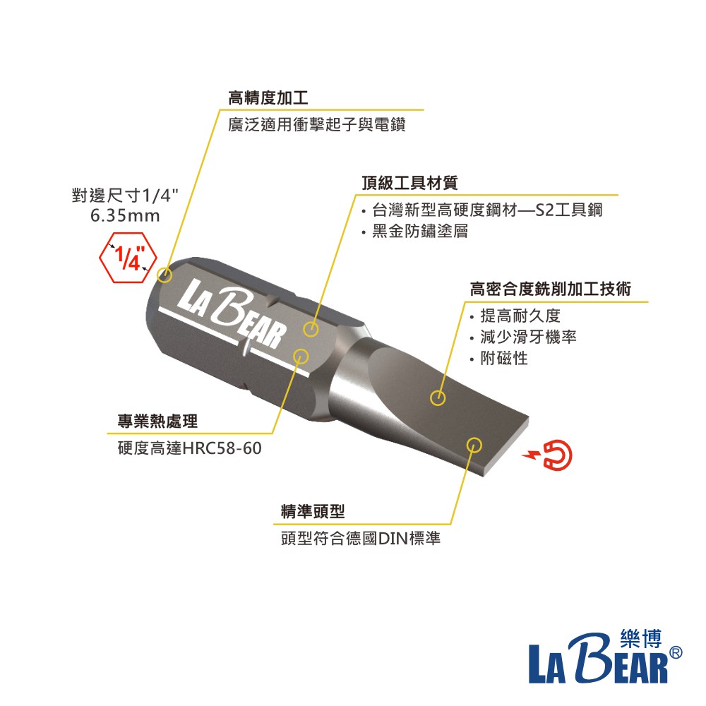 【LaBear】1/4″ 一字起子頭 V型溝 25mm 六角批頭 台灣製 公制一字 3.0*0.5mm|一字 4.0*0.5mm|一字 4.5*0.6mm|一字 5.5*1.0mm|一字 6.5*1.2mm|一字 7.0*1.2mm|一字 8.0*1.2mm|一字 8.0*1.6mm|一字 5.0*1.0mmToolsLaBear 樂博工具
