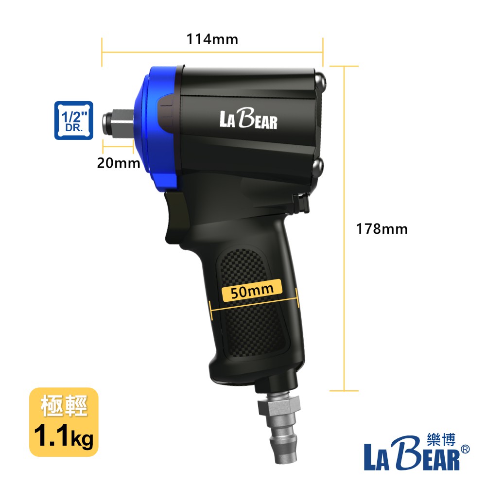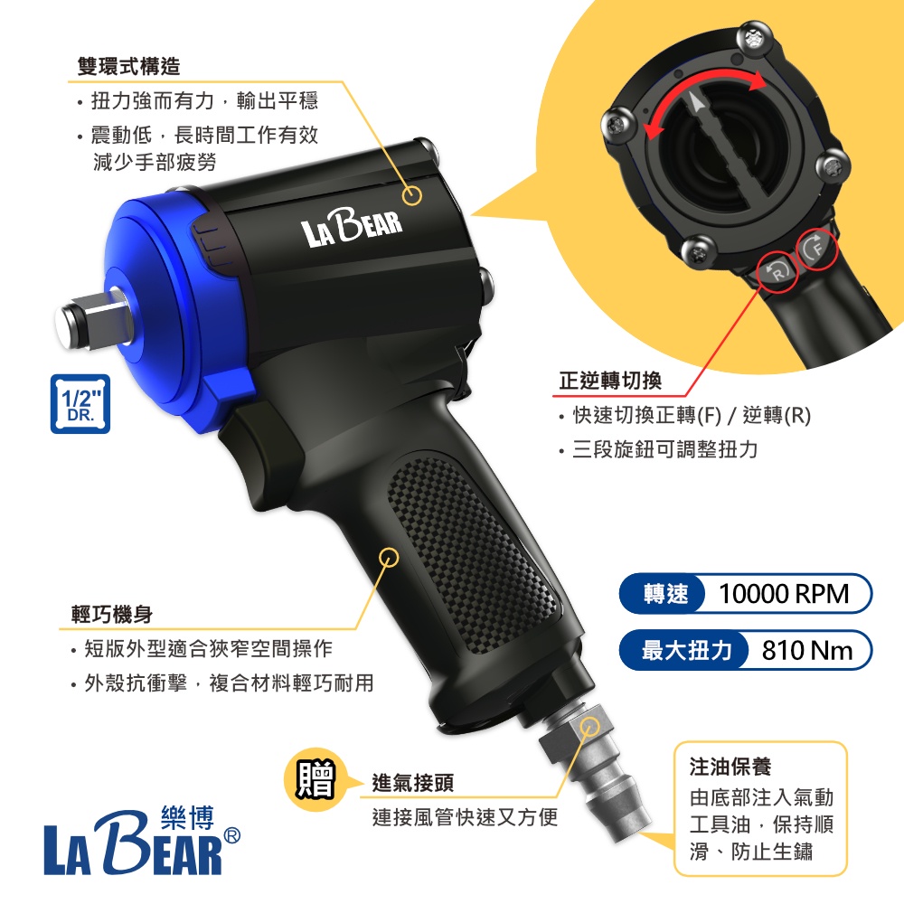 【LaBear】迷你 氣動扳手 4分 輕量化 810Nm 大扭力 贈進氣接頭 衝擊扳手 雙環式 氣動扳手 高扭力氣動工具迷你氣動扳手 4分Air Pumps, Parts & AccessoriesLaBear 樂博工具