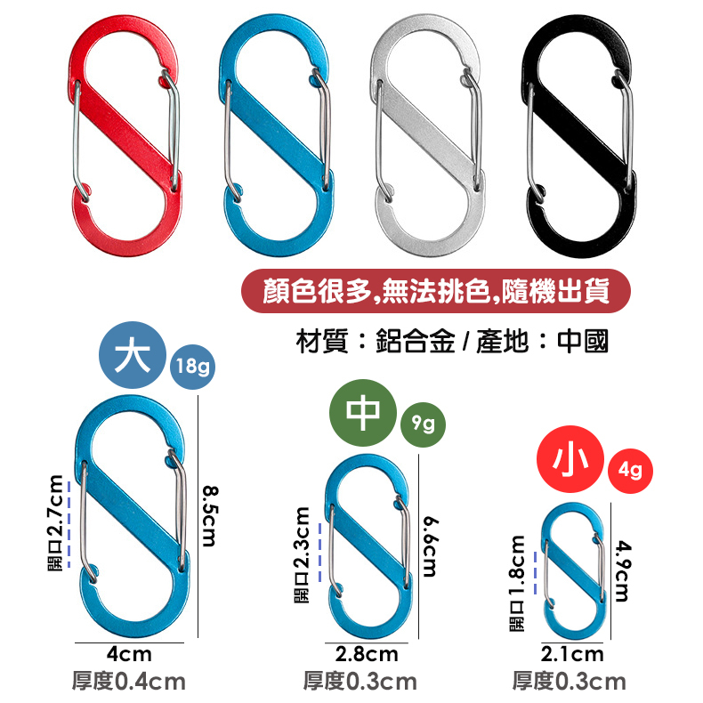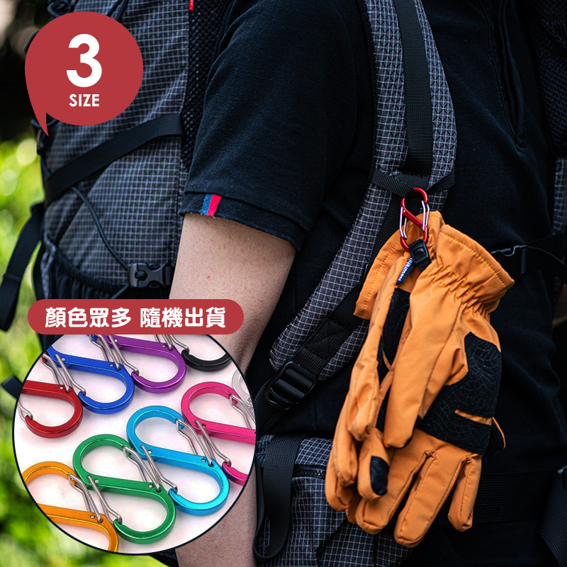 S露營登山扣【顏色隨機出貨】背包快掛 鑰匙扣 登山扣 8字扣小(4.9×2.1×0.3cm)三入|大(8.5x4x0.4cm)單入|中(6.6×2.8×0.3cm)單入|小(4.9×2.1×0.3cm)單入|大(8.5x4x0.4cm)三入|中(6.6×2.8×0.3cm)三入HooksGood Go 好好買