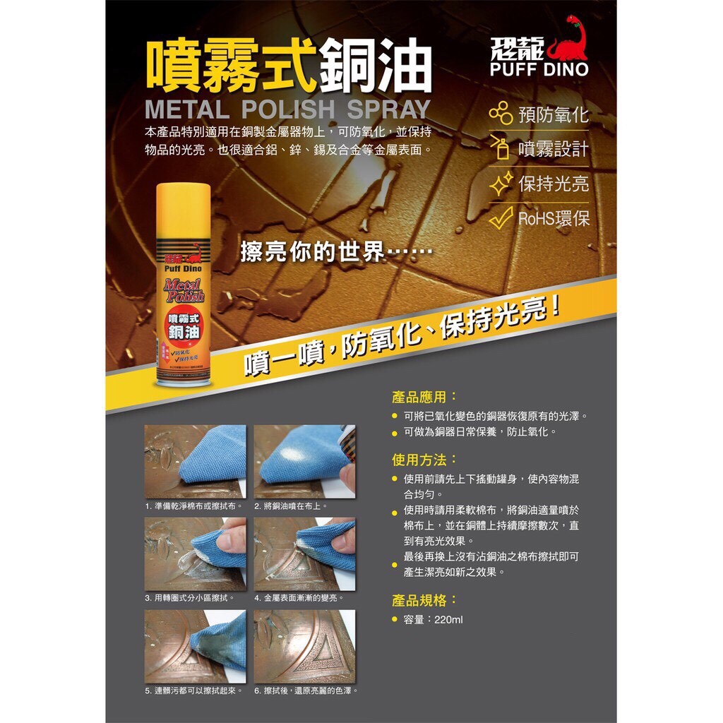 恐龍 噴霧式銅油 擦銅劑 擦銅油 擦銅水 銅器清潔劑 銅器保養劑 金屬保護劑 220ml恐龍噴霧式銅油Cleaning AgentsKERB STAR