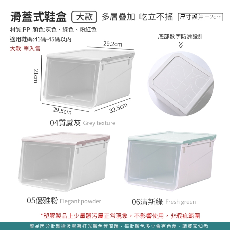 【收納必備】滑蓋式鞋盒 收納鞋架 掀蓋鞋盒 硬盒 掀蓋式鞋盒 加厚款 免組裝鞋盒 大容量 堆疊鞋盒 鞋子收納 鞋盒灰色,【滑蓋鞋盒】小款|灰色,【滑蓋鞋盒】大款|粉色,【滑蓋鞋盒】小款|粉色,【滑蓋鞋盒】大款|綠色,【滑蓋鞋盒】小款|綠色,【滑蓋鞋盒】大款Shoe Storage BoxesLAVIDA 育兒好好玩!