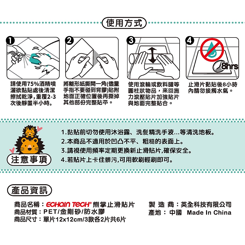 Echain Tech 金鋼砂 卡通止滑貼 浴室防滑貼 防水止滑貼片 止滑貼片 -動物B款 (每包6片)動物A款-12*12cm (6片/包)|動物B款-12*12cm (6片/包)|動物C款-12*12cm (6片/包)|恐龍A款-12*12cm (6片/包)|恐龍B款-12*12cm (6片/包)|透明方型12*12cm (6片/包)|透明-長條型23*4cm (6片/包)|透明方型18*18cm (6片/包)|動物D款-12*12cm (6片/包)|動物E款-12*12cm (6片/包)OthersLOG 樂格地墊