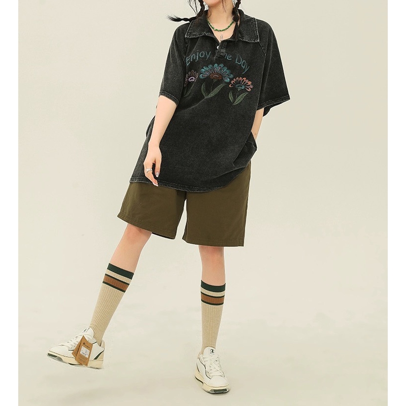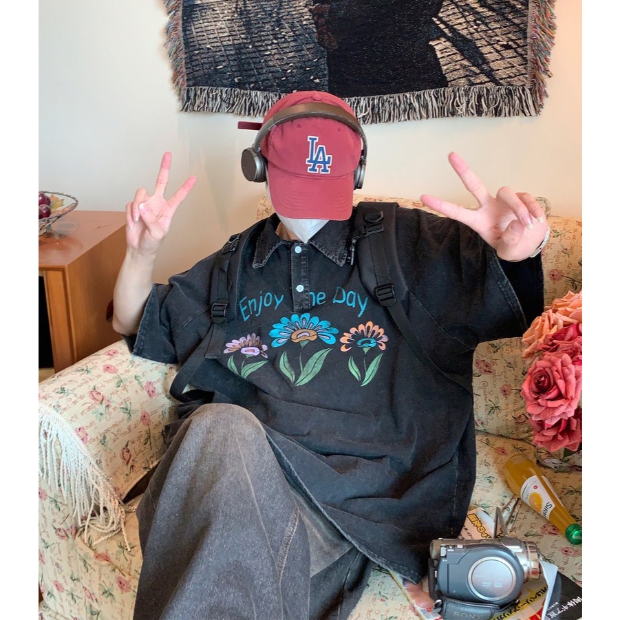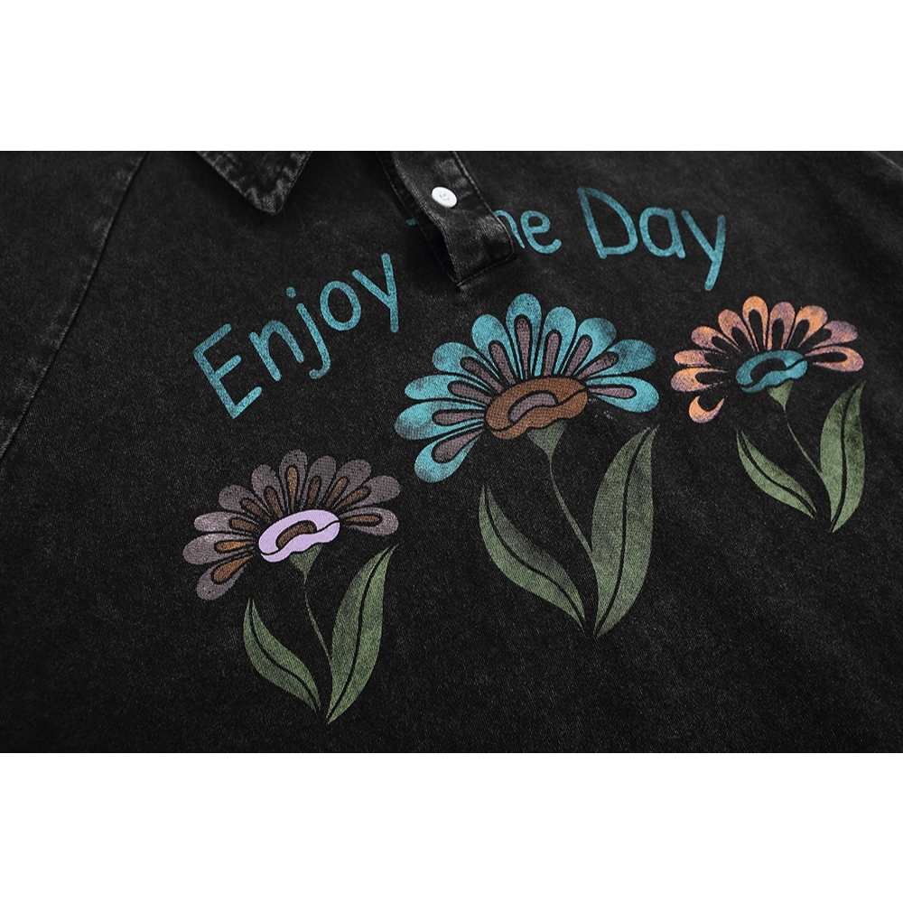 【K-2】ENJOY 三朵小花花 水洗 立領 POLO衫 水洗短T 短袖 穿搭 男女不拘 小奶狗 文青【HP1770】