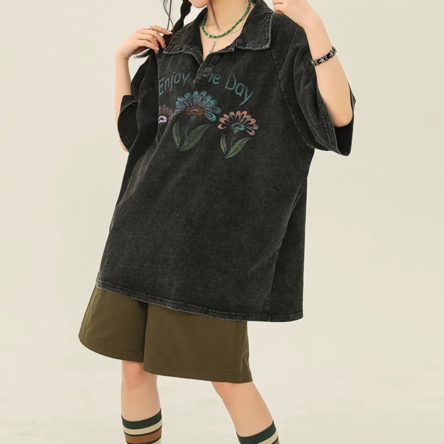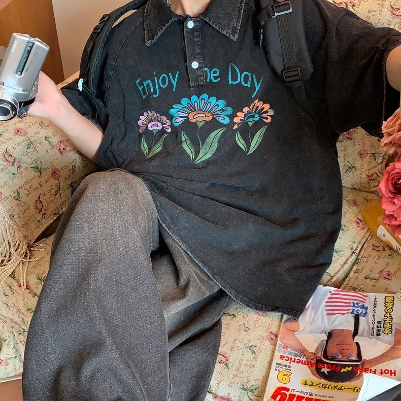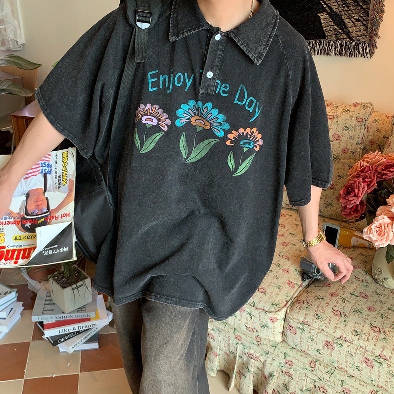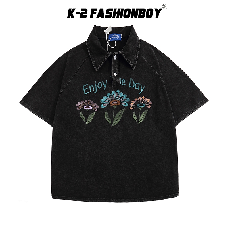 【K-2】ENJOY 三朵小花花 水洗 立領 POLO衫 水洗短T 短袖 穿搭 男女不拘 小奶狗 文青【HP1770】M|L|XLPolo ShirtsK-2 Fashionboy