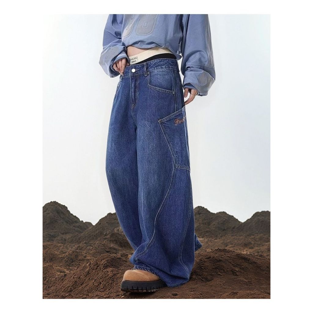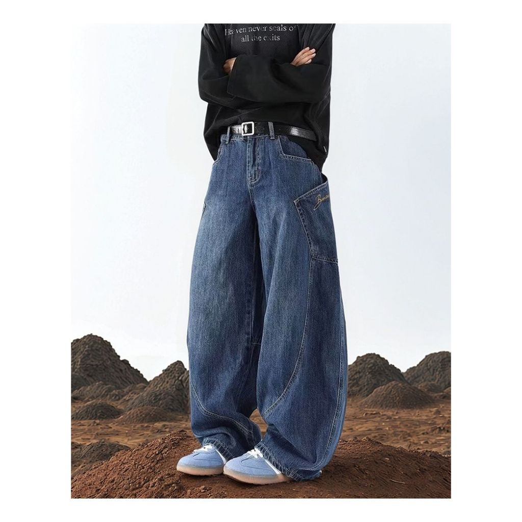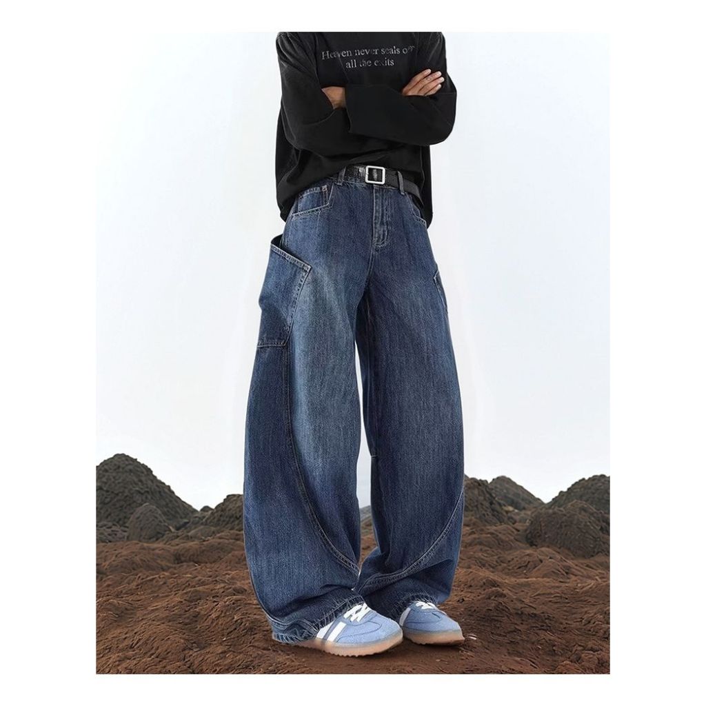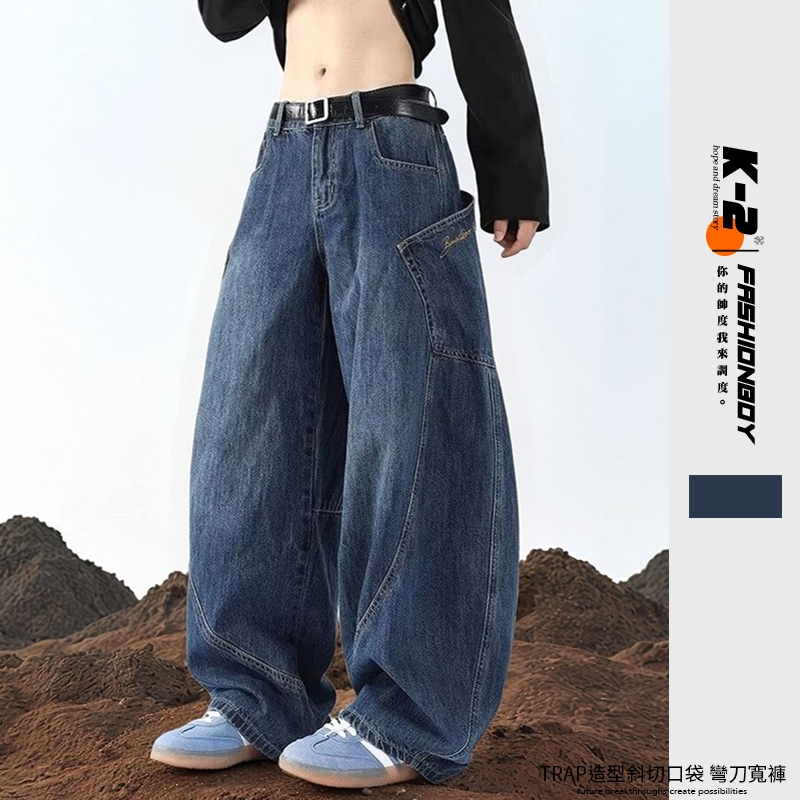 【K-2】刺繡小LOGO 斜切多口袋 牛仔彎刀褲 單寧色 解構剪裁 彎刀褲 牛仔褲 寬褲 褲子 長褲 氣球【J3226】S|M|L|XL|XXLK-2 Fashionboy