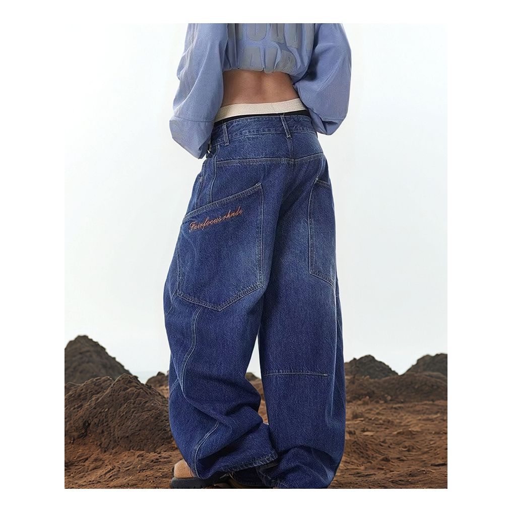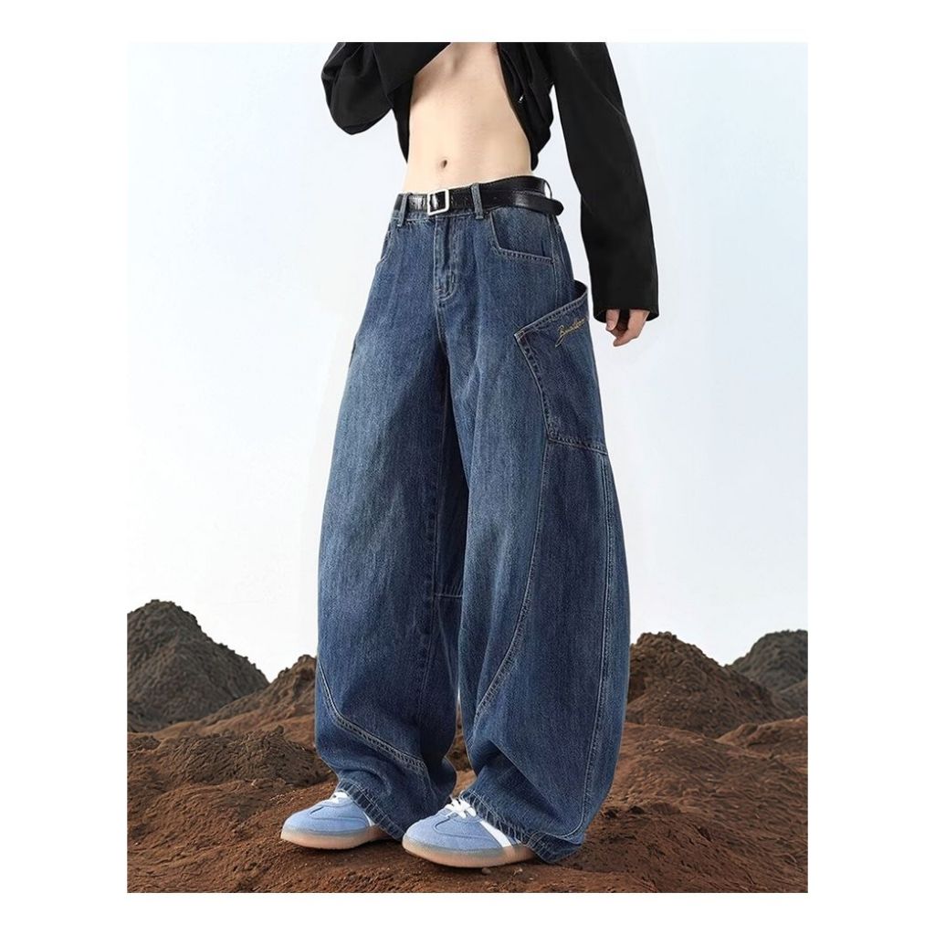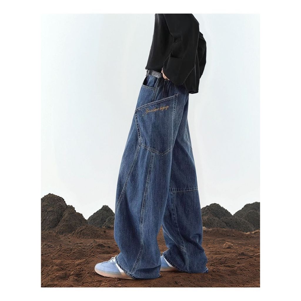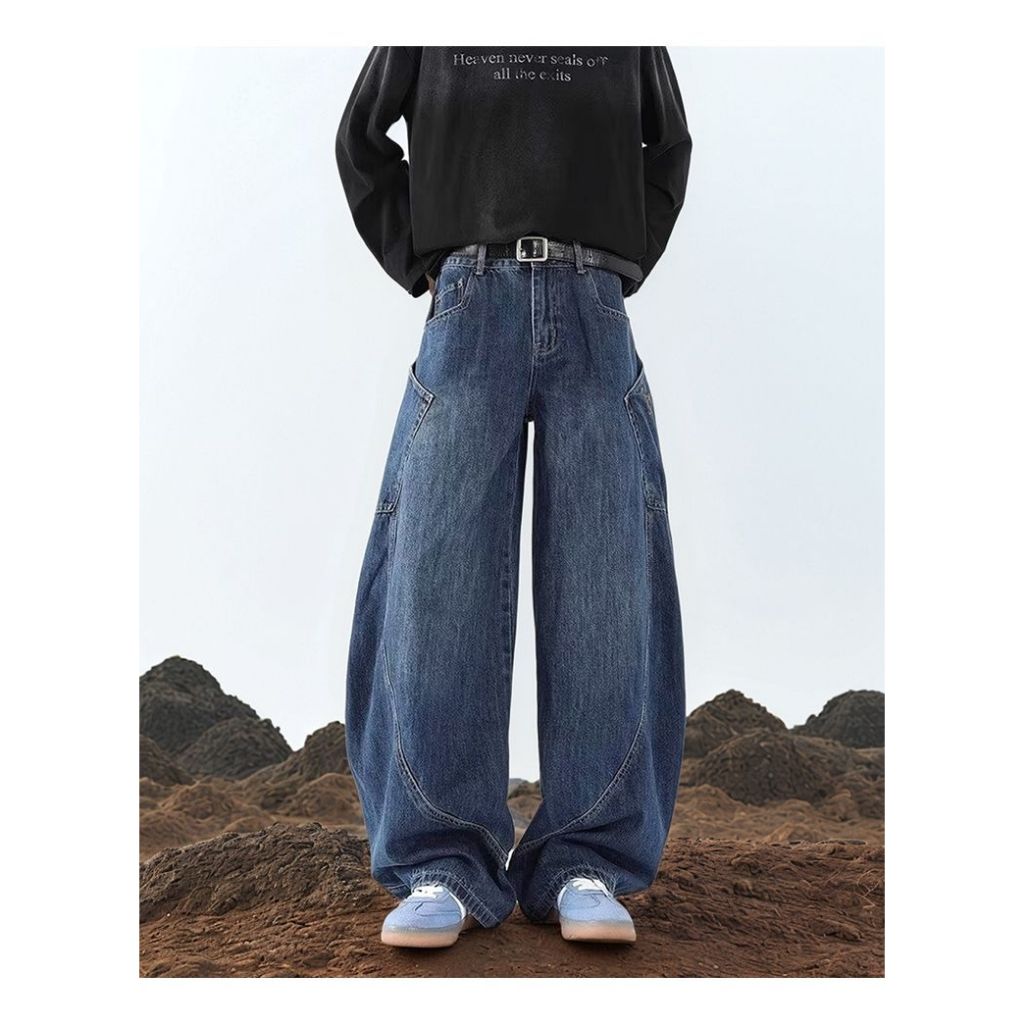 【K-2】刺繡小LOGO 斜切多口袋 牛仔彎刀褲 單寧色 解構剪裁 彎刀褲 牛仔褲 寬褲 褲子 長褲 氣球【J3226】S|M|L|XL|XXLK-2 Fashionboy
