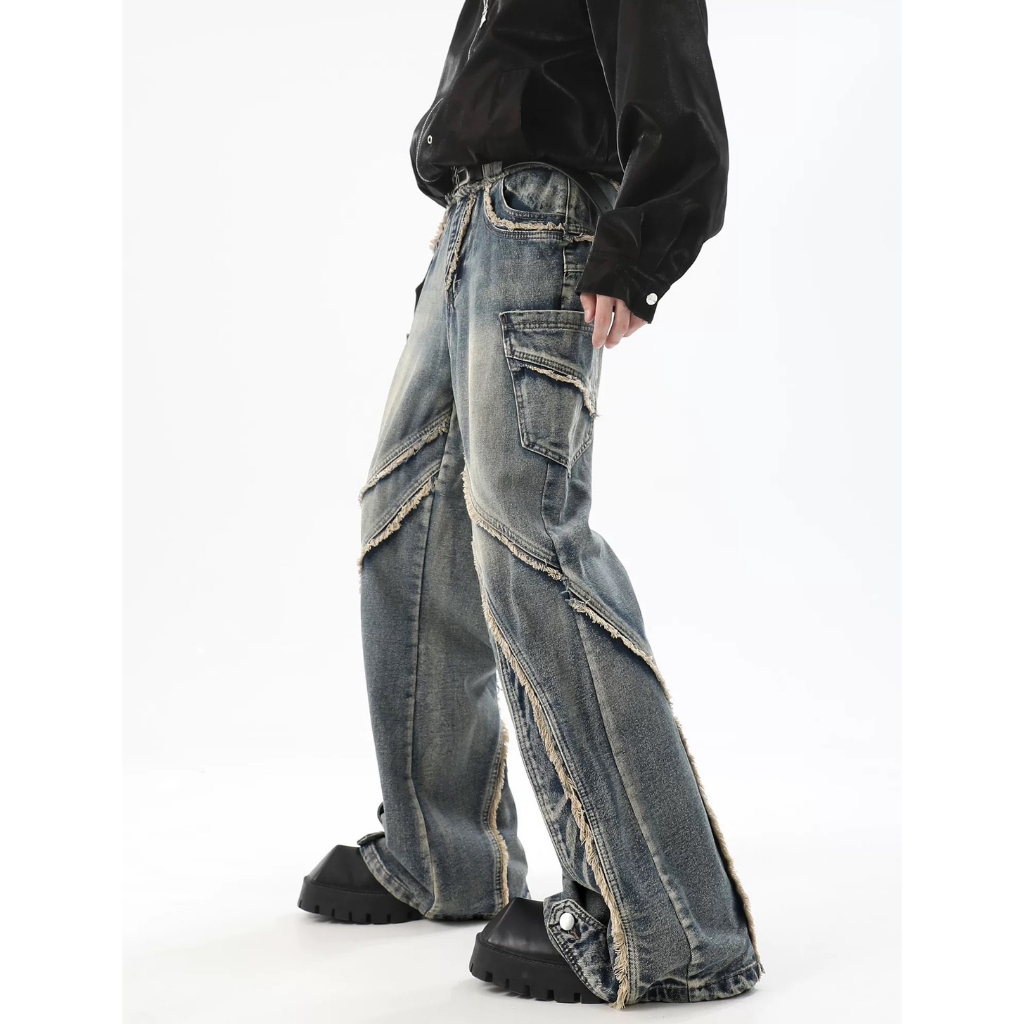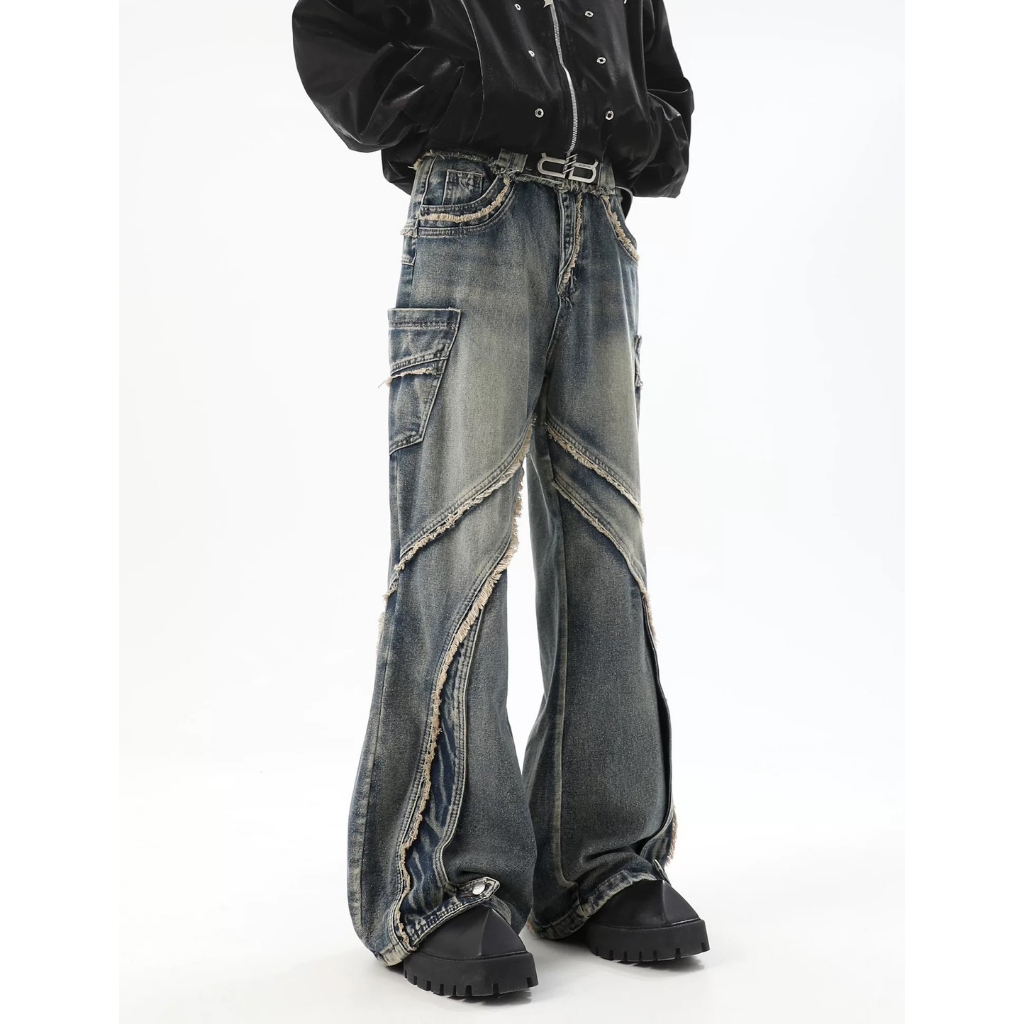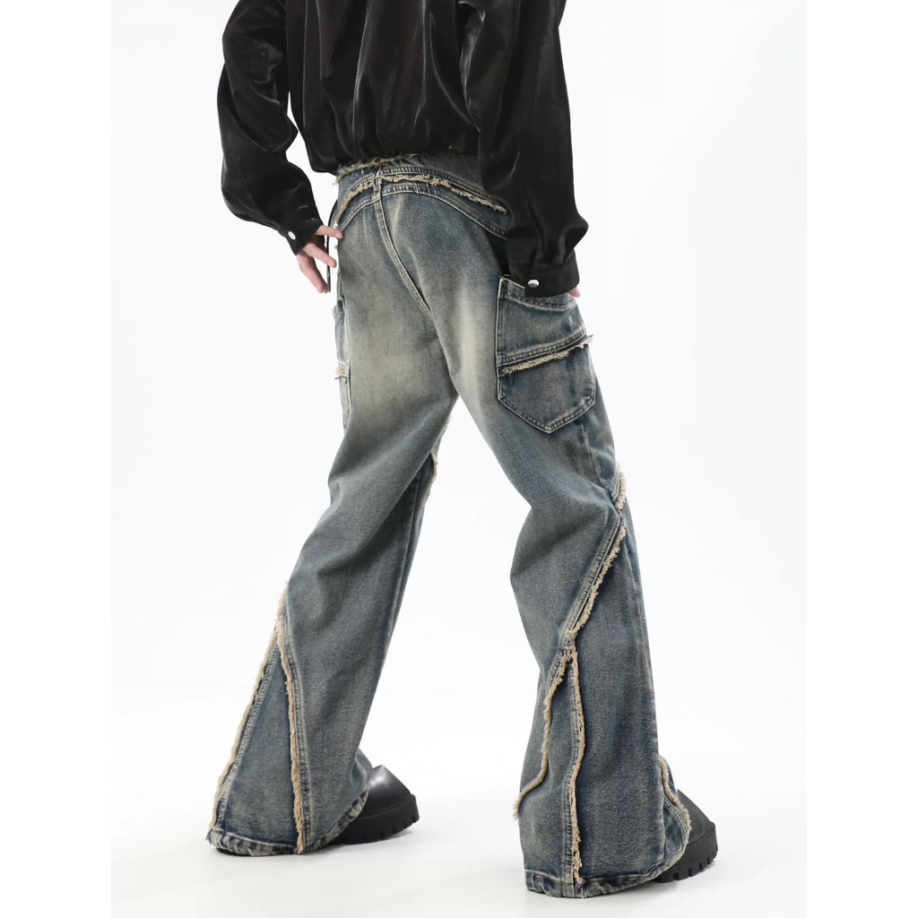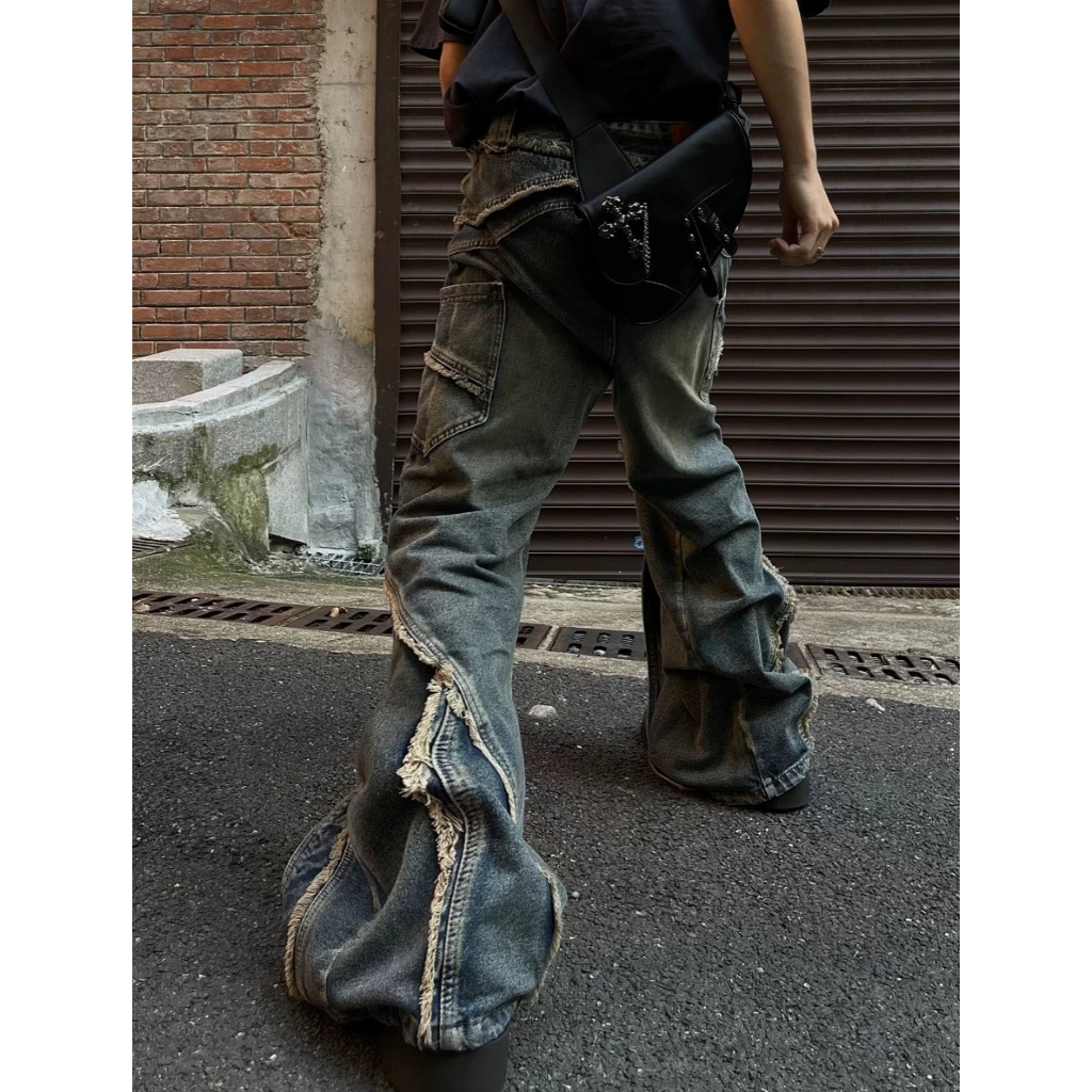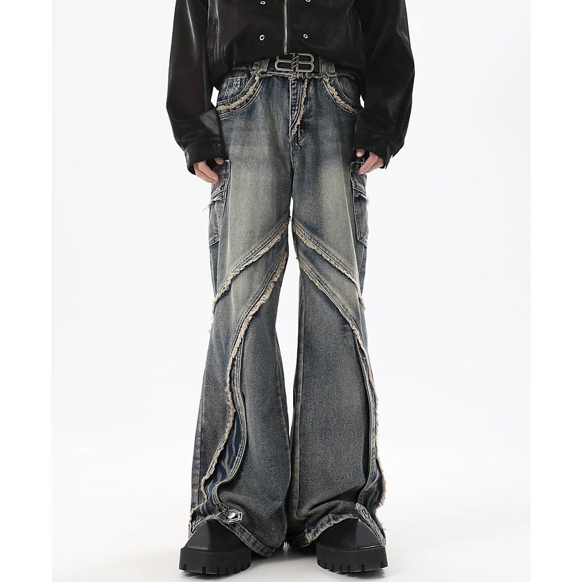 【K-2】小眾尖端穿搭 復古毛邊環繞 牛仔工作褲 水洗 牛仔褲 喇叭褲 長褲 寬褲 修身 特殊長褲 褲子【JN7717】M|L|XL|XXLK-2 Fashionboy