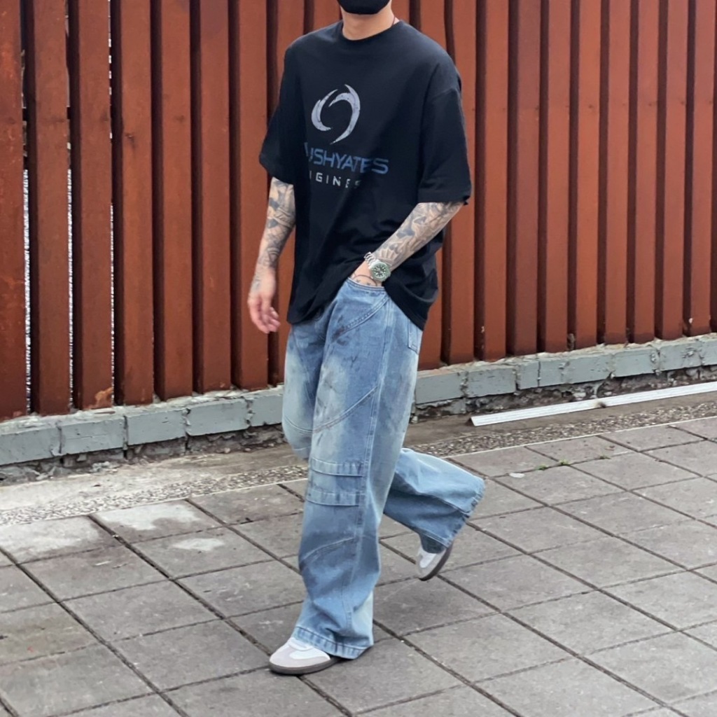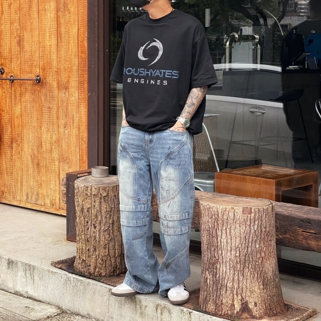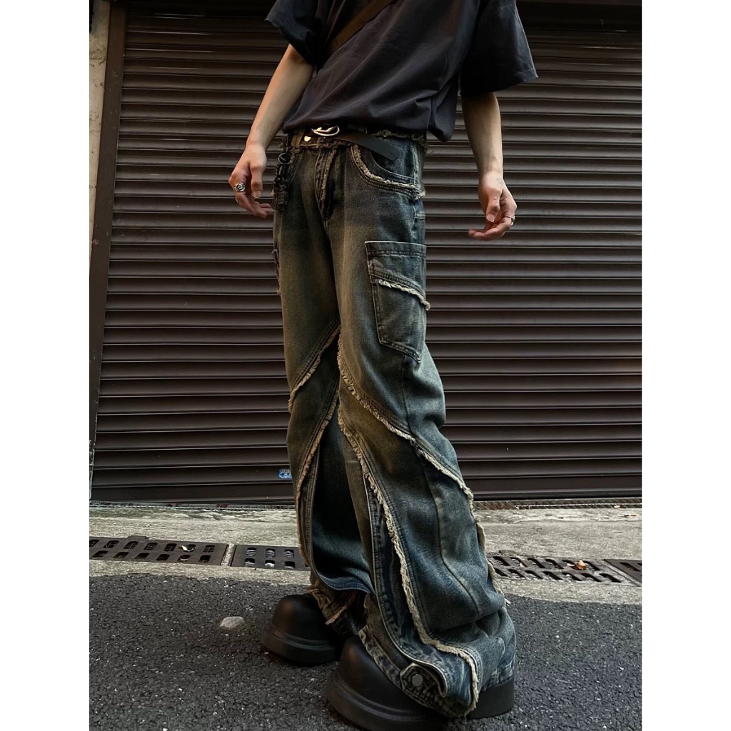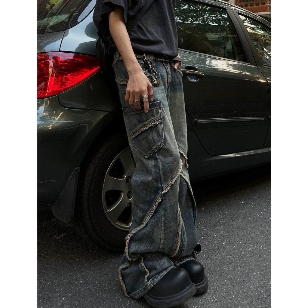 【K-2】小眾尖端穿搭 復古毛邊環繞 牛仔工作褲 水洗 牛仔褲 喇叭褲 長褲 寬褲 修身 特殊長褲 褲子【JN7717】M|L|XL|XXLK-2 Fashionboy