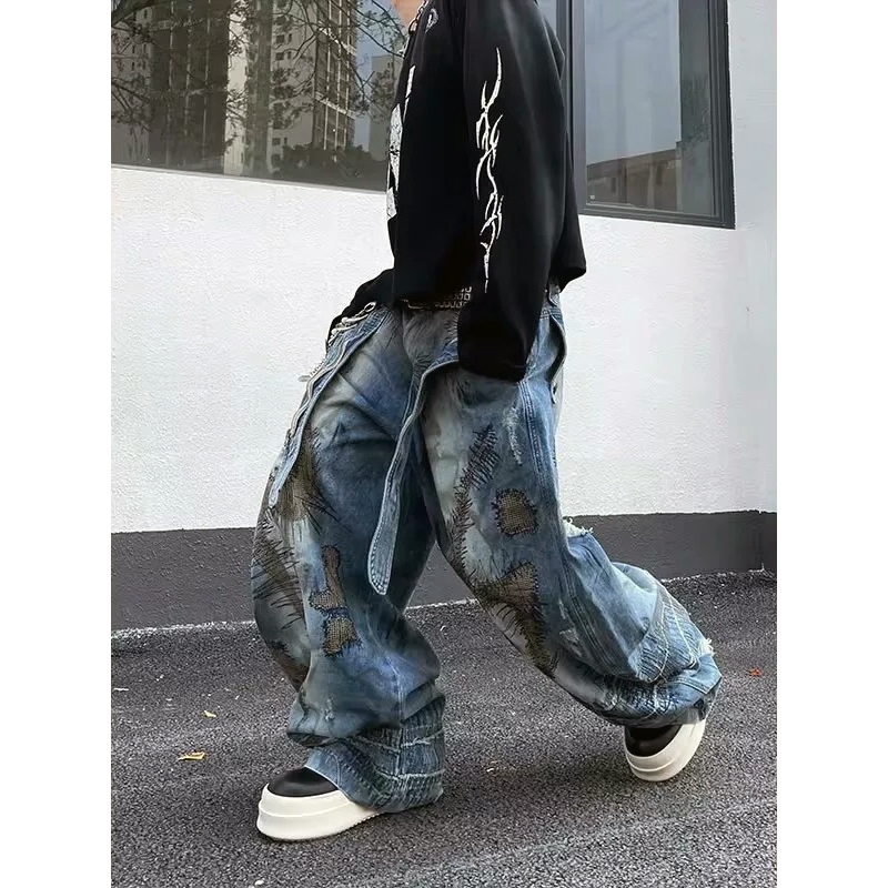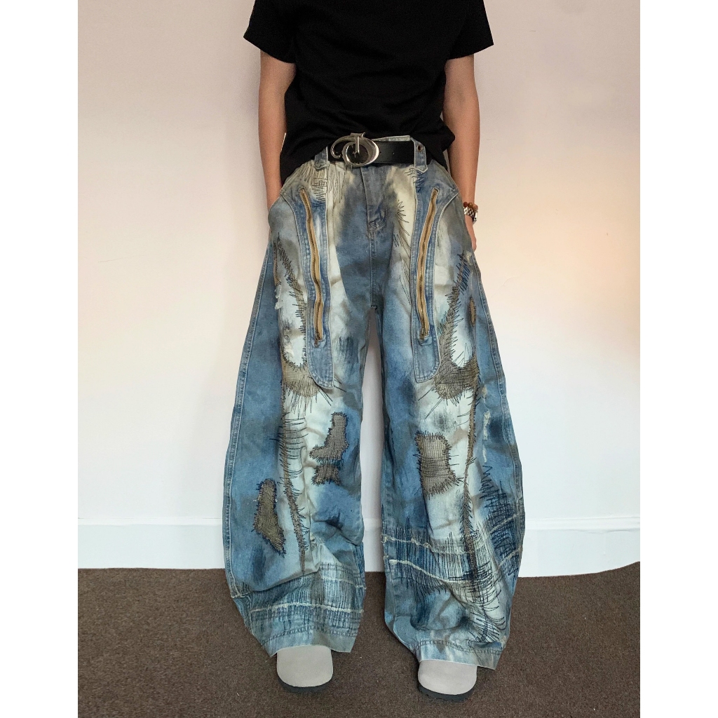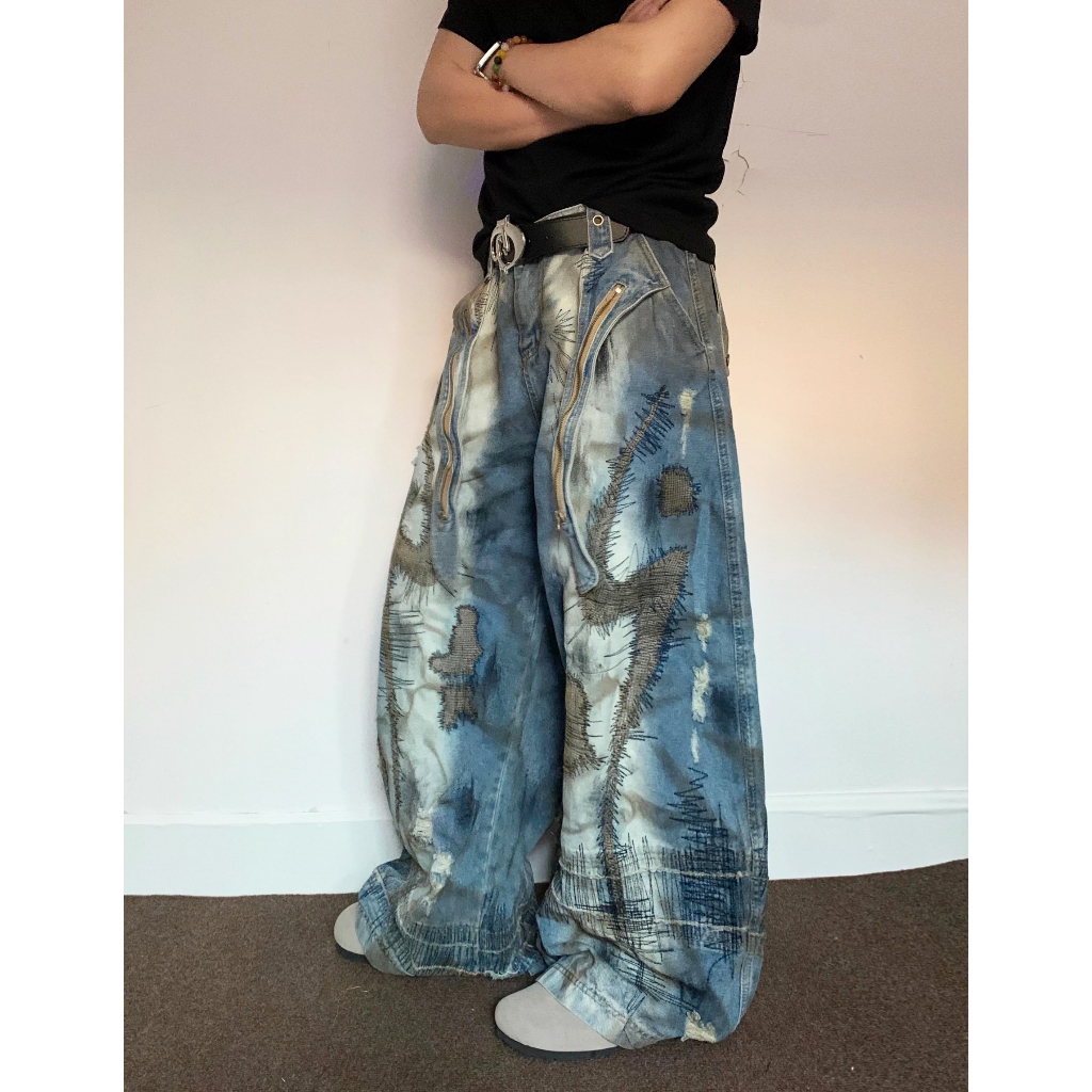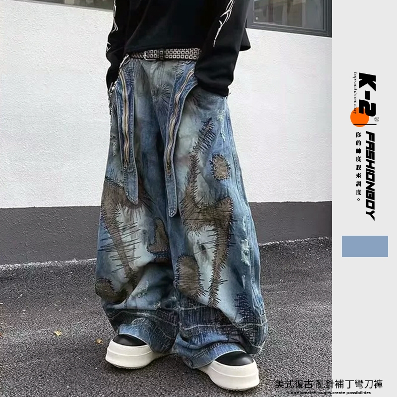 【K-2】美式復古 亂針補丁 刷舊水洗 拉鍊腰繩 牛仔彎刀褲 彎刀褲 造型長褲 牛仔褲 長褲 特殊 K2【JN6096】M|L|XL|XXLK-2 Fashionboy