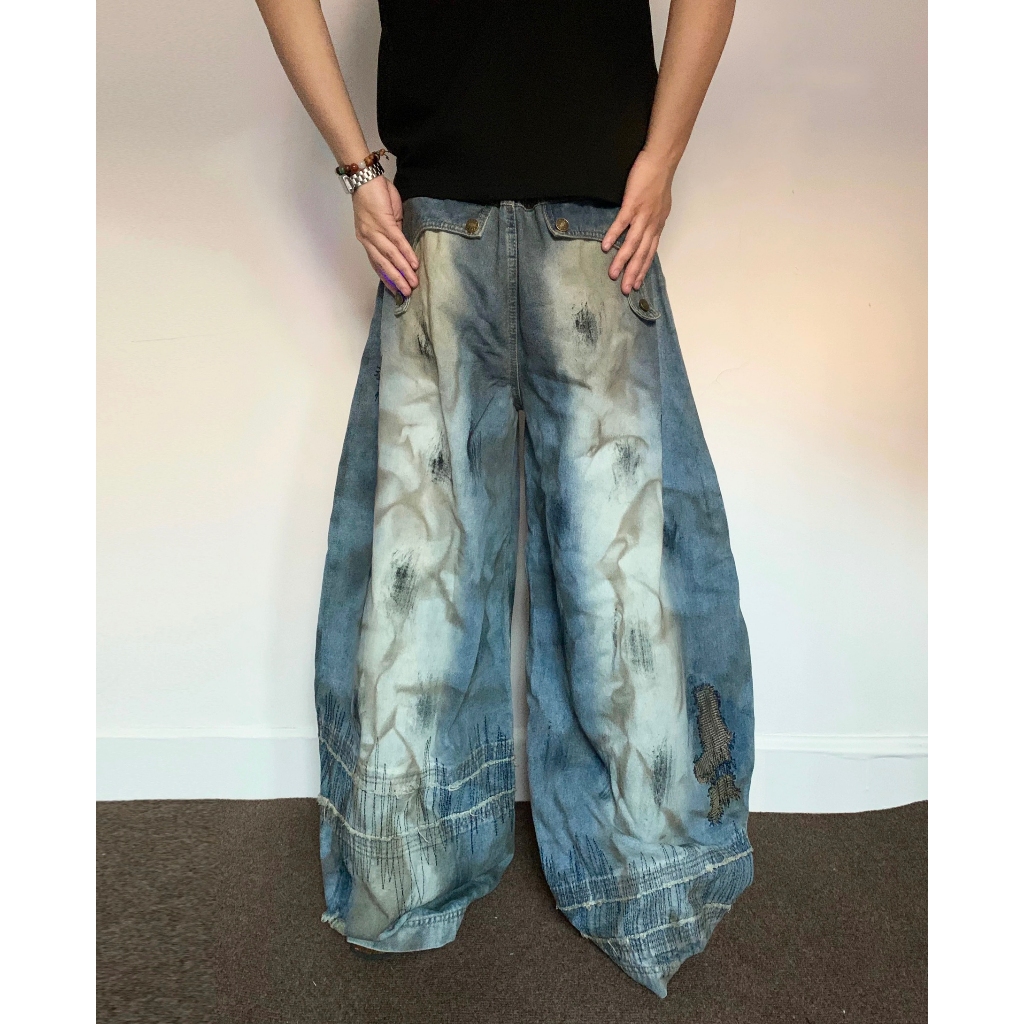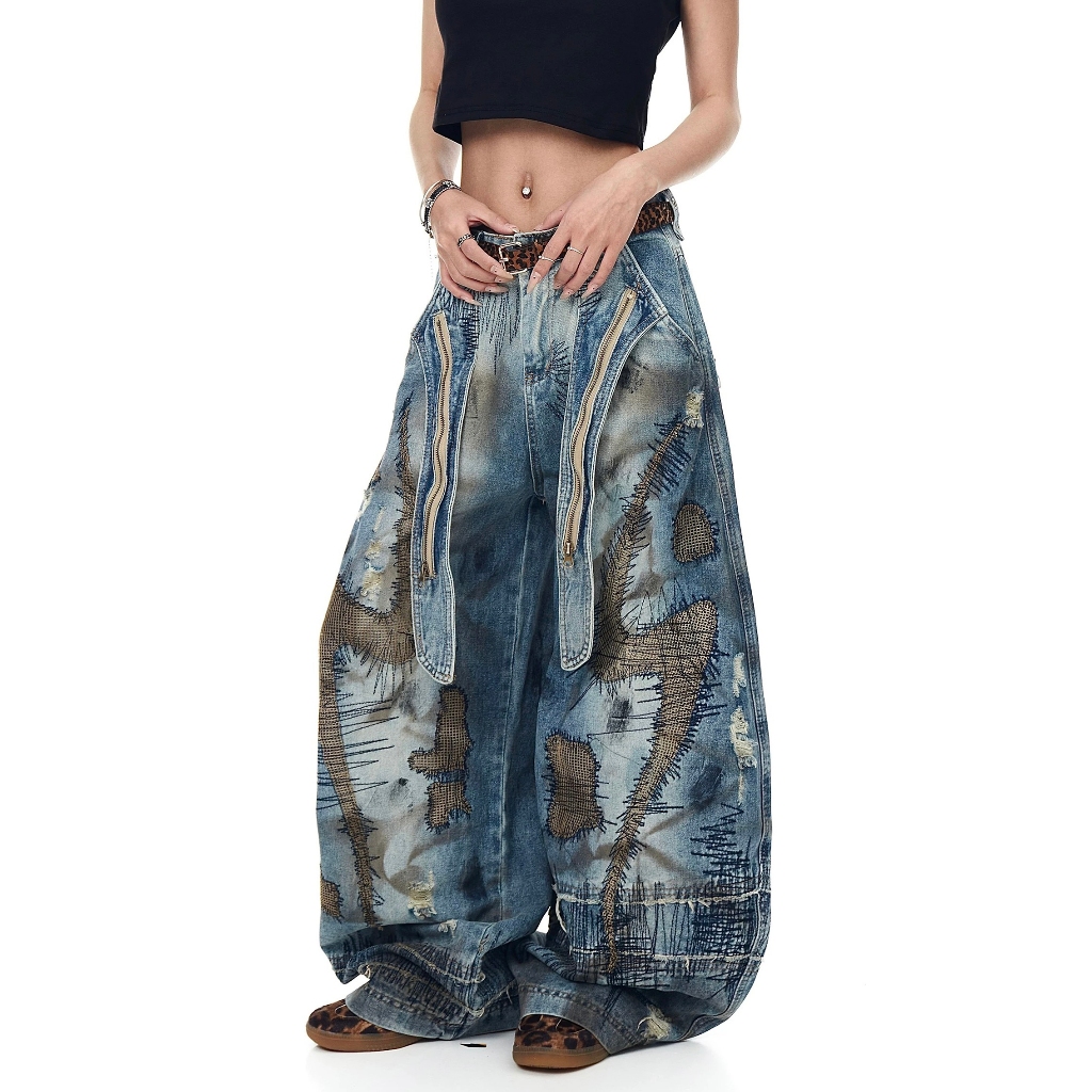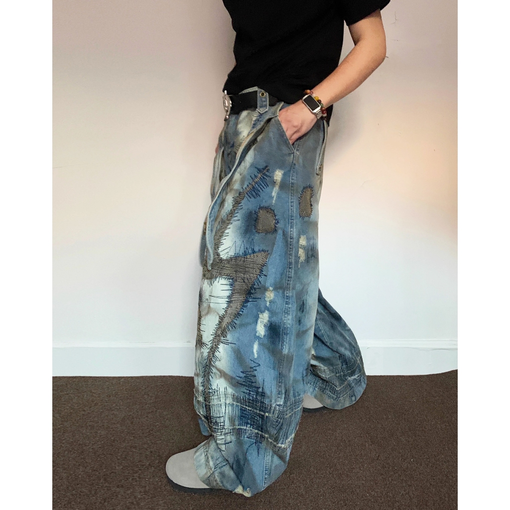【K-2】美式復古 亂針補丁 刷舊水洗 拉鍊腰繩 牛仔彎刀褲 彎刀褲 造型長褲 牛仔褲 長褲 特殊 K2【JN6096】M|L|XL|XXLK-2 Fashionboy