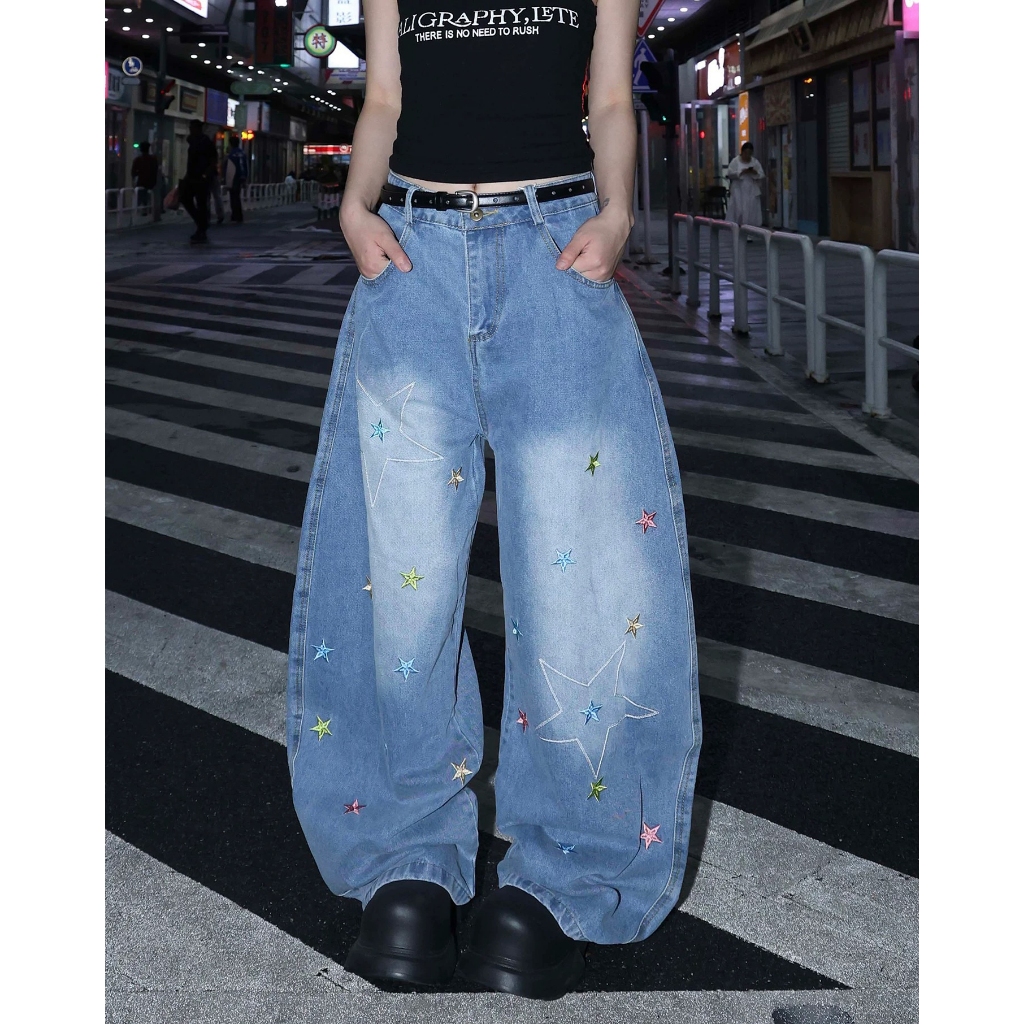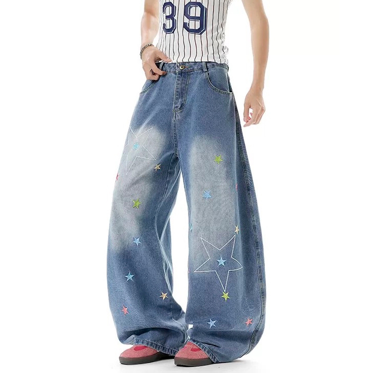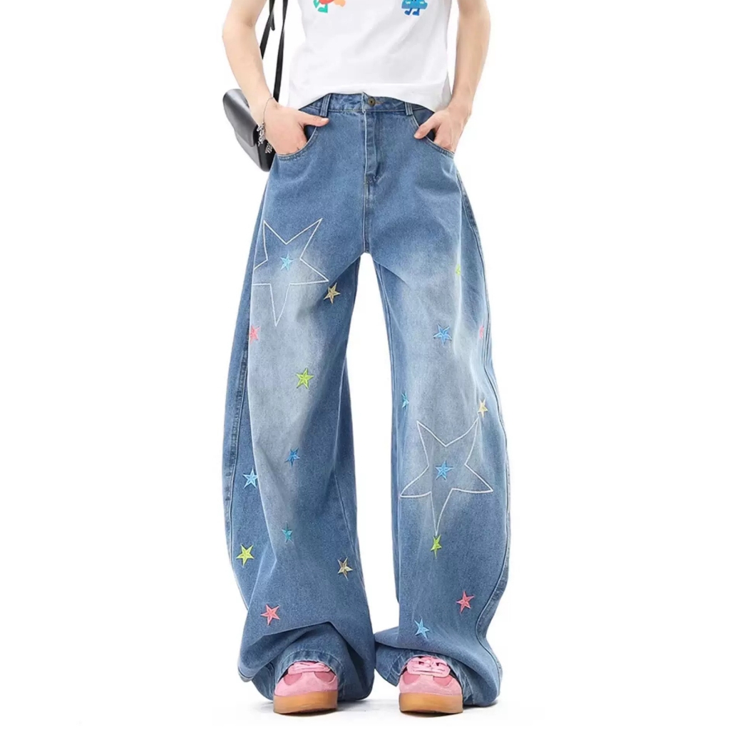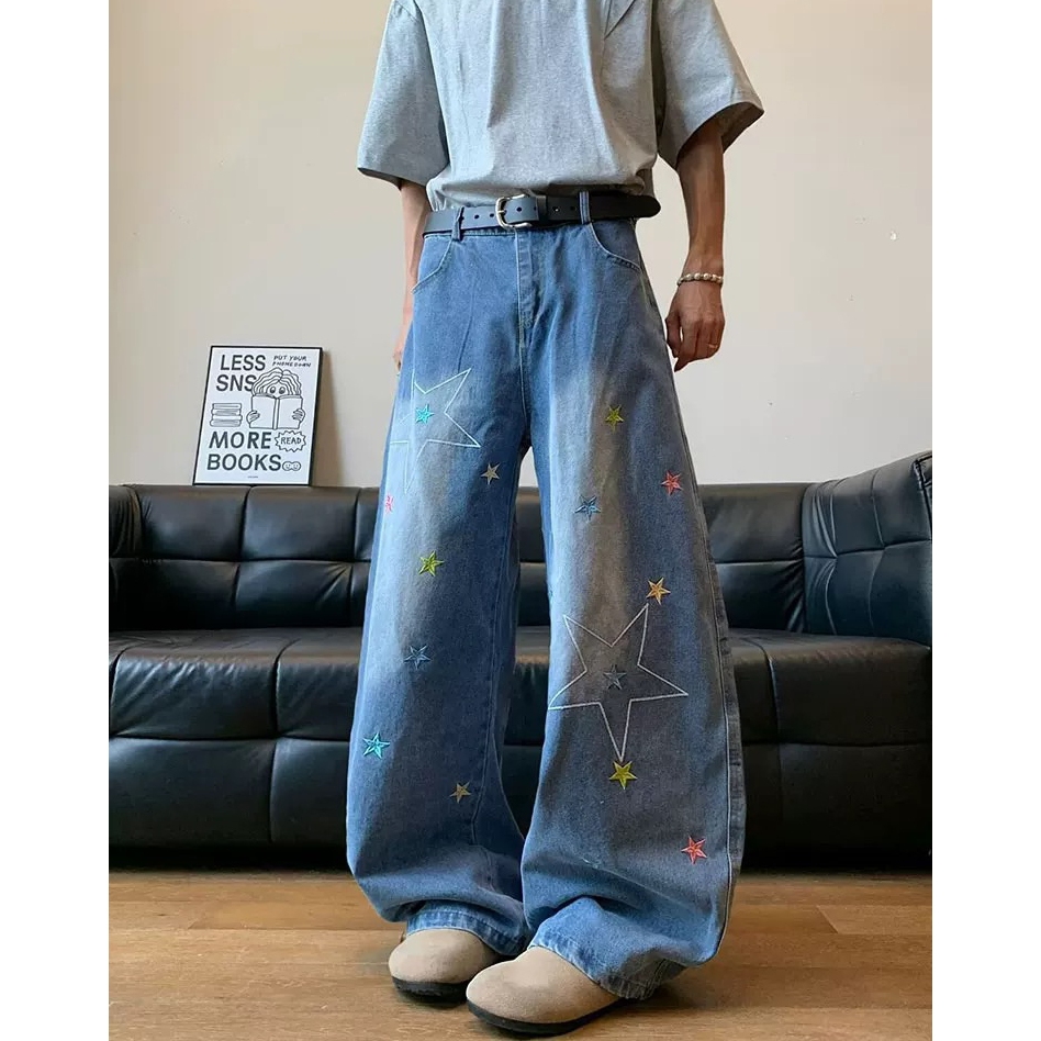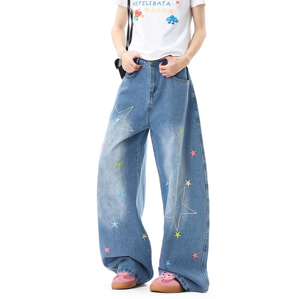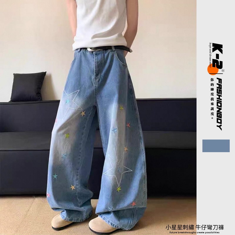 【K-2】美式休閒 星星刺繡 彩色 小星星 牛仔彎刀褲 闊腿褲 彎刀褲 牛仔長褲 美式 復古長褲 Y2K【JN6089】M|L|XL|XXLK-2 Fashionboy