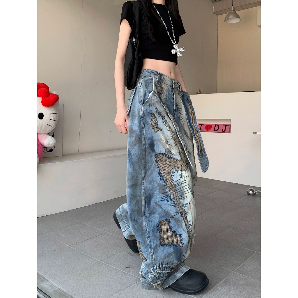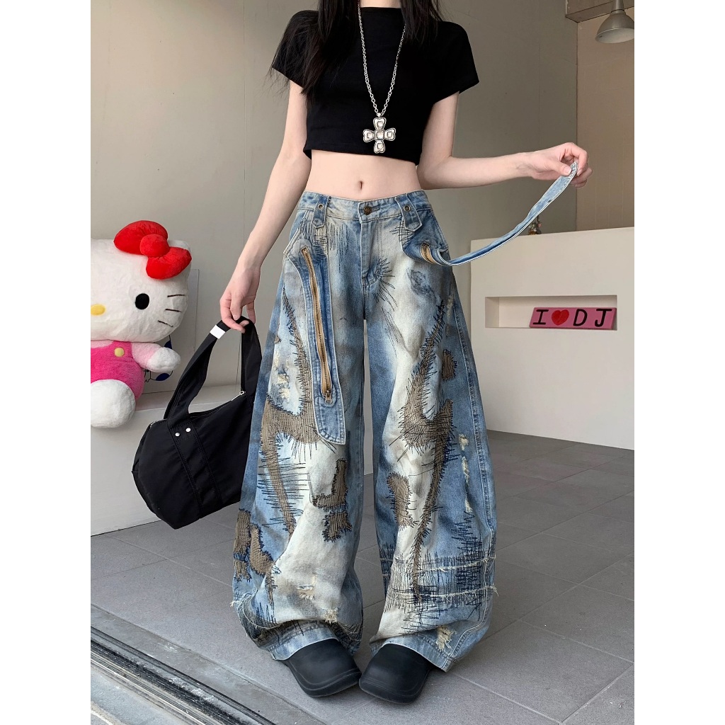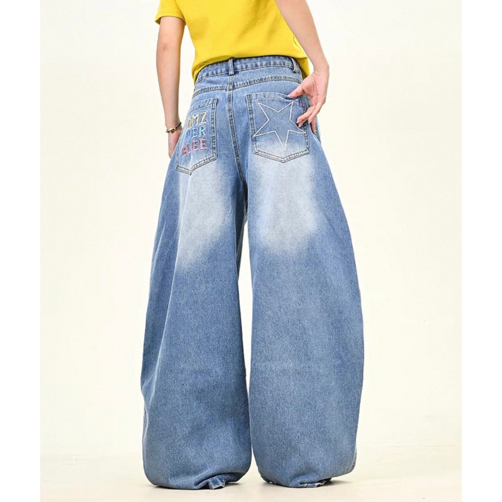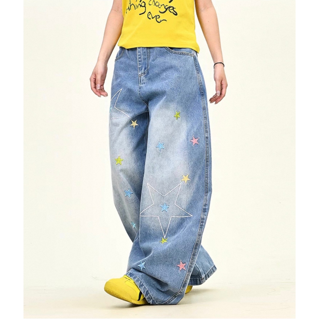 【K-2】美式休閒 星星刺繡 彩色 小星星 牛仔彎刀褲 闊腿褲 彎刀褲 牛仔長褲 美式 復古長褲 Y2K【JN6089】M|L|XL|XXLK-2 Fashionboy