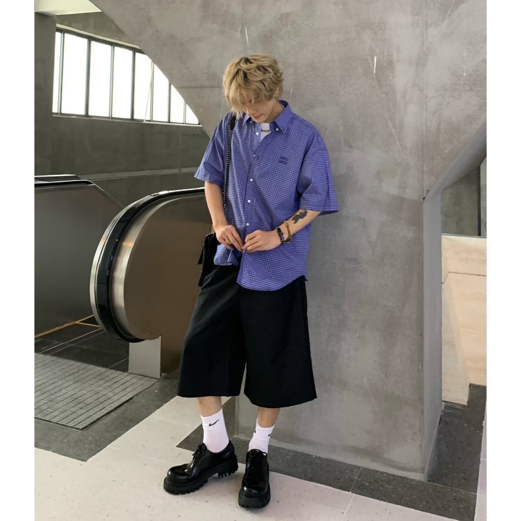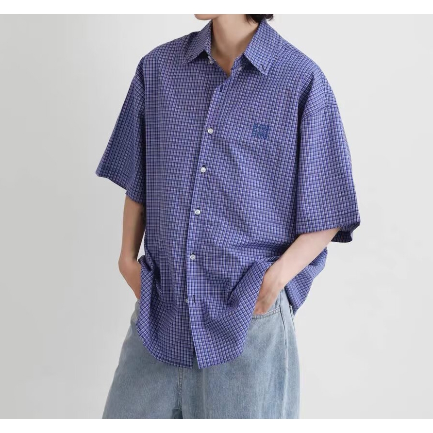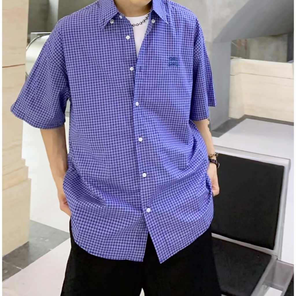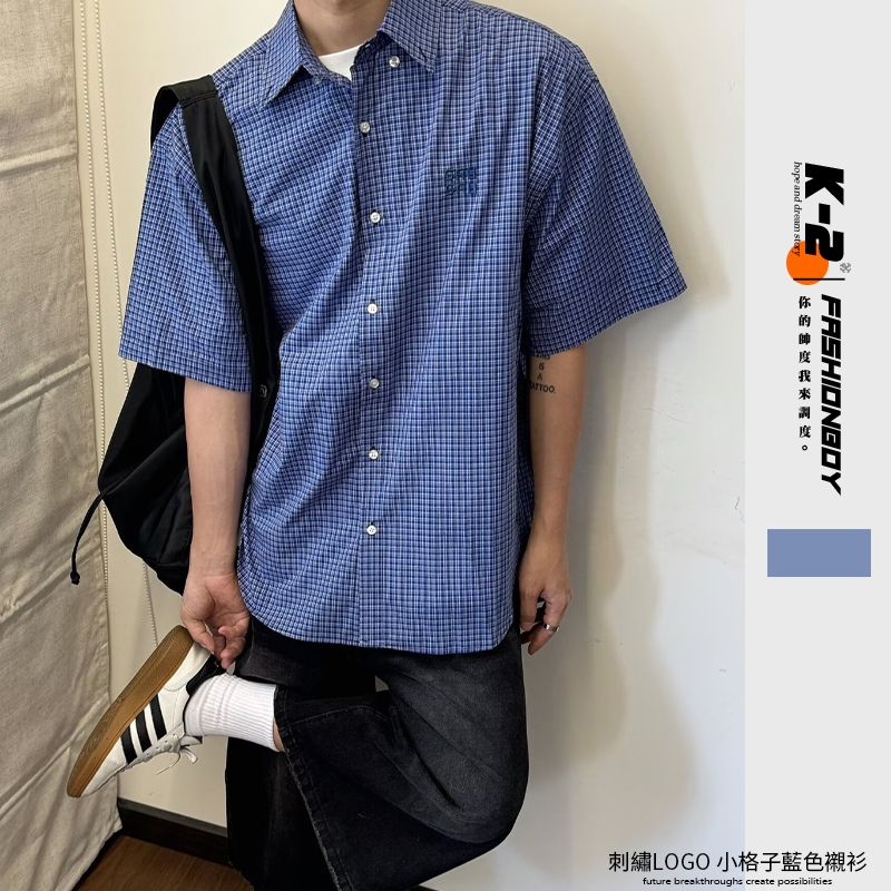 【K-2】刺繡LOGO 小格子 格紋襯衫 藍色襯衫 短袖襯衫 Y2K 襯衫 格子襯衫 復古襯衫 K2【JC354】M|LShirtsK-2 Fashionboy