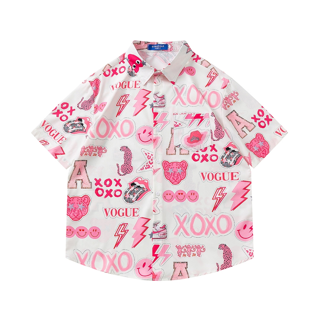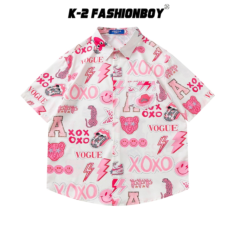 【K-2】粉紅泡泡 XOXO 笑臉 閃電 滿版 短袖襯衫 個性 穿搭 春夏 表演 舞台 特色【J2560】M|L|XL|XXLShirtsK-2 Fashionboy