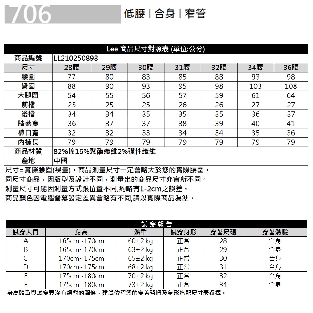 Lee 706 彈性低腰合身窄管牛仔褲 男 Modern LL21025089828(腰圍77公分)|29(腰圍80公分)|30(腰圍83公分)|31(腰圍85公分)|32(腰圍88公分)|34(腰圍93公分)Lee Jeans 品牌旗艦店