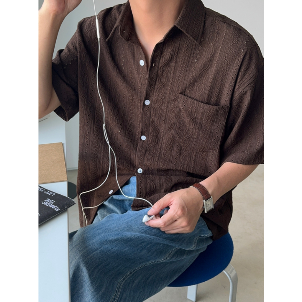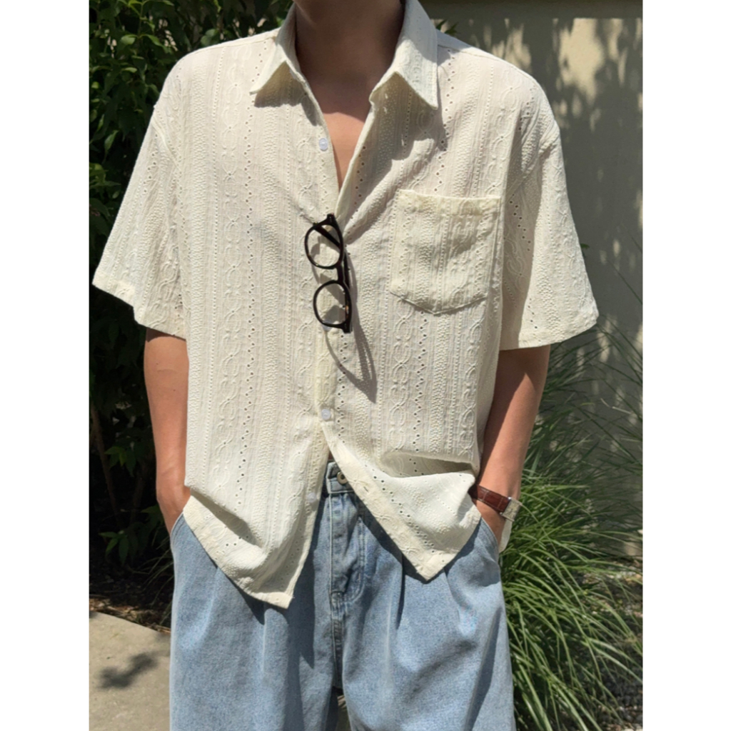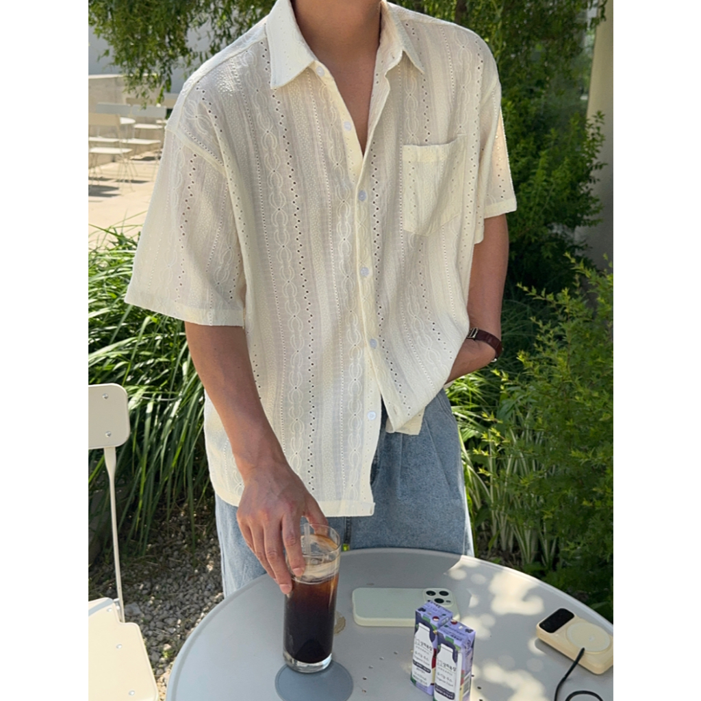 【Metanoia】韓國設計 鏤空短袖襯衫奶油色,F|棕色,FShirtsMetanoia 正韓服飾 & MdoC 總代理