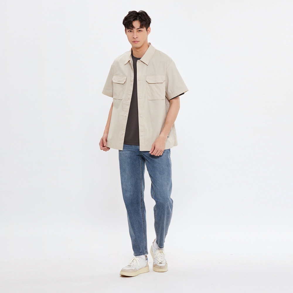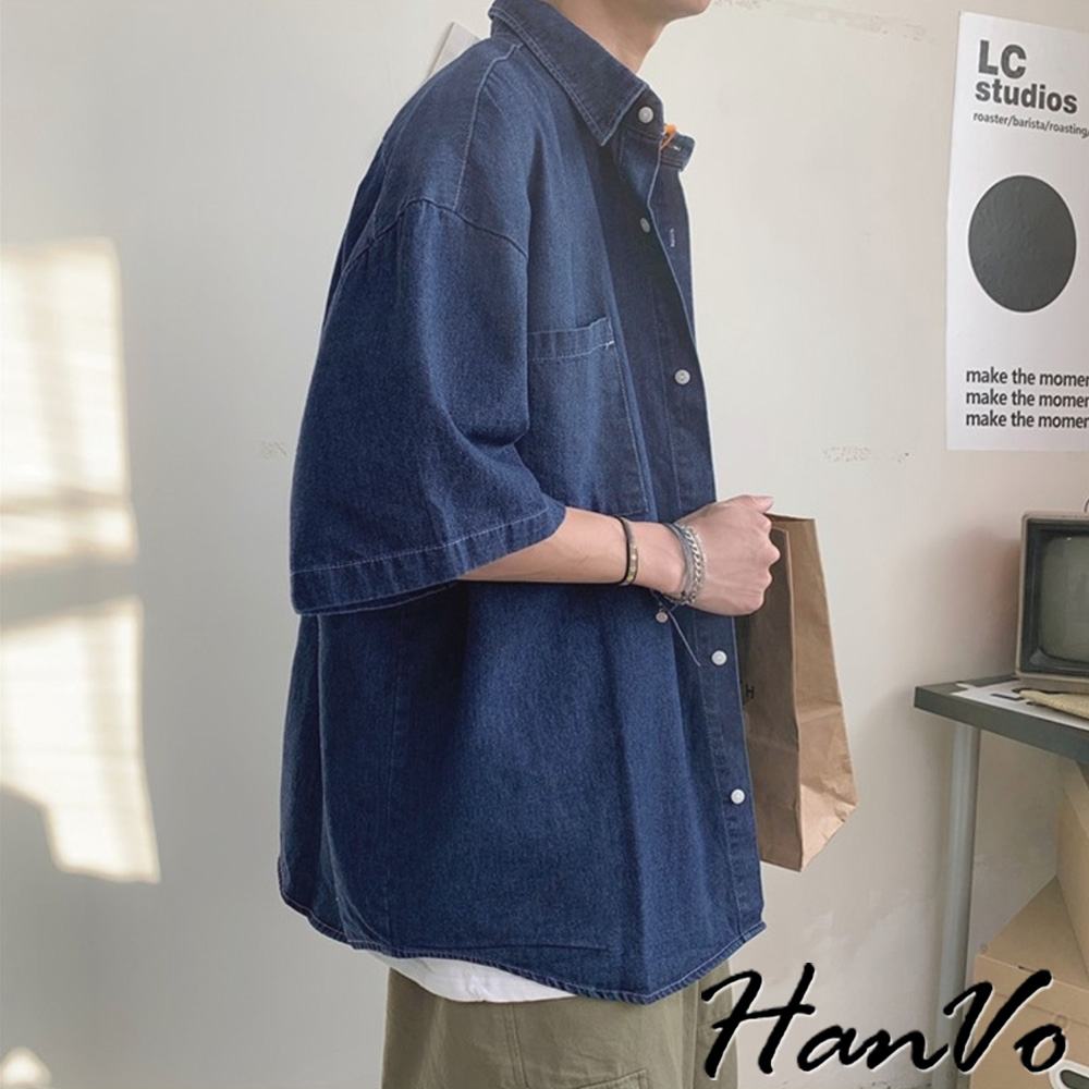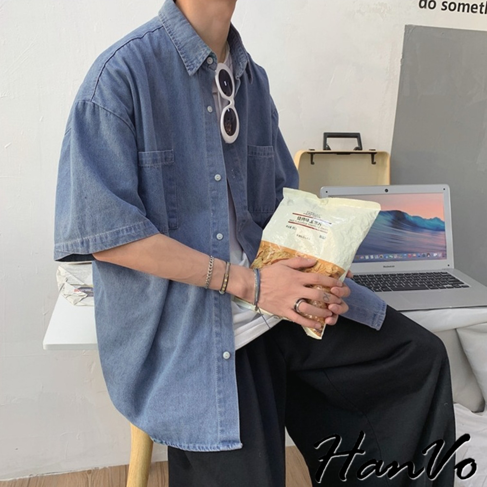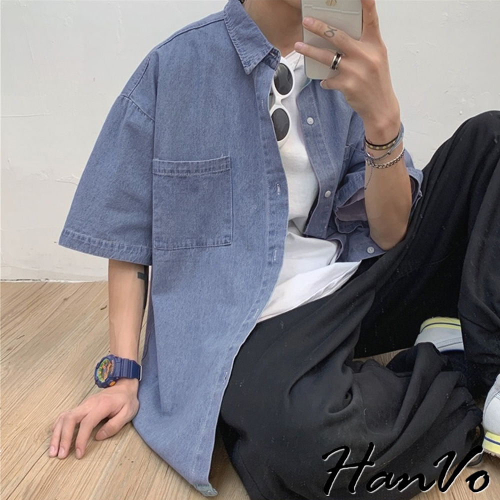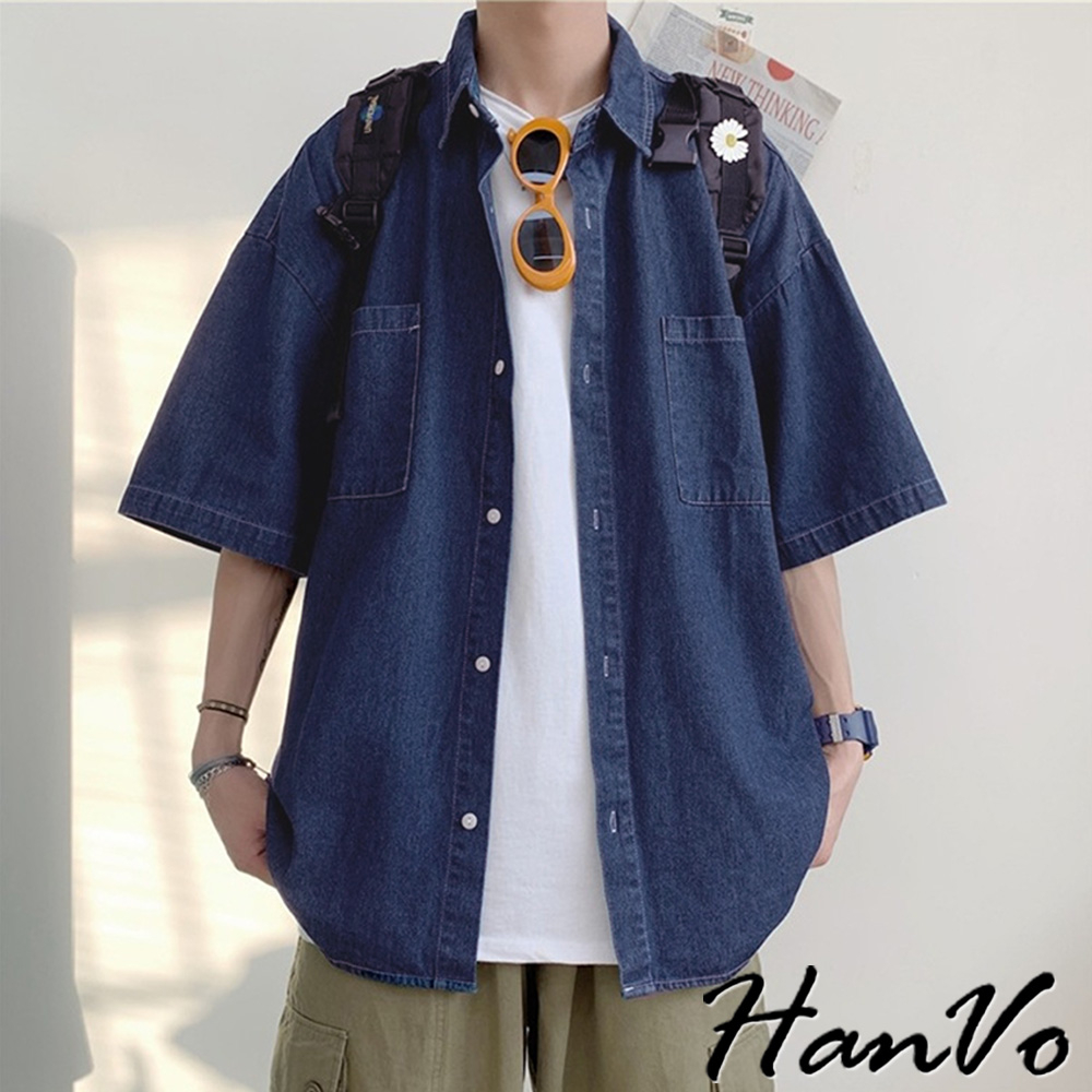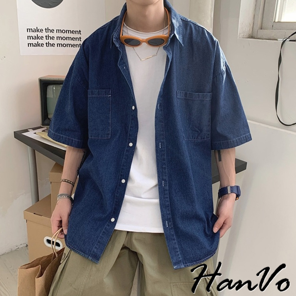 【HanVo】男款休閒寬鬆牛仔短袖襯衫 舒適透氣潮流復古工裝上衣 韓版夏季T恤 男生衣著 B01-1016淺藍|深藍ShirtsHanVo Wear Collection