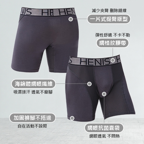 • (超值六件組)HENIS 透氣網孔運動機能蜂巢褲 四角褲 網眼內褲 冰絲網眼 防燒檔 henis 長版內褲 涼感內褲