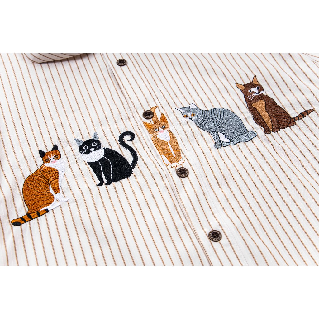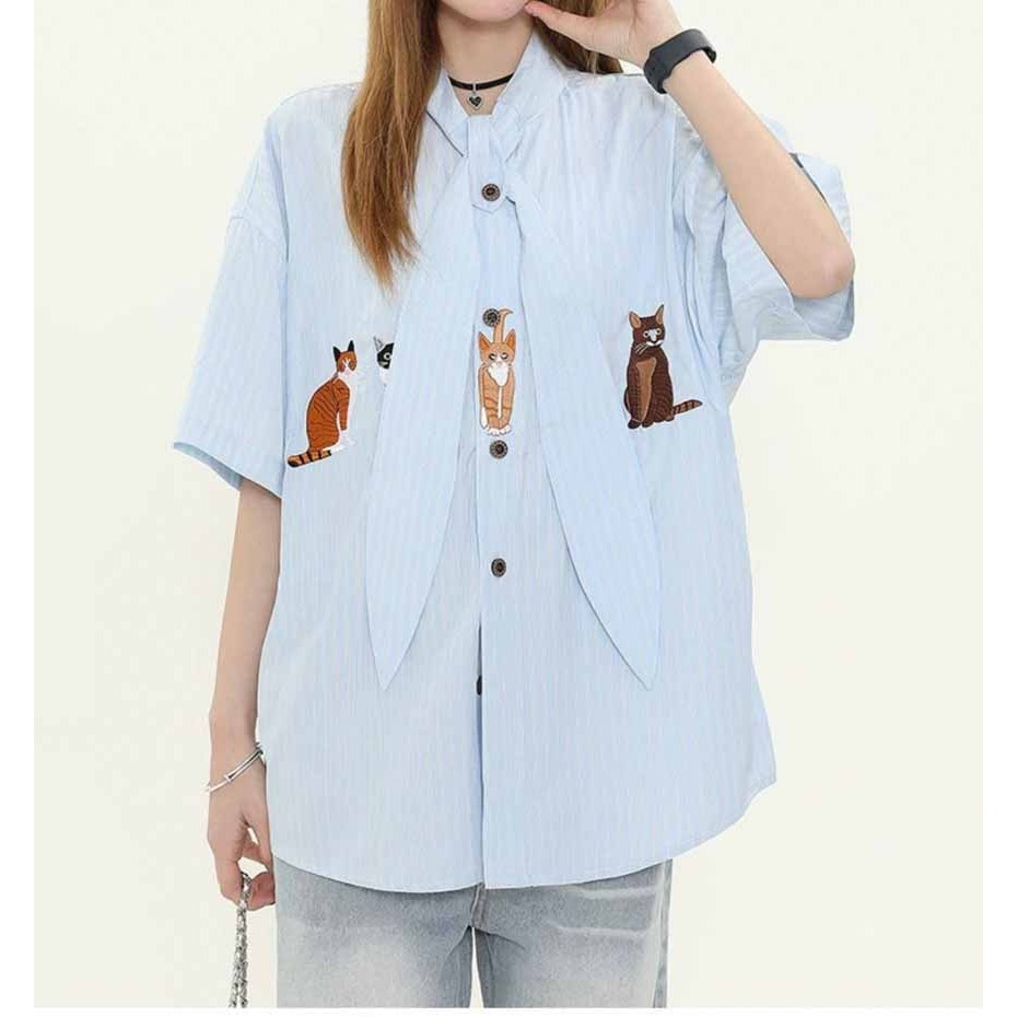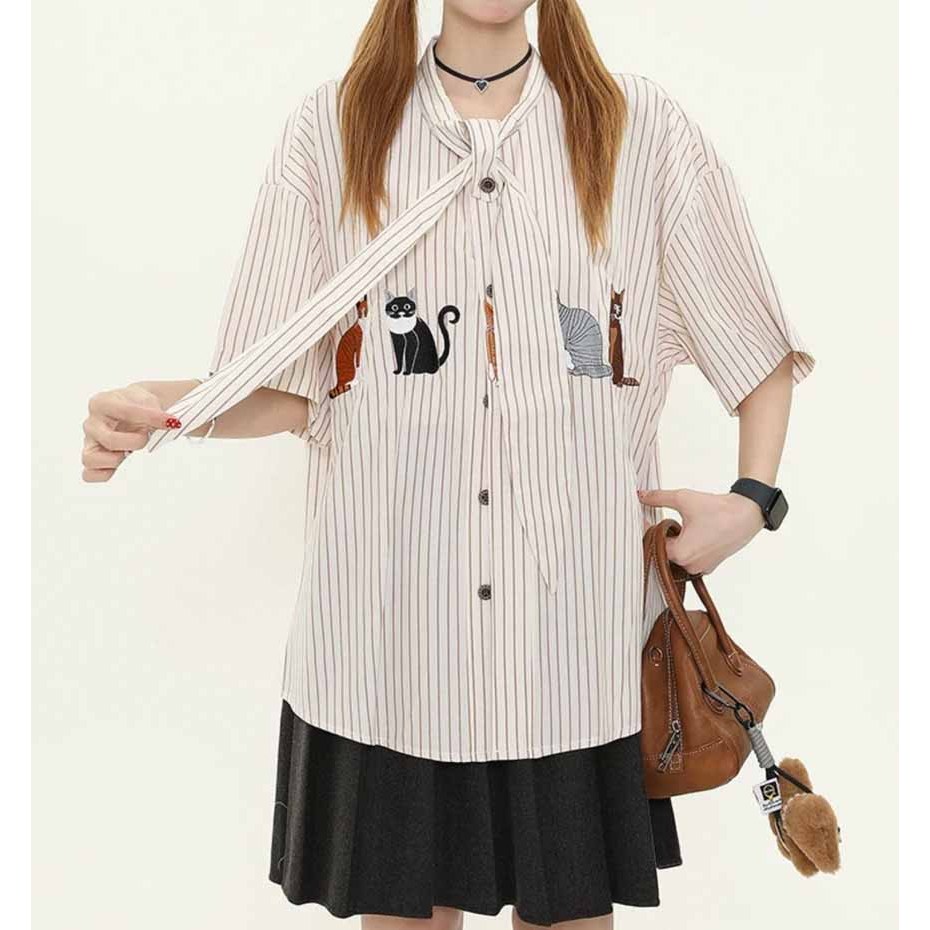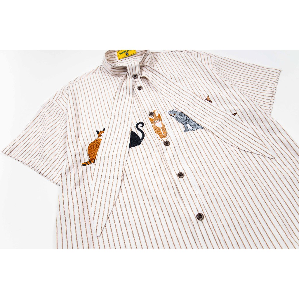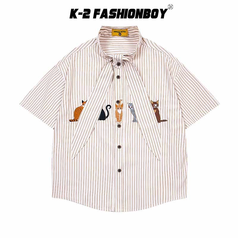 【K-2】貓咪 動物 條紋 短袖襯衫 領帶設計 超Q 文青 穿搭 男女不拘 刺繡 質感 直條紋【JU2518】藍,L|藍,XL|杏,M|杏,L|杏,XL|藍,MShirtsK-2 Fashionboy