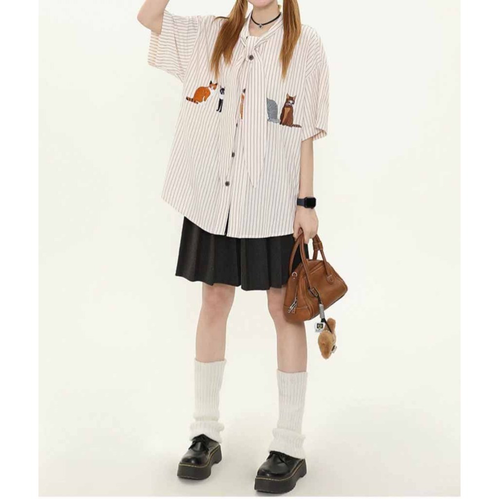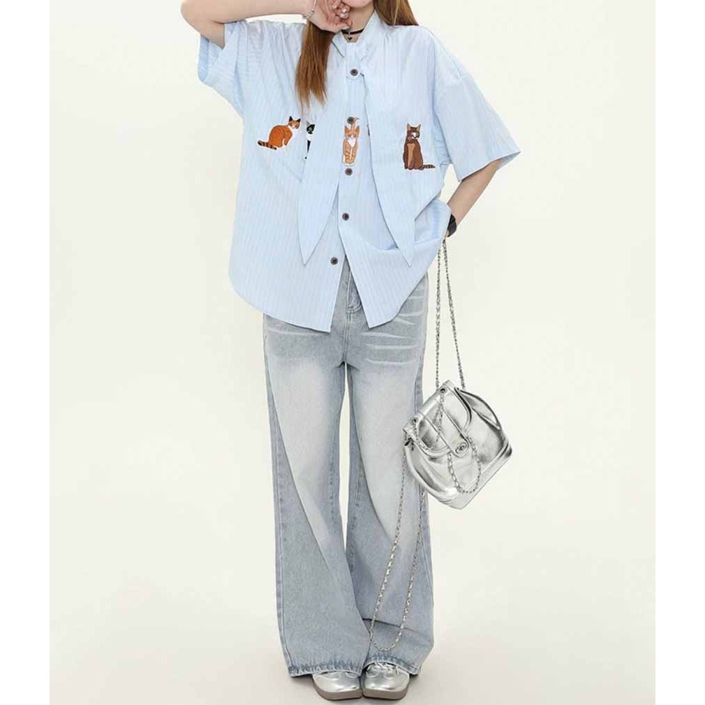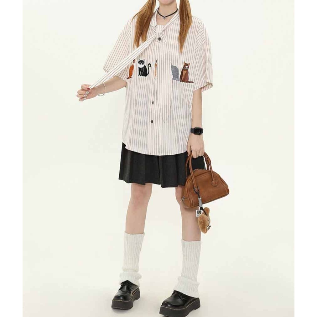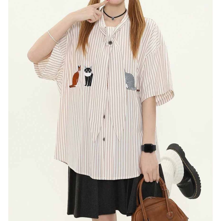 【K-2】貓咪 動物 條紋 短袖襯衫 領帶設計 超Q 文青 穿搭 男女不拘 刺繡 質感 直條紋【JU2518】藍,L|藍,XL|杏,M|杏,L|杏,XL|藍,MShirtsK-2 Fashionboy