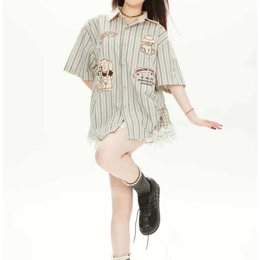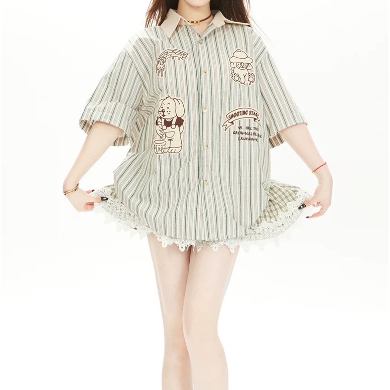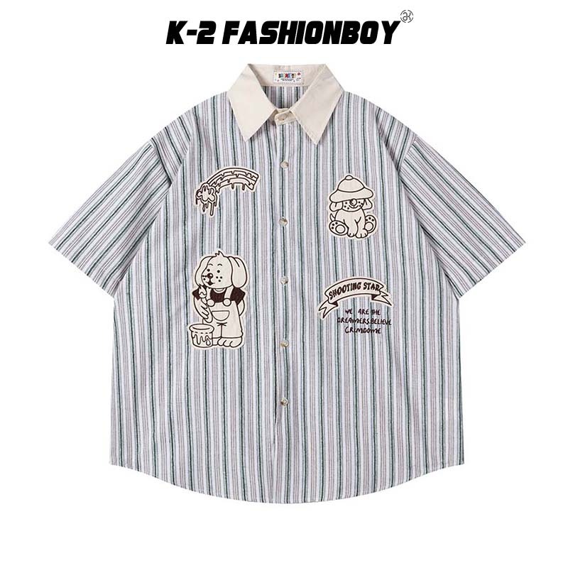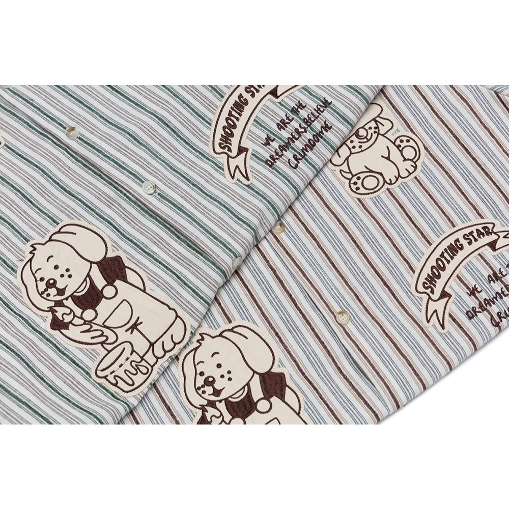 【K-2】SHOOTING STAR 美式 刺繡 小圖 小狗 貼布 短袖襯衫 條紋襯衫 穿搭 寬鬆落肩 情侶【JU35】咖條,M|咖條,L|咖條,XL|綠條,M|綠條,L|綠條,XLShirtsK-2 Fashionboy