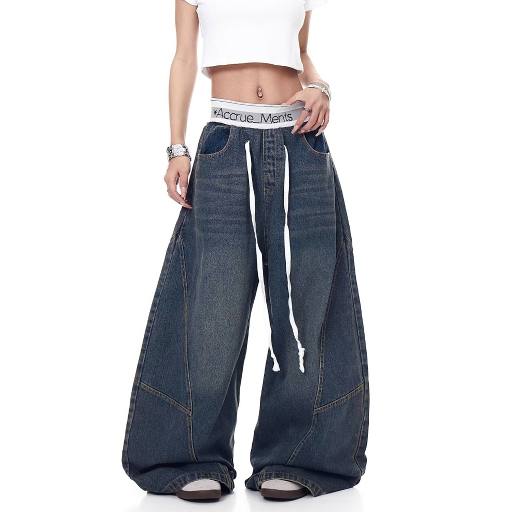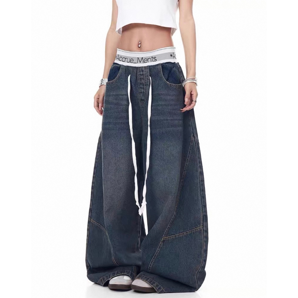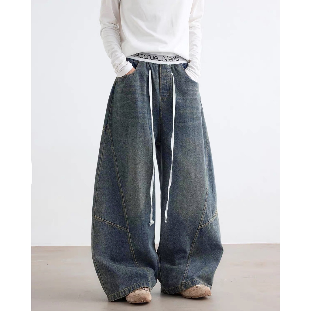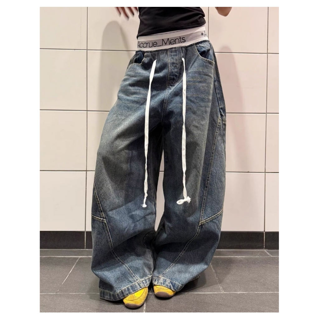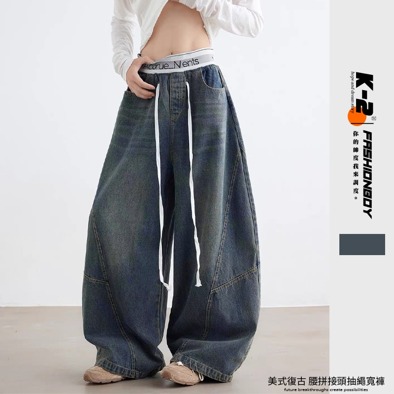 【K-2】美式休閒 褲頭拼接 長抽繩 解構線條 筏木 工裝寬褲 直筒褲 闊腿褲 彎刀褲 牛仔褲 長褲 K【JN7025】M|L|XL|XXLK-2 Fashionboy