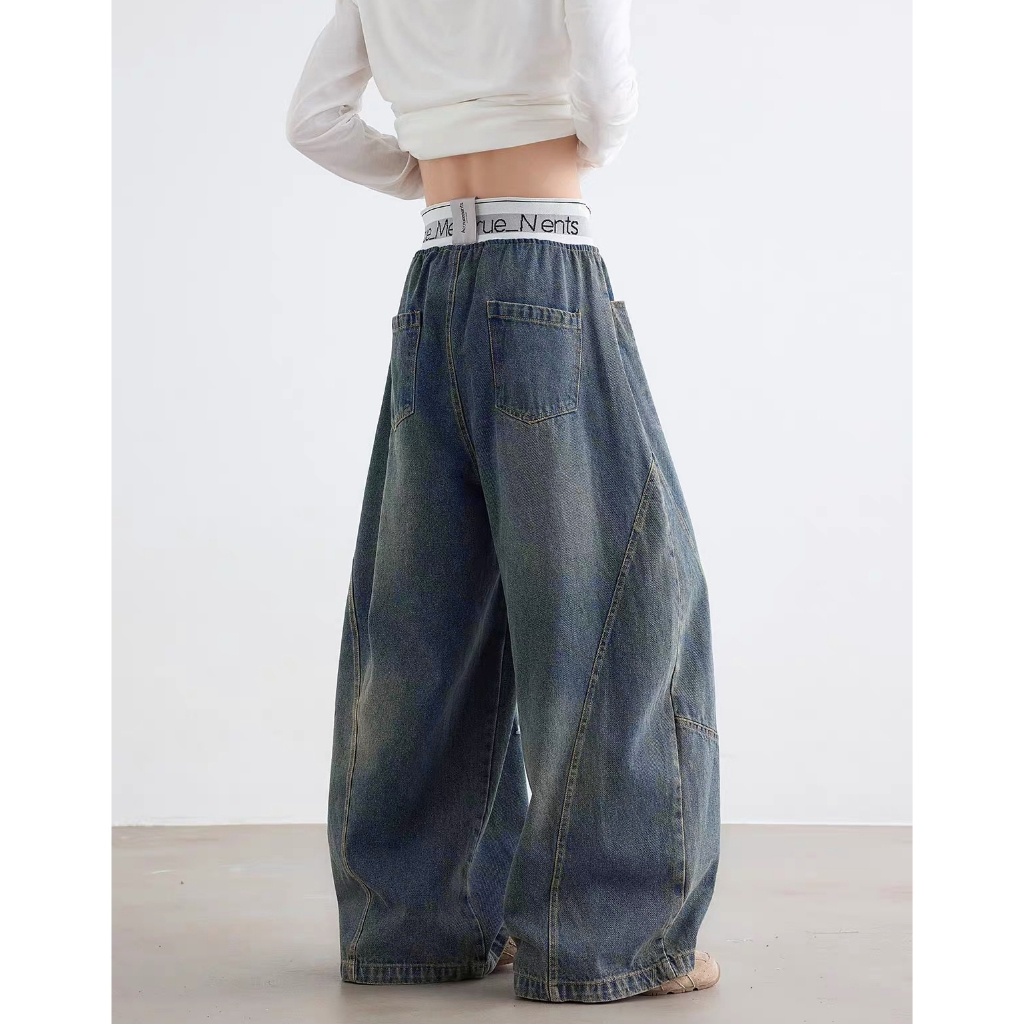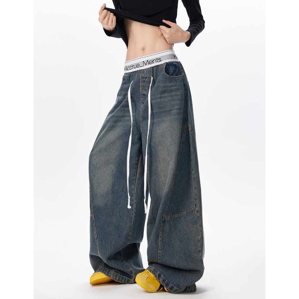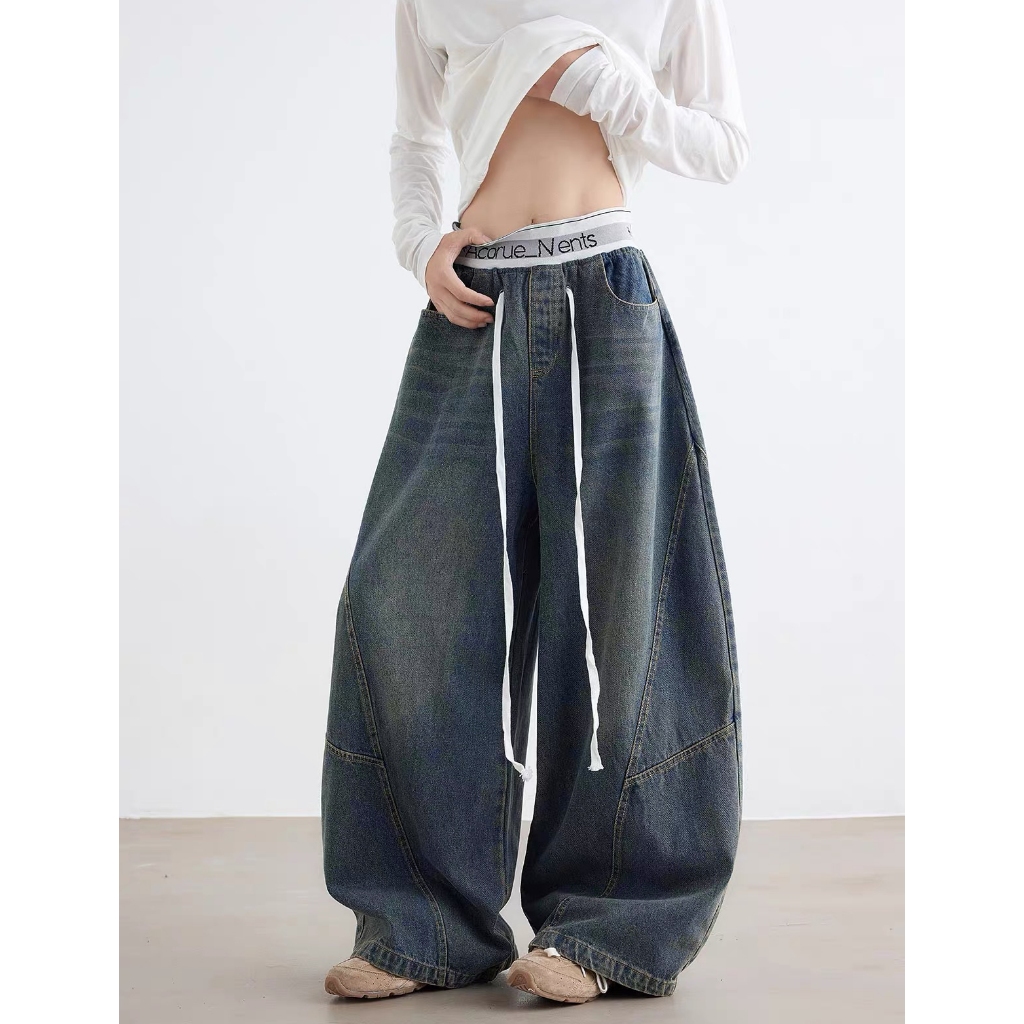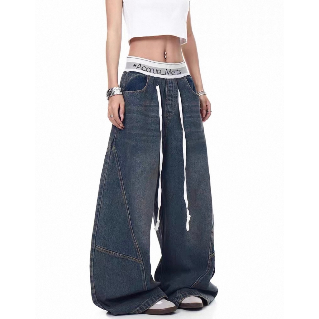 【K-2】美式休閒 褲頭拼接 長抽繩 解構線條 筏木 工裝寬褲 直筒褲 闊腿褲 彎刀褲 牛仔褲 長褲 K【JN7025】M|L|XL|XXLK-2 Fashionboy