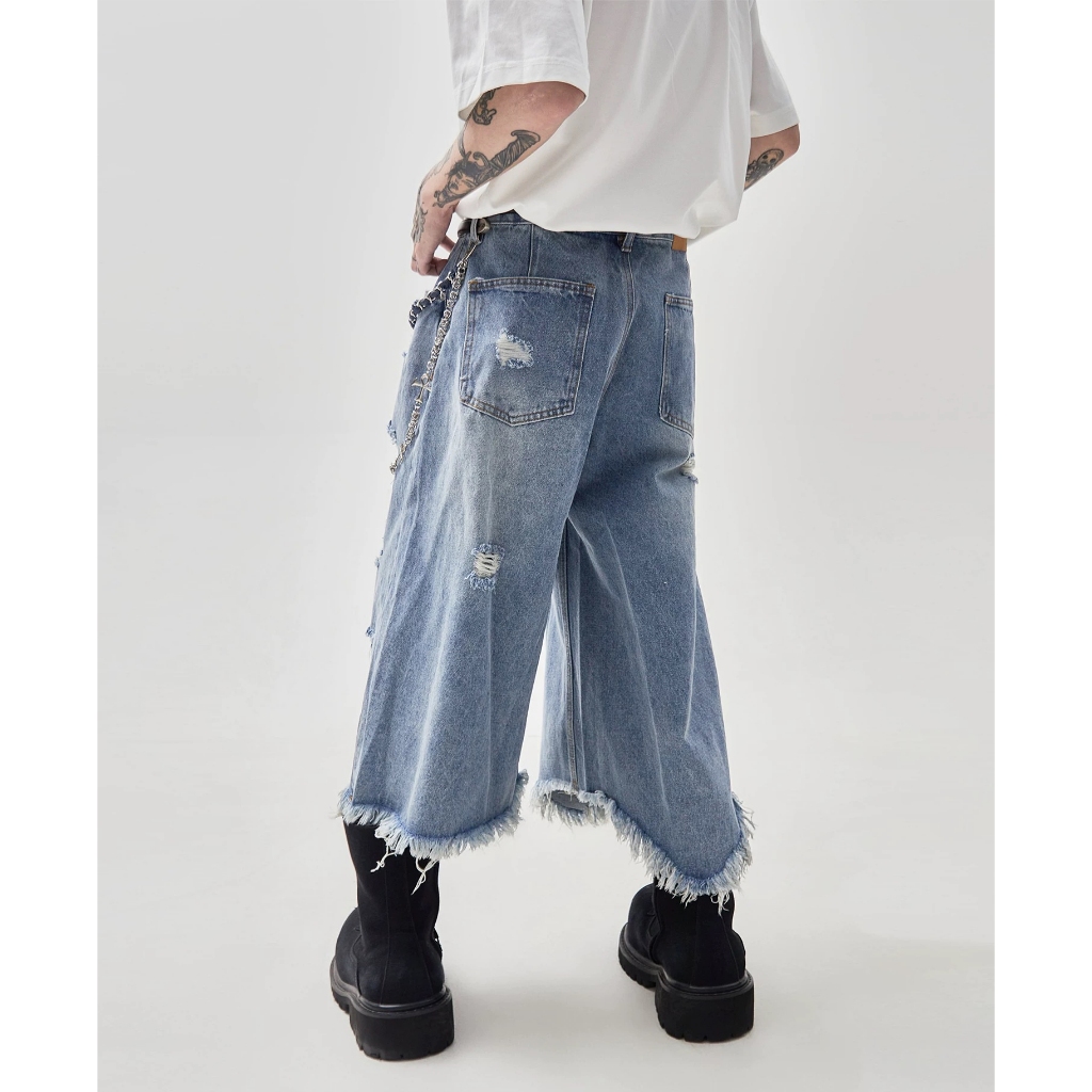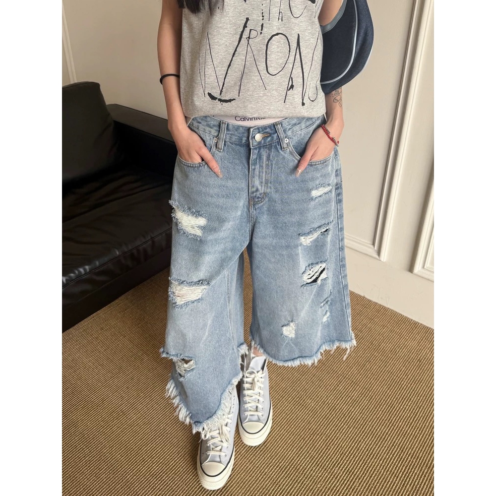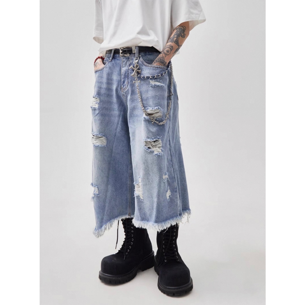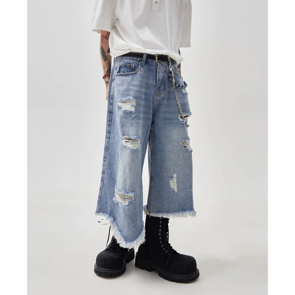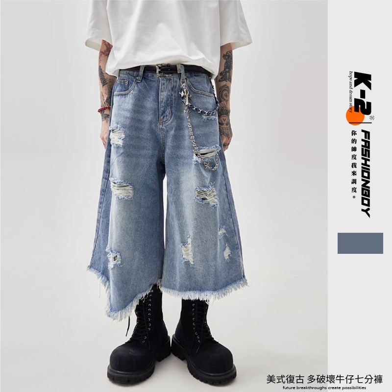 【K-2】美式復古 多破壞 流蘇毛邊 牛仔七分褲 寬褲 破褲 牛仔短褲 七分褲 牛仔褲 短褲 磨毛 破洞【JD664】M|L|XL|XXLK-2 Fashionboy