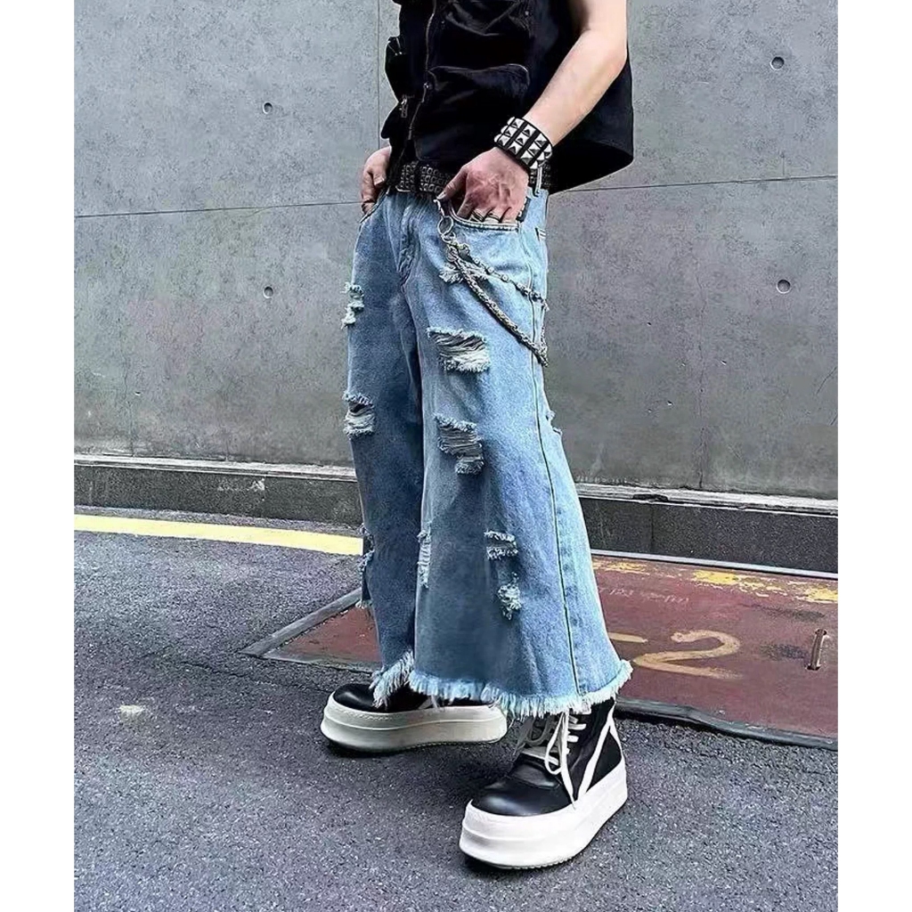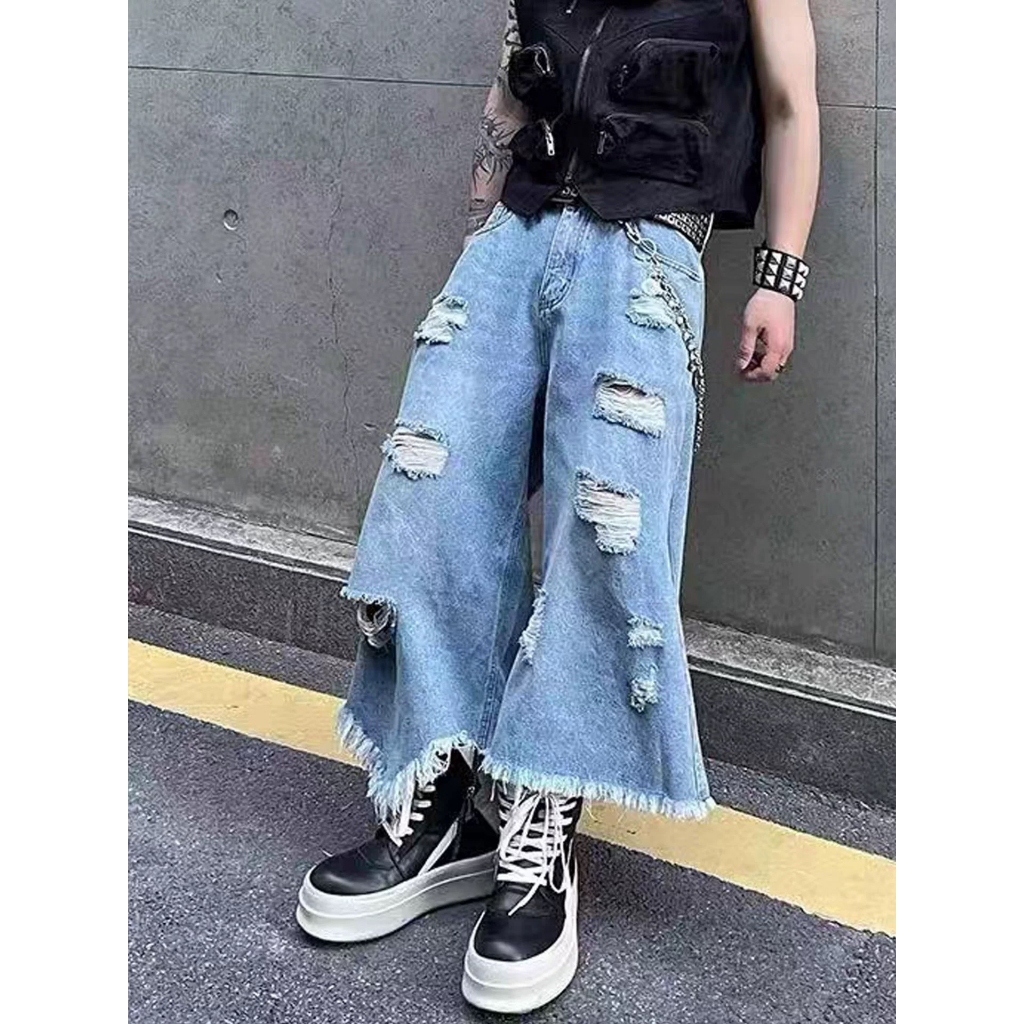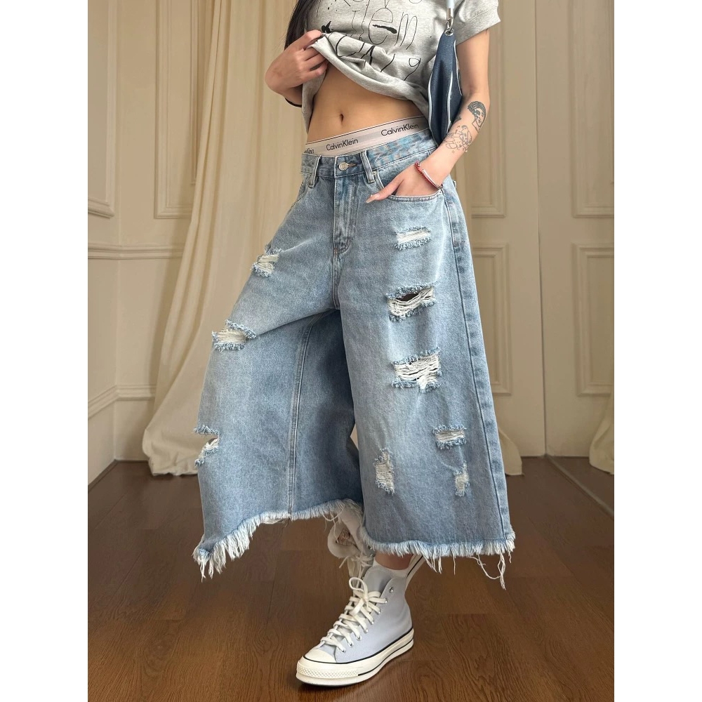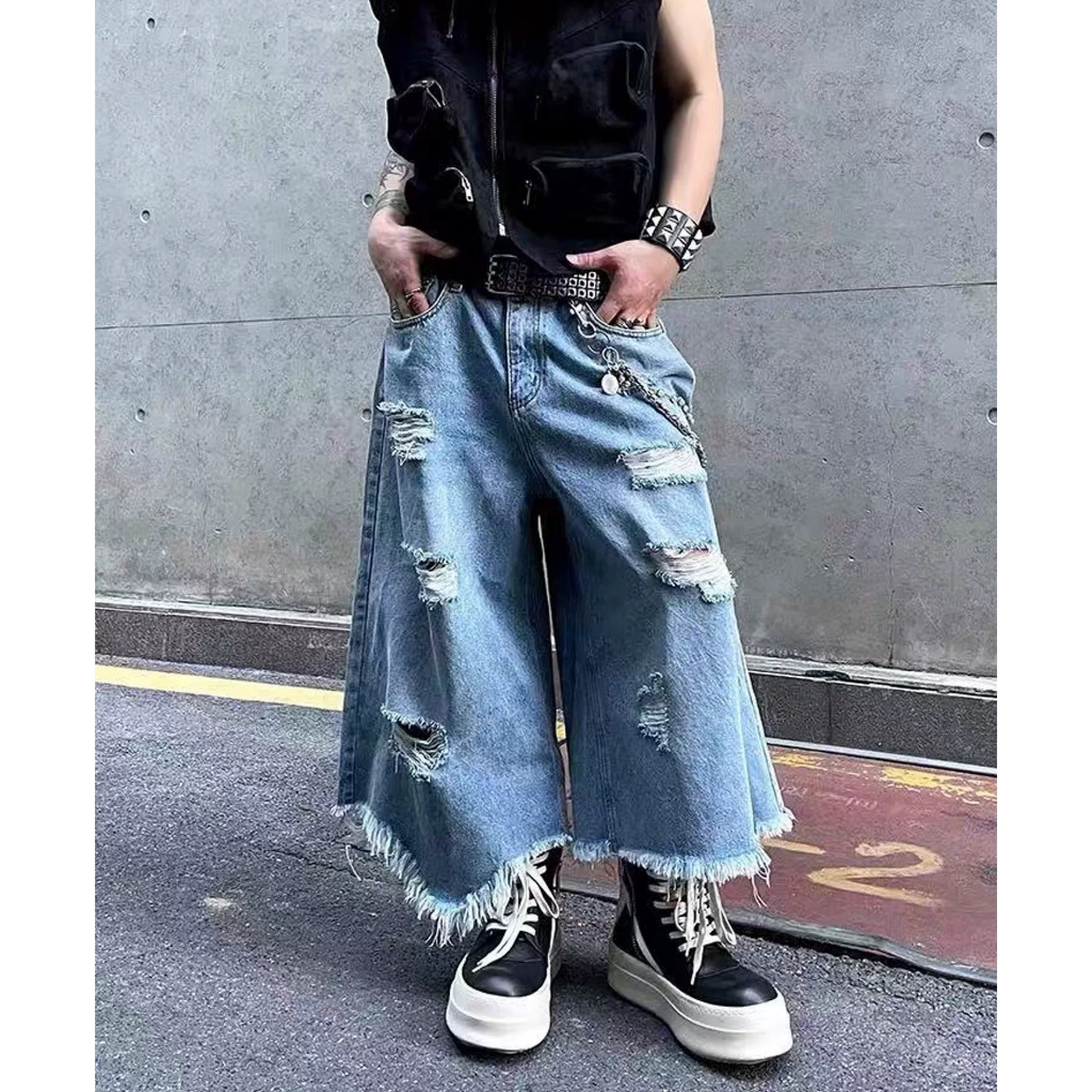 【K-2】美式復古 多破壞 流蘇毛邊 牛仔七分褲 寬褲 破褲 牛仔短褲 七分褲 牛仔褲 短褲 磨毛 破洞【JD664】M|L|XL|XXLK-2 Fashionboy