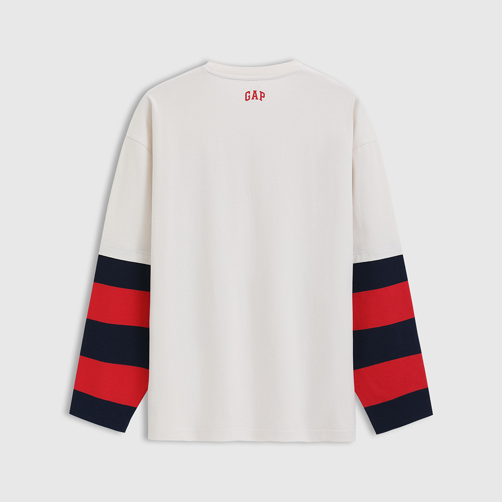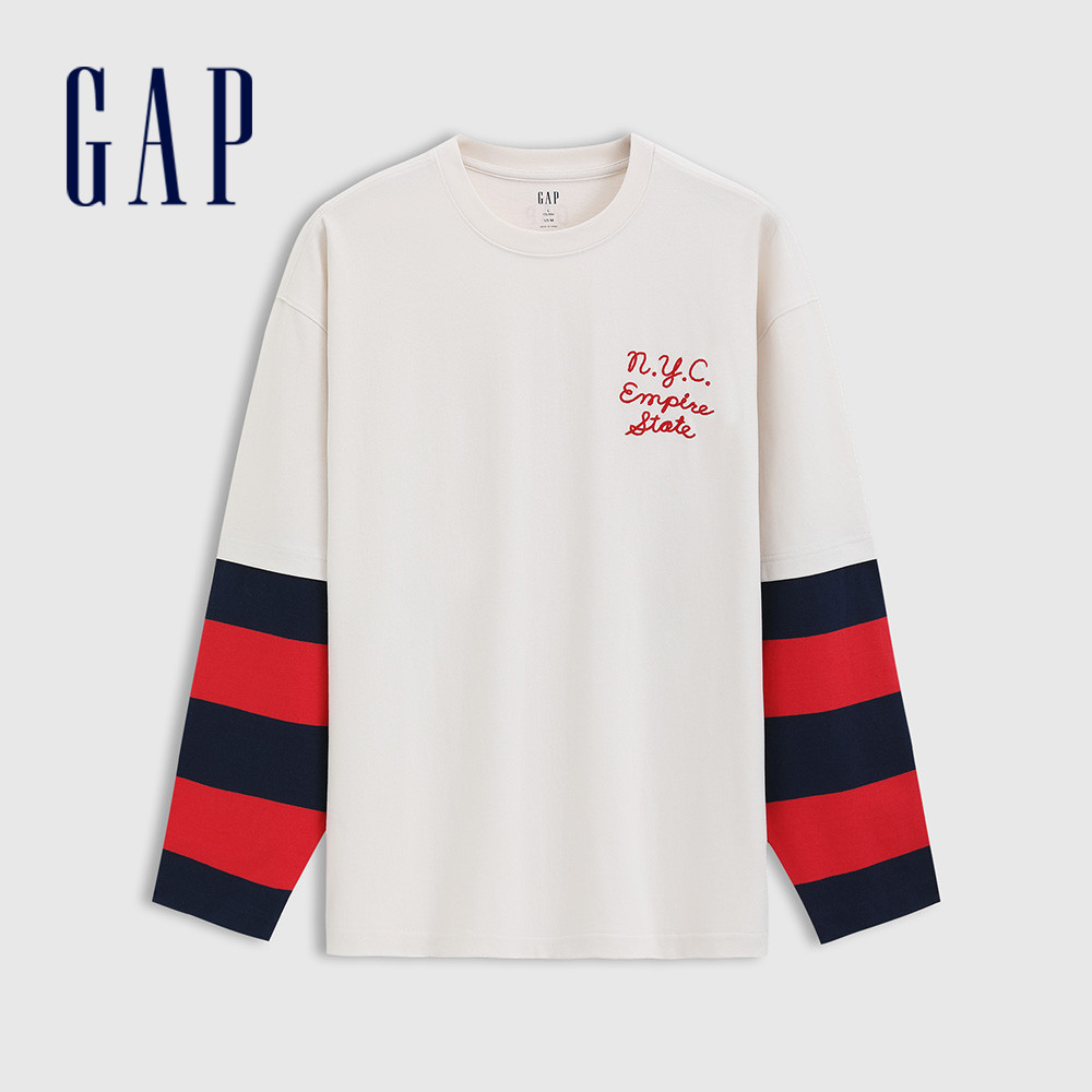 Gap 男裝 Logo純棉刺繡印花假兩件圓領長袖T恤 水洗棉系列-灰白色(723825)XL|XXL|XXXL|S|M|LT-ShirtsGap官方旗艦店