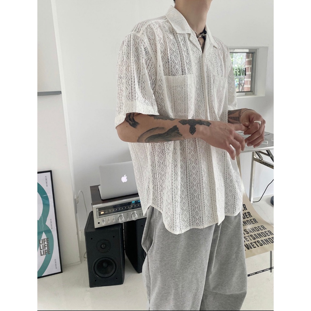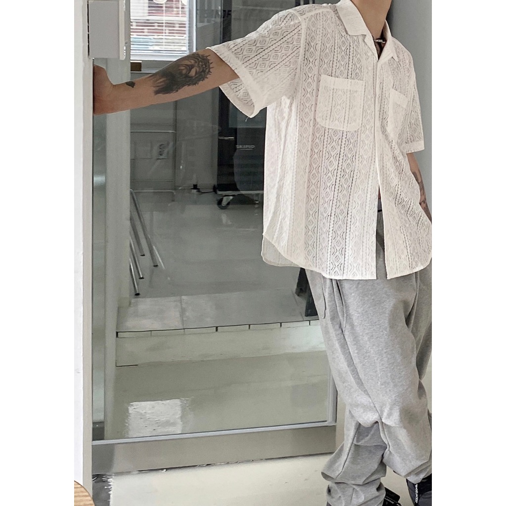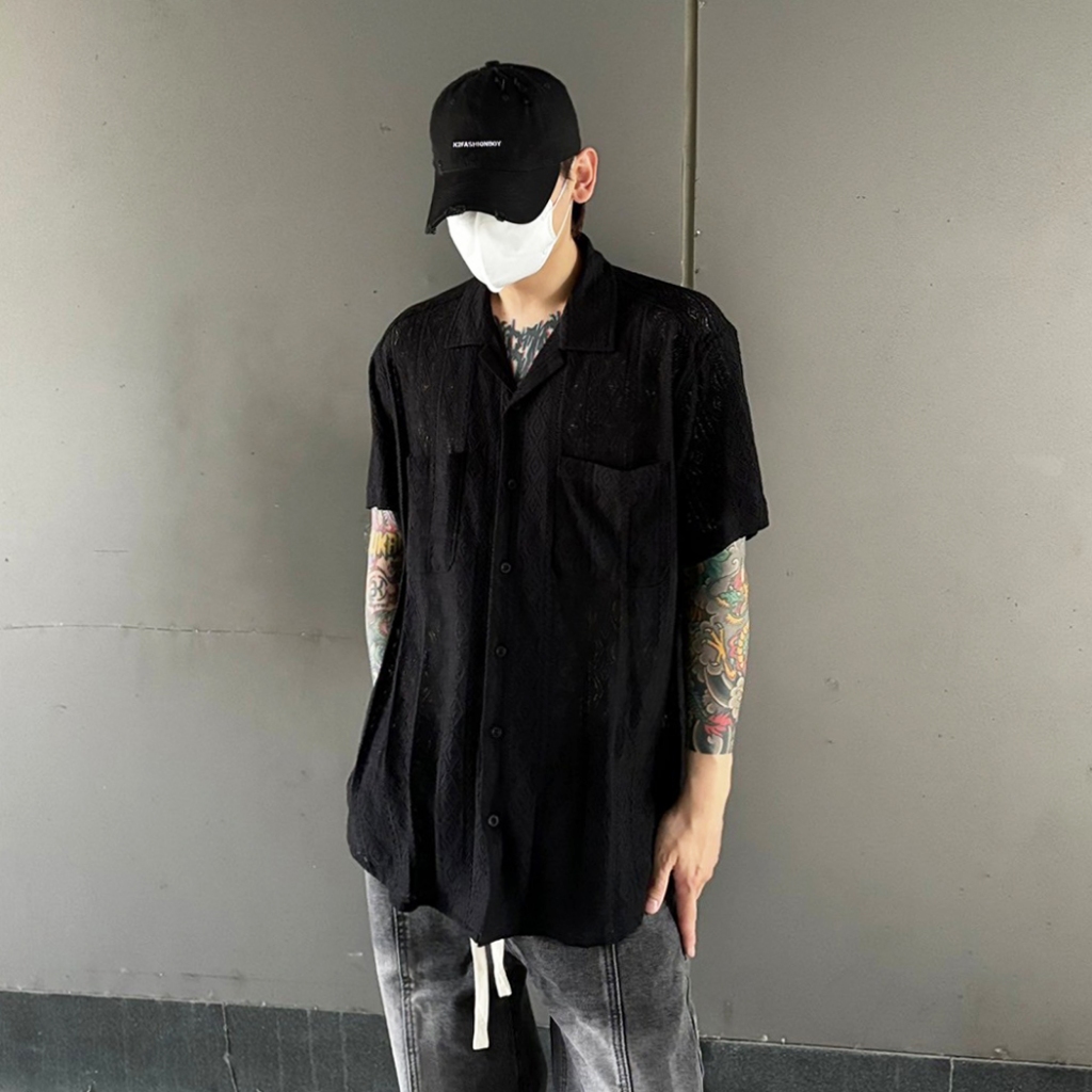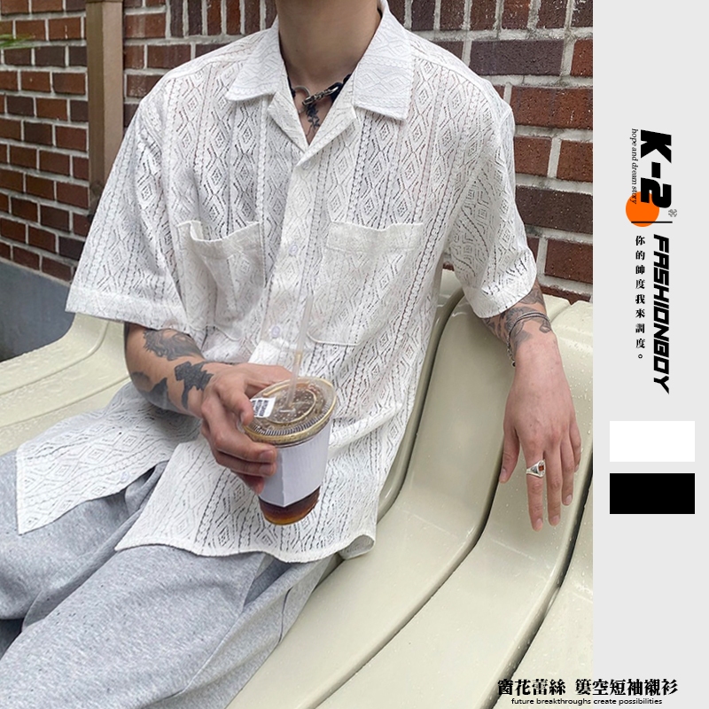 【K-2】INS 小眾穿搭 窗花 蕾絲 簍空襯衫 Y2K 雙口袋 短袖襯衫 蕾絲襯衫 簍空 復古圖騰 男女【K2R06】白色|黑色ShirtsK-2 Fashionboy