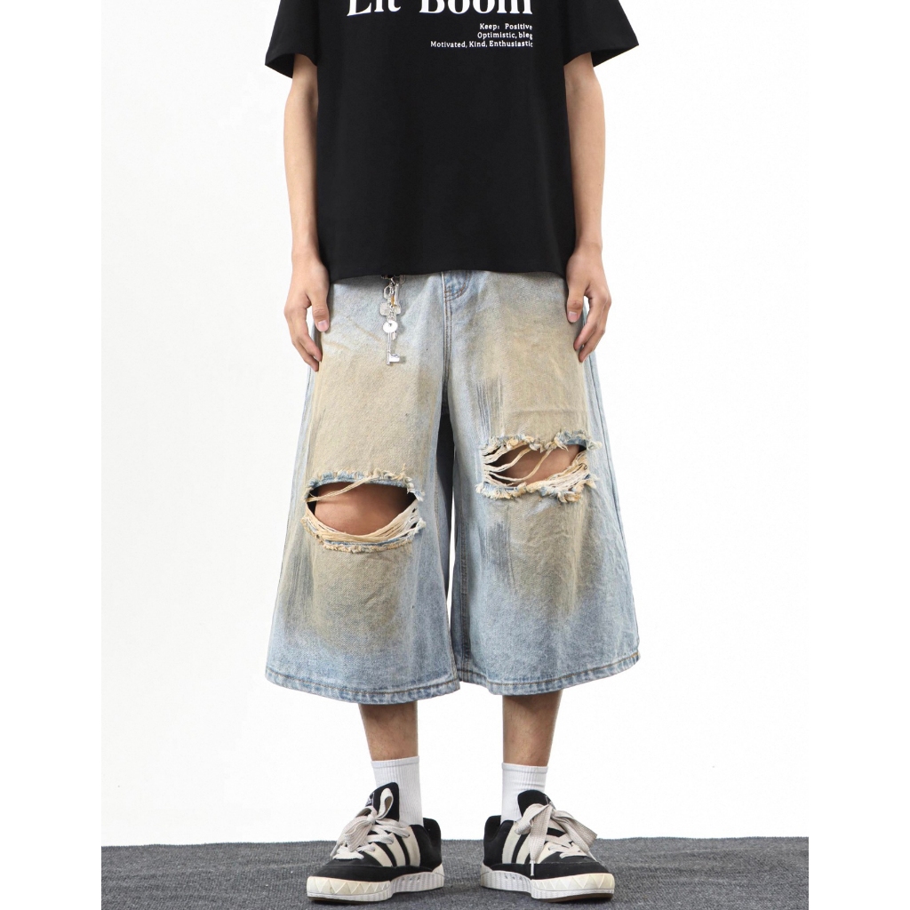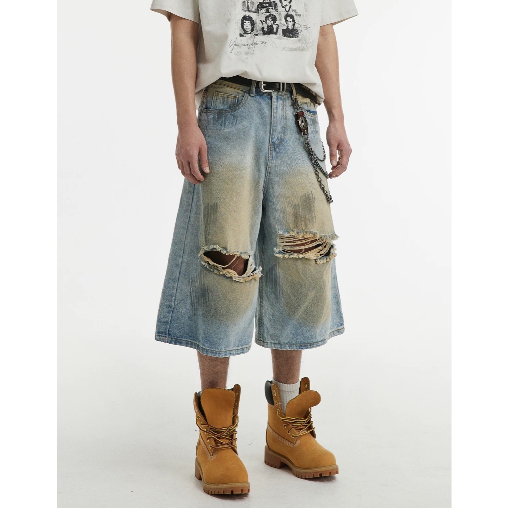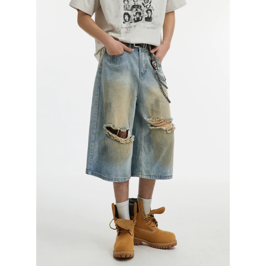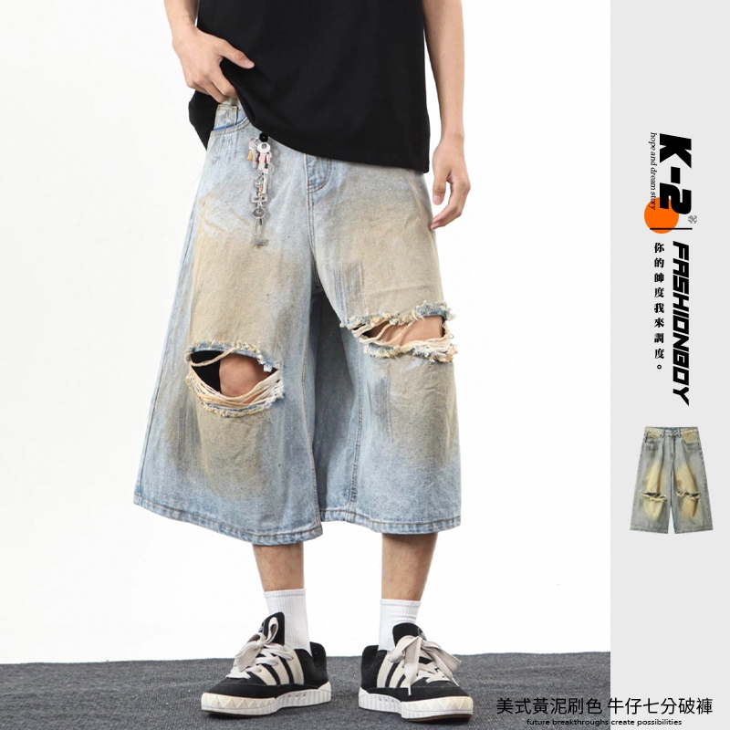 【K-2】CITYBOY 美式復古 黃泥刷色 牛仔七分褲 雙破壞 刷色 牛仔破褲 短褲 七分褲 牛仔褲【JB3030】M|L|XL|XXLK-2 Fashionboy