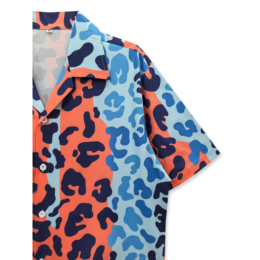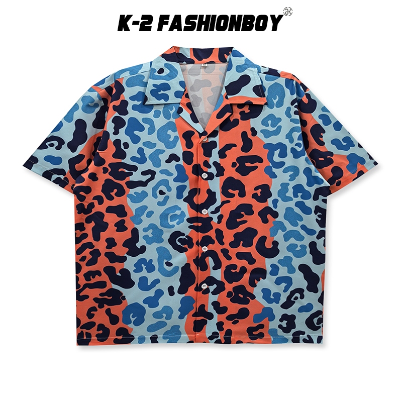 【K-2】色彩拼接 豹紋 動物紋 藍橘配色 狂野 夜店 短袖襯衫 穿搭 個性 小眾 繽紛 焦點 寬鬆【JXK108】M|L|XL|XXLShirtsK-2 Fashionboy
