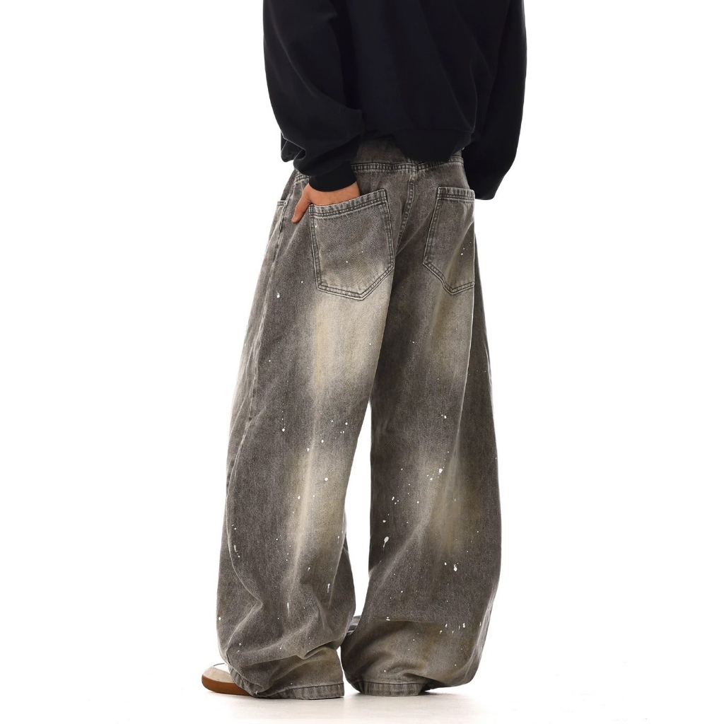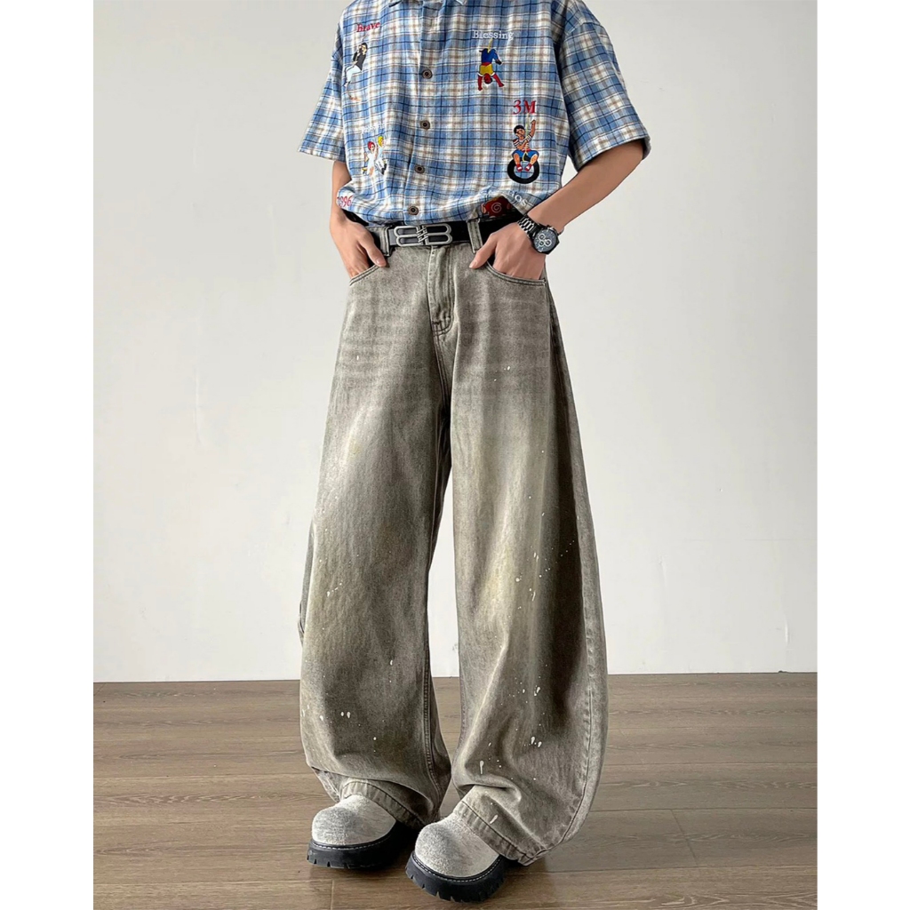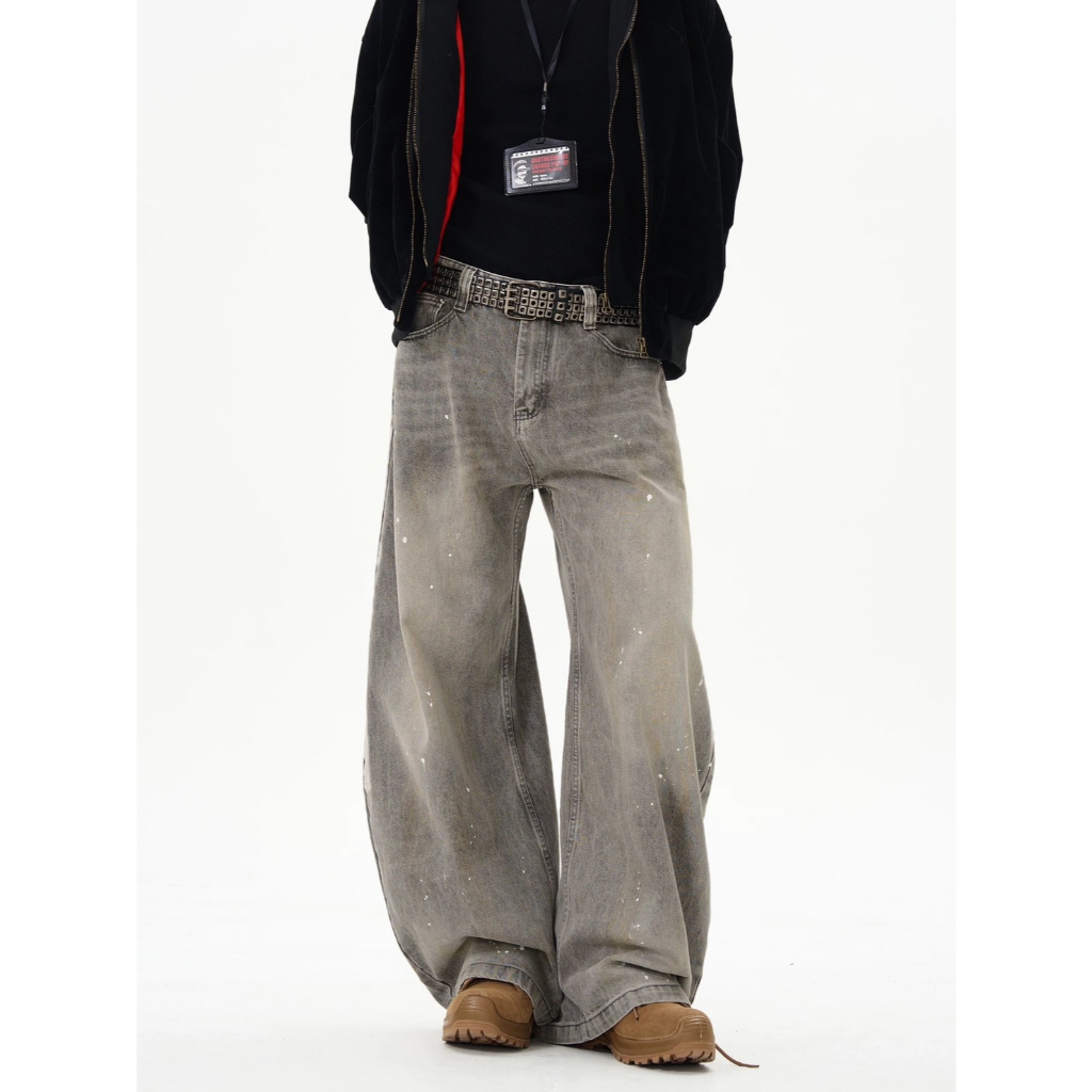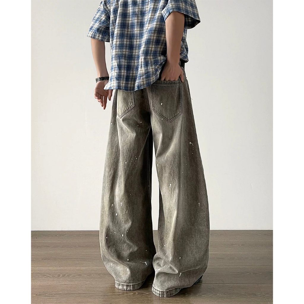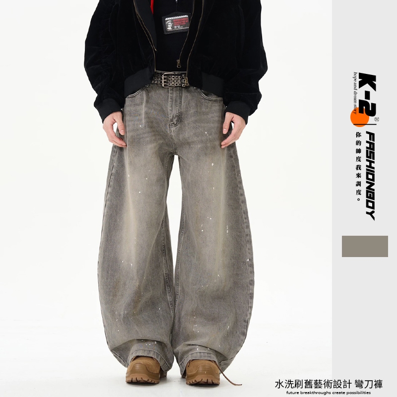 【K-2】水洗刷舊 灰色扎染 繡色暈染 漆點 廓形 寬鬆 闊腿褲 彎刀褲 牛仔褲 長褲 褲子 Y2K K【JN6030】M|L|XL|XXLK-2 Fashionboy