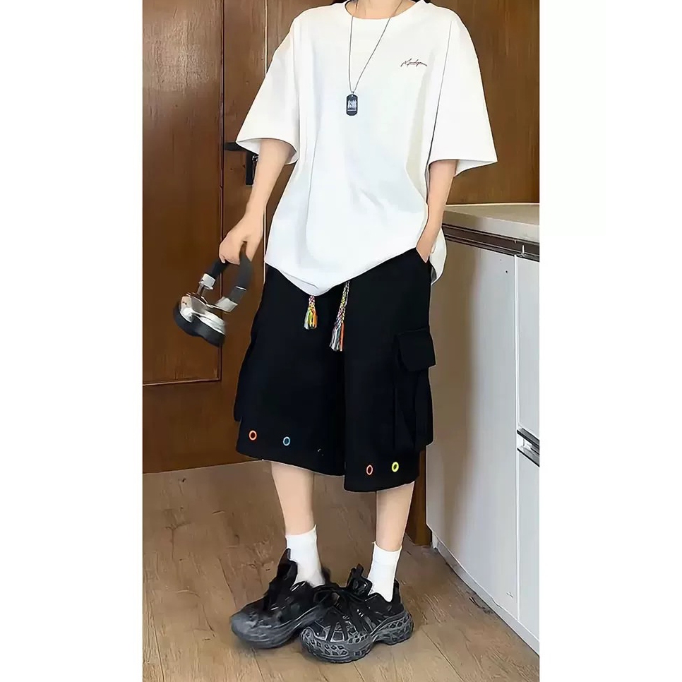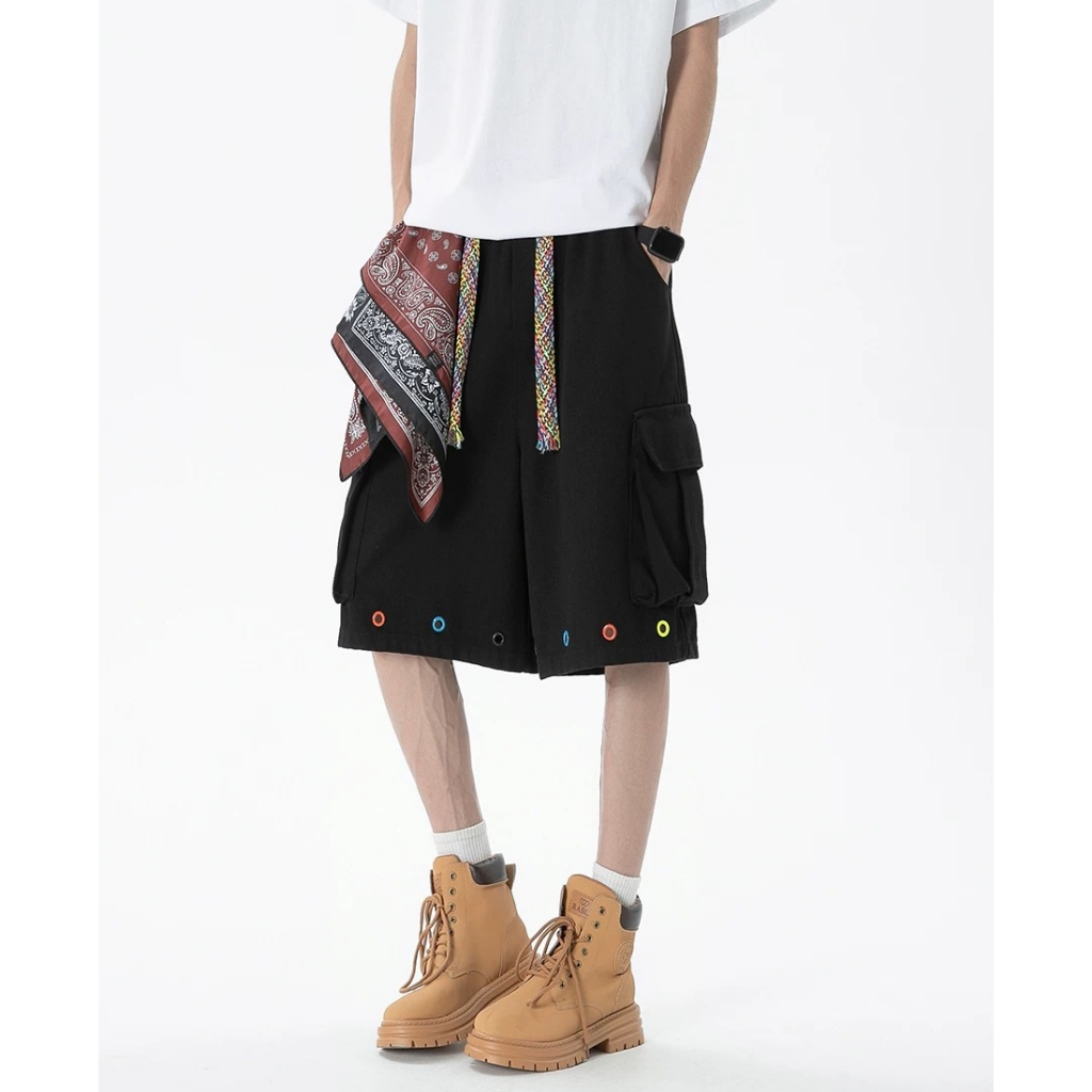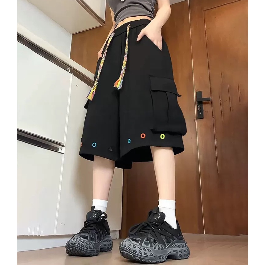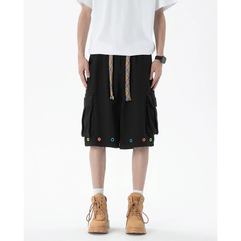 【K-2】美式復古 鬆緊抽繩 彩色麻編 彩虹扣環 五分短褲 休閒短褲 工裝短褲 工作褲 短褲 俏皮 造型短褲【J761】