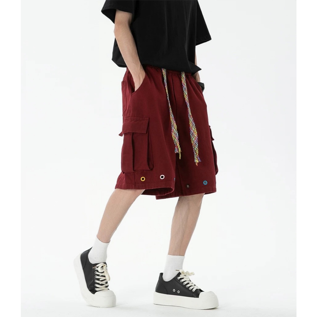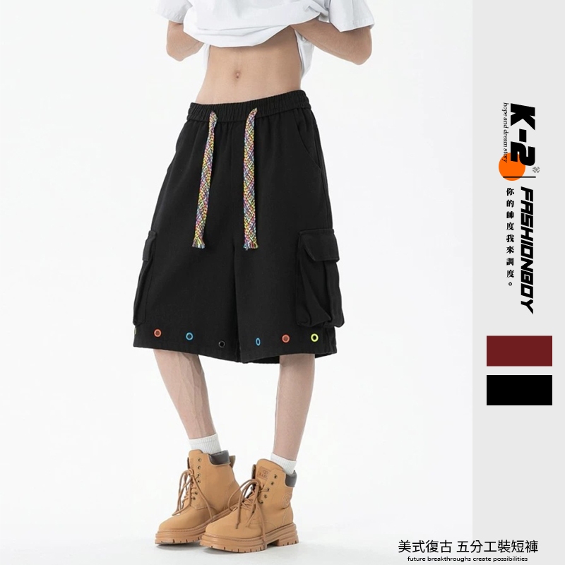 【K-2】美式復古 鬆緊抽繩 彩色麻編 彩虹扣環 五分短褲 休閒短褲 工裝短褲 工作褲 短褲 俏皮 造型短褲【J761】紅色,M|紅色,L|紅色,XL|紅色,XXL|黑色,M|黑色,L|黑色,XL|黑色,XXLK-2 Fashionboy