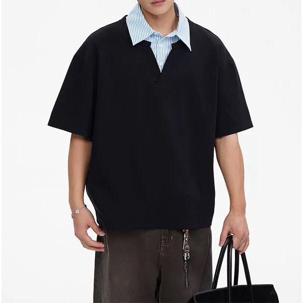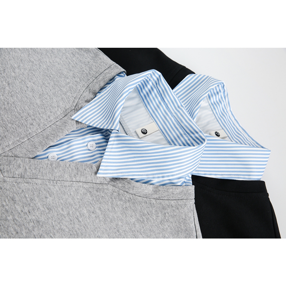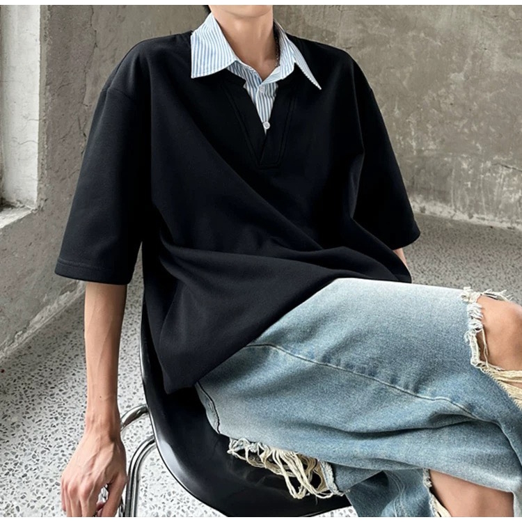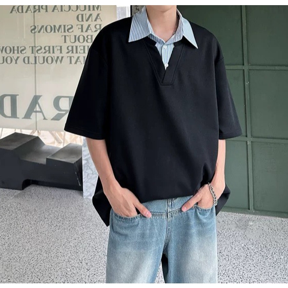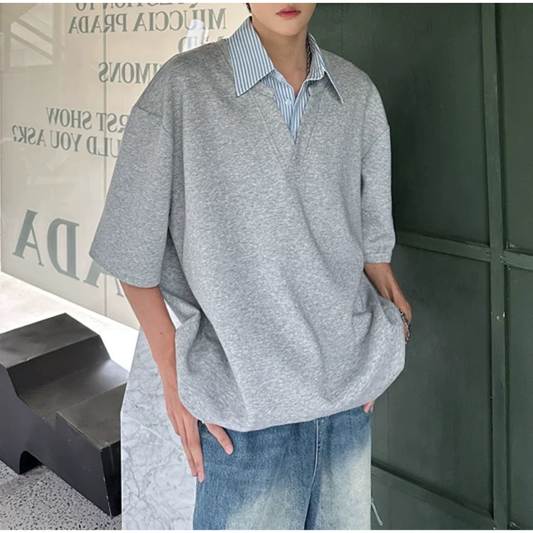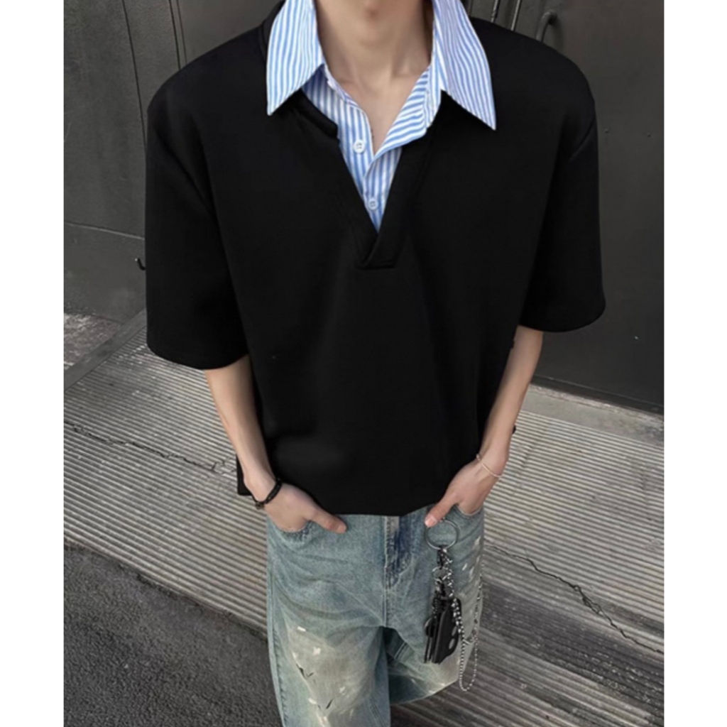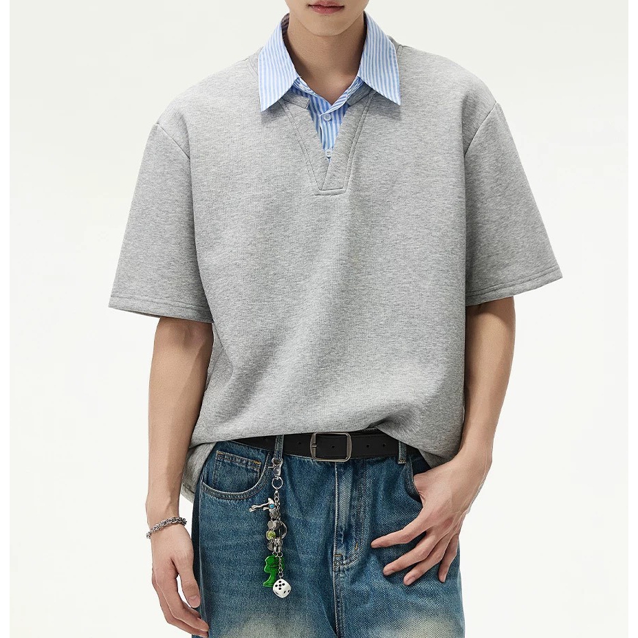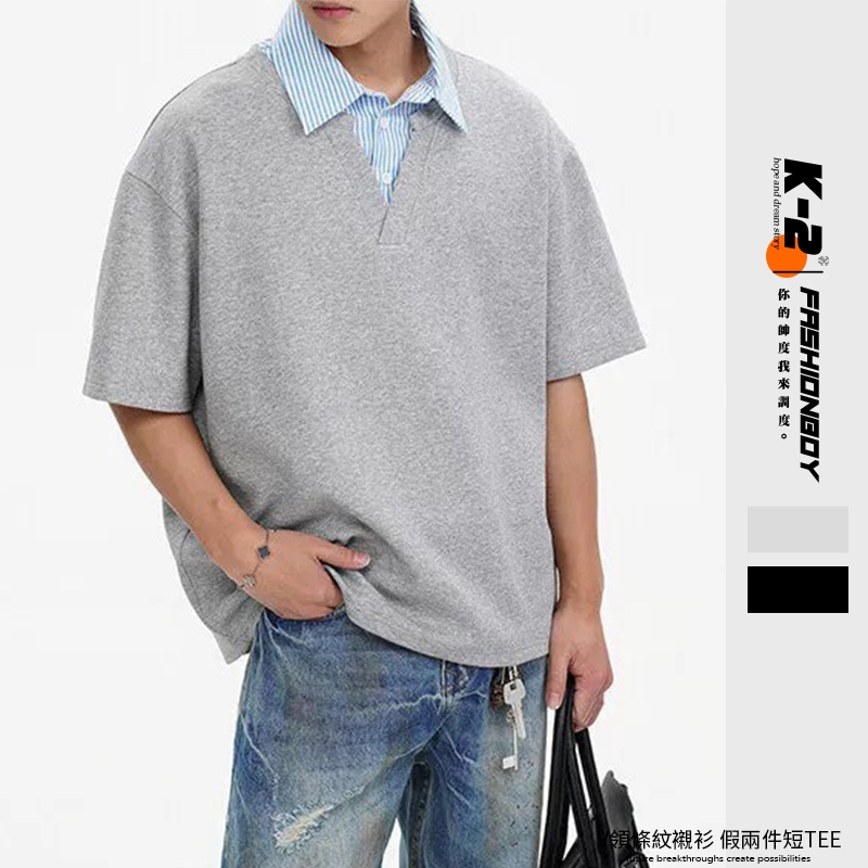 【K-2】假兩件 立領條紋襯衫 拼接 素面短T+襯衫 短袖上衣 穿搭 百搭 文青 休閒 寬鬆【JHT10220】黑,L|黑,XL|黑,XXL|灰,M|灰,L|灰,XL|灰,XXL|黑,MT-ShirtsK-2 Fashionboy