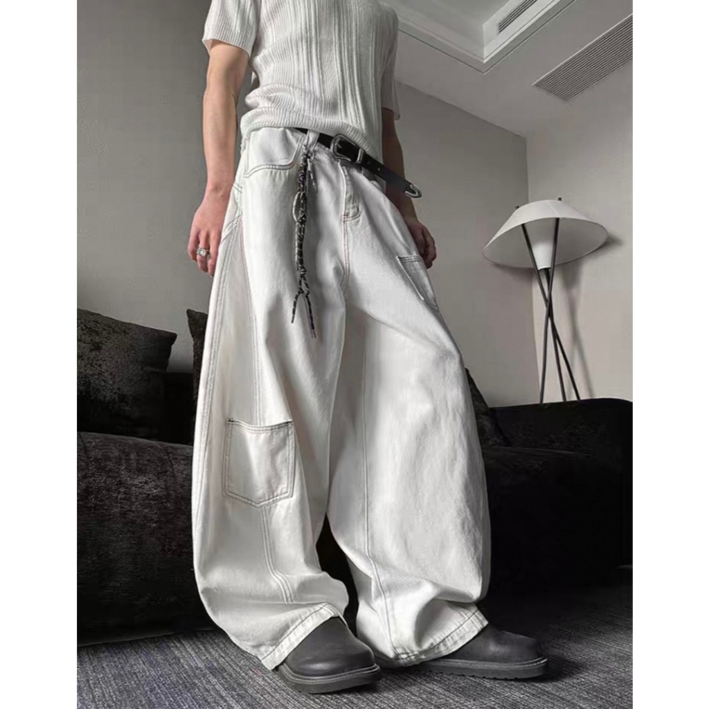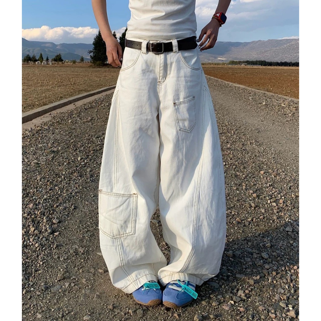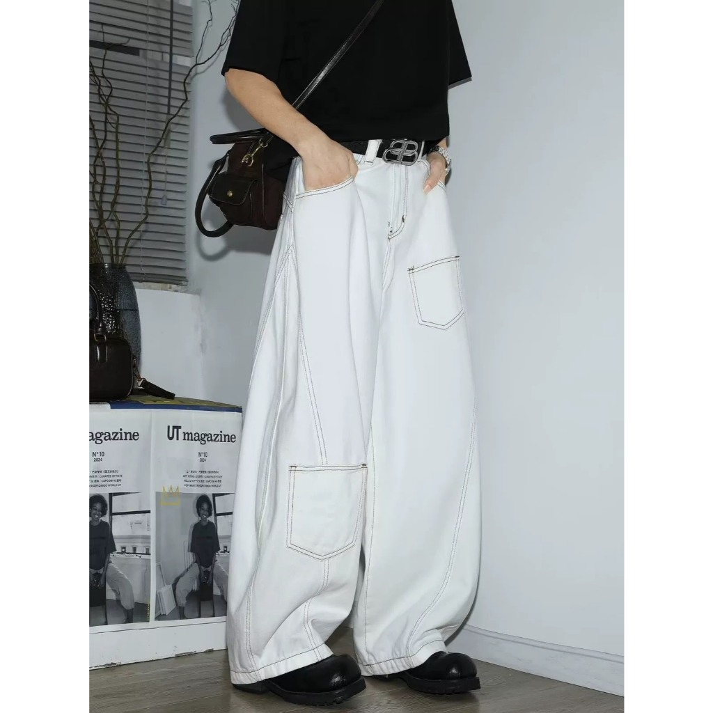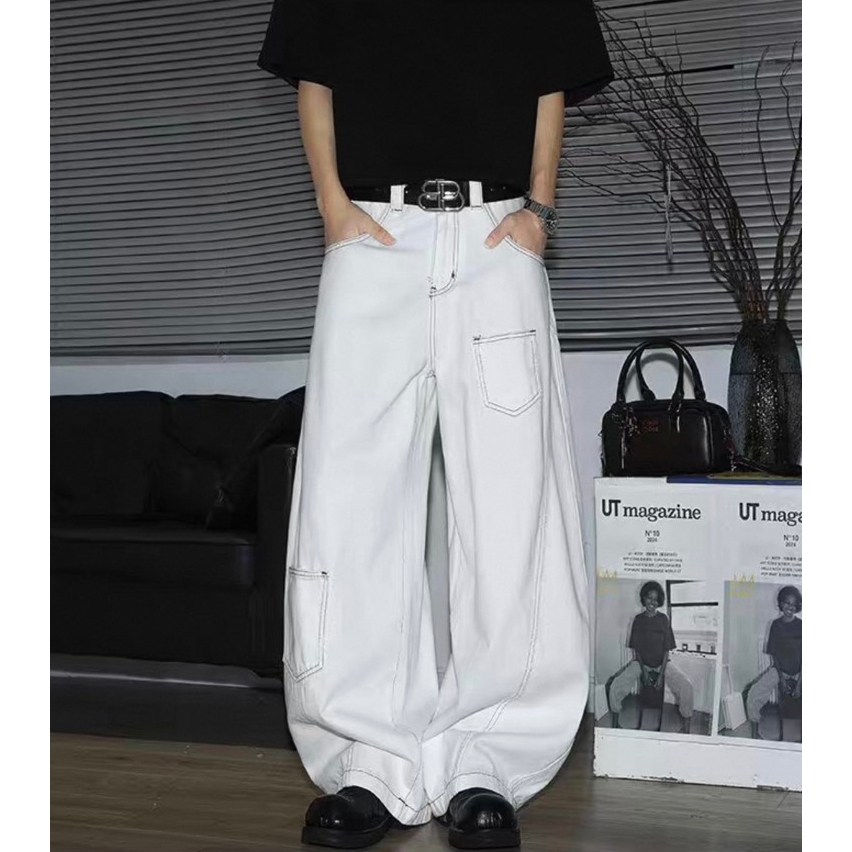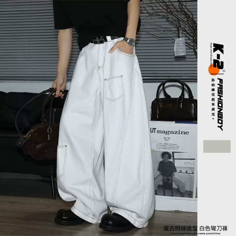 【K-2】美式復古 白色彎刀褲 明線造型 口袋拼接 彎刀褲 白色長褲 闊腿褲 寬褲 牛仔褲 長褲 Y2K【JN6050】M|L|XL|XXLK-2 Fashionboy